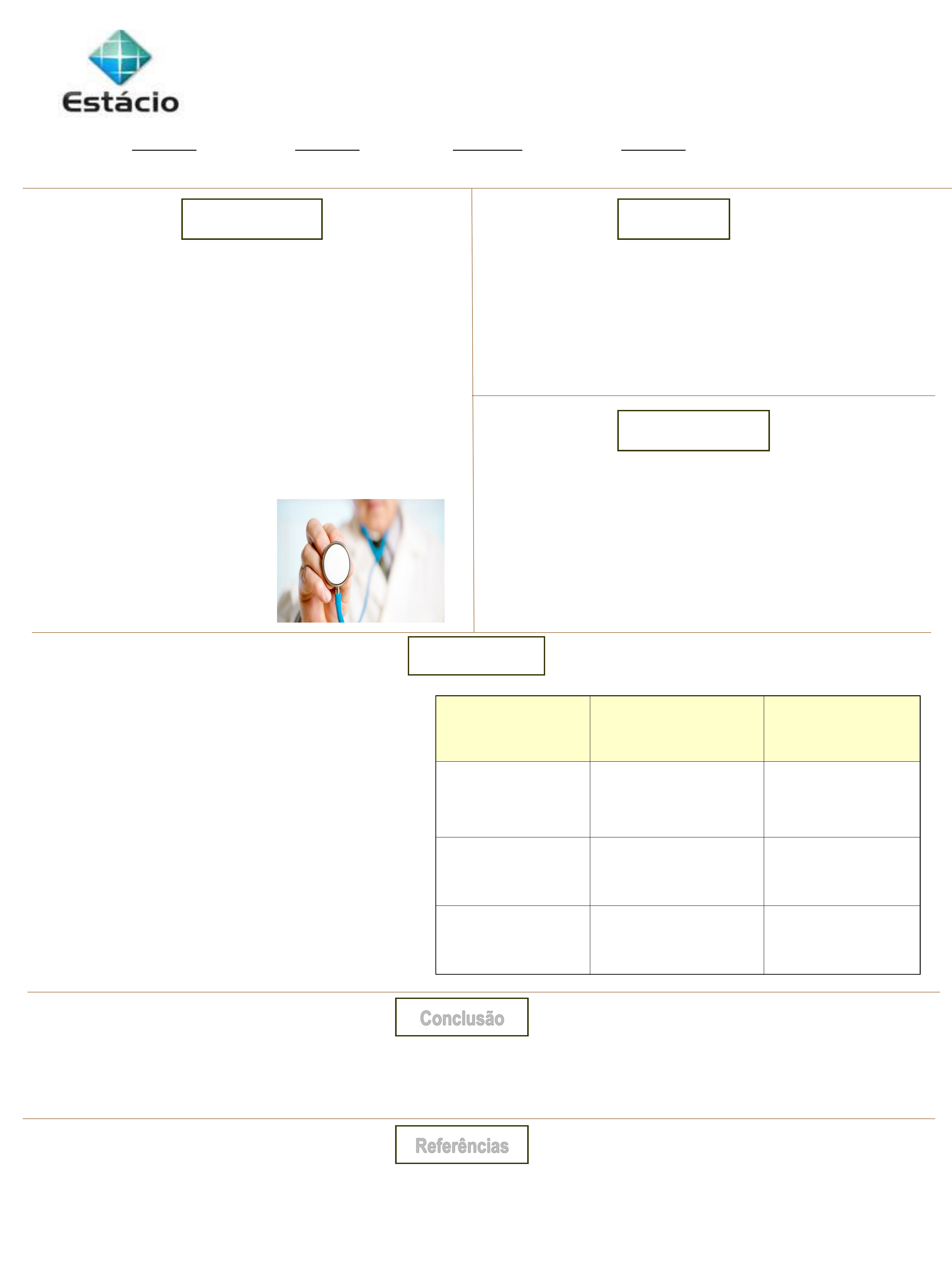 SOBRENOME, Nome Sobrenome1; SOBRENOME, Nome Sobrenome1; SOBRENOME, Nome Sobrenome2; SOBRENOME, Nome Sobrenome2 1-Acadêmico de Enfermagem do Centro Universitário Estácio do Ceará 2-Enfermeiro(a). Docente do curso de Enfermagem do Centro Universitário Estácio do Ceará O que você concluiu do trabalho? A assistência de enfermagem foi eficaz? Estava correta? Contribuiu para a recuperação do paciente? Está de acordo com a literatura? Introdução Objetivos Metodologia Resultados Conclusão ▪ Descrever um pouco sobre a patologia ou tema, sua epidemiologia, conteúdo resumido. Pode acrescentar uma foto relacionada ao tema. Colocar uma citação de um autor sobre o assunto, estilo ABNT (TAMEZ; SILVA, 2011). Finalizar abordando sobre a importância do cuidado de enfermagem. TÍTULO DO ESTUDO DE CASO ▪ Sempre iniciar com verbo no infinitivo (indicando ação). ▪ Pode ter mais de um objetivo. ▪ Fazer em forma de descrição: Tipo de estudo, local onde foi realizado, período, mês e ano, que participou do estudo, como foi realizada a coleta de dados. Mencionar os princípios éticos ▪ Fazer um resumo do Histórico ▪ Achados do exame físico ▪ Outras informações relevantes ▪ TAMEZ; SILVA. Cuidado de Enfermagem. 12ªedição, Ed. Guanabara Koogan, 2011 . ▪. DE – Diagnóstico de Enfermagem. Editora? Ano? DIAGNÓSTICOS DE ENFERMAGEM RESULTADOS ESPERADOS INTERVENÇÕES DE ENFERMAGEM Referências