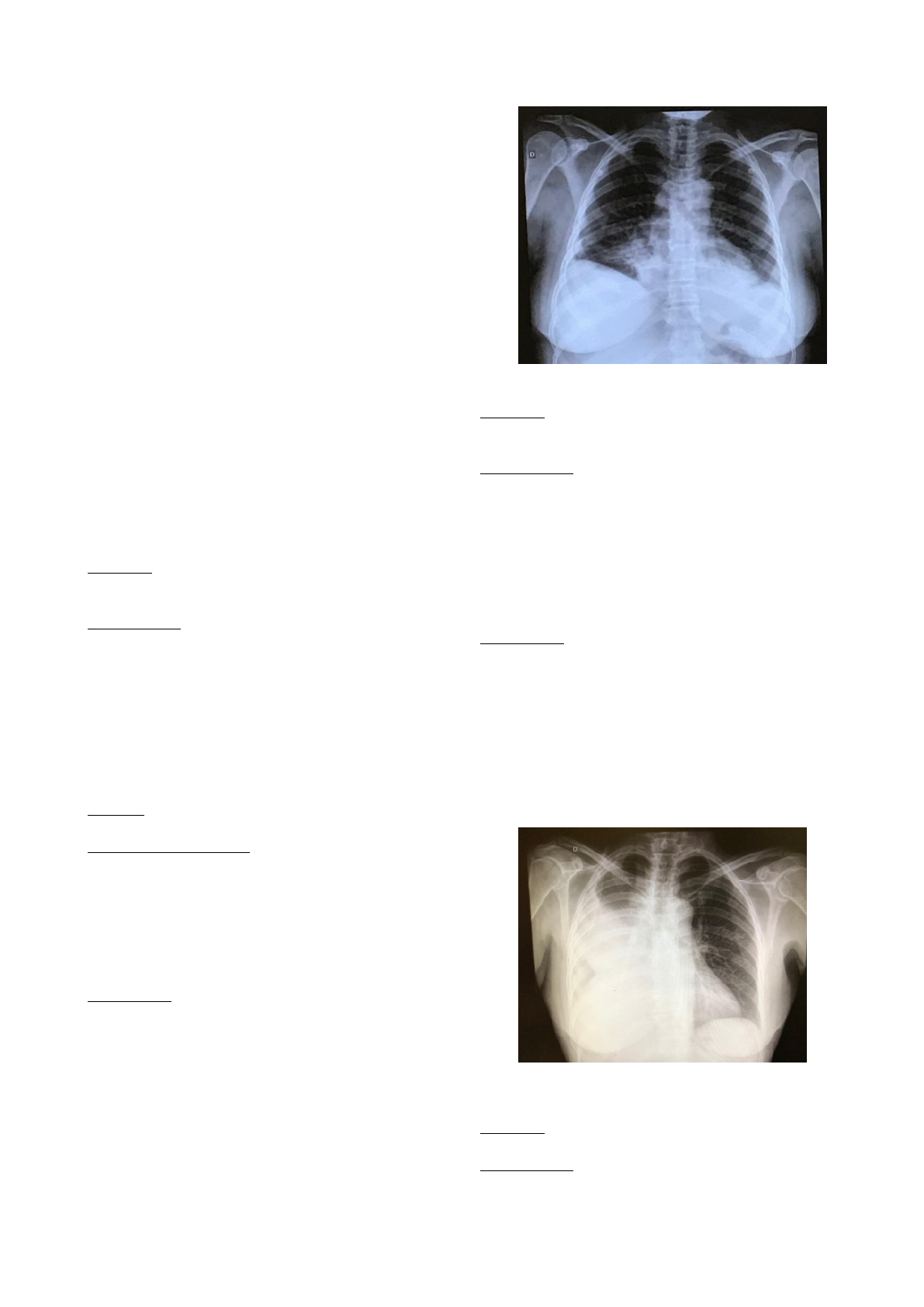 Beatriz Pellizzon Semiologia sábado, 9 de março de 2019 Radiografia tórax + doenças pulmonares -Para que se tenha uma radiografia adequada é necessário de uma penetração adequada, para que se obtenha isto é necessário que seja possível observar um pouco das vértebras. -Quando uma radiografia estiver muito penetrada esta estará mais radiotransparente (no caso de enfisema pulmonar pode ser que atrapalhe para chegar a um diagnóstico mais concreto, pois nos casos de enfisema a radiografia fica mais escura). Para verificar se o paciente está na posição correta é necessário observar como estão sua clavículas, importante para verificar se o paciente não está rodado, avaliar de fora para dentro (partes moles, pele, tecido ósseo e parênquima pulmonar). -Quando aparecer bolha do estômago significa que a radiografia foi realizada com o paciente em pé. -ar = preto -íons = branco (vasos são brancos pois apresentam íons de ferro). 1.Enfisema pulmonar Etiologia: Rompimento dos tabiques; ocorre acumulo de ar e diminuição das trocas gasosas Exame físico: Inspeção: tórax em barril (aumento do diámetro antero-posterior), pode vir acompanhado de tiragem, aumento da frequência e tempo respiratórios Percussão: som hipersonoro Palpação: diminuição da elasticidade e expansibilidade Ausculta: diminuição do murmúrio vesicular e da broncofonia, ausência de ruídos hidroaéreos Causas: -inalação de pós e fumaça Manifestações clínicas: -taquipneia -aumento do tempo expiratório -dispnéia, que se agrava lentamente (inicialmente ocorre apenas aos grandes esforços, mas nas fases avançadas aparece até em repouso, e mais avançado surgem manifestações de insuficiência respiratória) Radiografia: -Alargamento dos espaços intercostais -Rebaixamento e retificação das cúpulas diafragmáticas -Aumento aparente da região supraclavicular 2.Derrame pleural Etiologia: -acumulo de líquido entre as superfícies pleurais parietal e visceral do tórax. Exame físico: Inspeção: expansibilidade diminuída Palpação: expansibilidade diminuída e frêmito toracovocal abolido na área do derrame e aumentado na área do pulmão em contato com o líquido pleural Percussão: som maciço Ausculta: murmúrio vesicular abolido da área do derrame Radiografia: Se tem a presença de líquido na região afetada, este fica em forma de U Neste caso para verificar é necessário realizar o sinal de signoreli, que consiste na percussão da coluna vertebral, na mesma altura na qual se tem o som maciço a coluna também apresentara este som 3.Pneumonia lobar Etiologia: -inflamação do pulmão, além dos brônquios Exame físico: Inspeção: nada importante �1 Beatriz Pellizzon Semiologia sábado, 9 de março de 2019 Palpação: elasticidade e expansibilidade diminuidas Percussão: som maciço e coluna claro pulmonar Ausculta: murmúrio vesicular diminuido, presença de estertor crepitante, aumento da broncofonia, pectoriloquia. Causas: -infecção bacteriana, a bacteria se reproduz no parênquima pulmonar Manifestações clínicas: -tosse -prostração -dispineia -febre Radiografia: 4.Bronquite crônica Etiologia: -inflamação brônquio -pode gerar uma congestão vascular Exame físico: Inspeção: sem alteração Palpação: pode se ter frêmito brônquico Percussão: sem alteração Ausculta: pode se ter sibilos ou em quadros avançados estertor subcrepitante Causas: -tabagismo -ilação crônica de fumaça Manifestações clínicas: -tosse crônica, progressiva, principalmente de manha podendo ser produtiva 5.Bronquiectasia Etiologia: -dilatação permanente dos brônquios e bronquíolos -estágio avançado é a bronquite crônica Exame físico: Inspeção: sem alteração Palpação: sem alteração Percussão: sem alteração Ausculta: presença de estertores subcrepitantes —sinal pactonomonico: subcreptante estará fixo mesmo quando o paciente tossir Causas: -tabagismo -inalação de fumaça Manifestações clínicas: -tosse com secreção bem amarelada -apresenta vômica Exames: Confirmado com tomografia em radiografia se tem o favo de mel 6.Pneumonia lobular (broncopneumonia) Etiologia: -infeção não restrita ao lobo -acomete de modo heterogêneo Exame físico: Inspeção: nada Palpação: elasticidade e expansibilidade diminuidas Percussão: som maciço e coluna claro pulmonar Ausculta: diminuição do murmúrio vesicular, presença de estertor crepitante, aumento da broncofonia Causas: -infecção bacteriana a bacteria irá para o parênquima pulmonar para reproduzir, e células polimorfo nucleares ficam distribuídas de modo heterogêneo. Manifestações clínicas: -dispneia -tosse -expectoração amarelada Radiografia: -zonas radiopacas e menos homogêneas 7.Pneumonia intersticial Etiologia: -tabique aumentado por causa de acumulo de linfócitos e luz do alveolo diminuida Exame físico: Inspeção: nada importante Palpação: nada importante Percussão: som claro pulmonar Ausculta: presença de murmúrio vesicular simétrico Causas: -vírus -bactérias -fungos Manifestações clínicas: -febre -cianose -pode apresentar tosse seca Radiografia: Radiopacidade reticulada �2