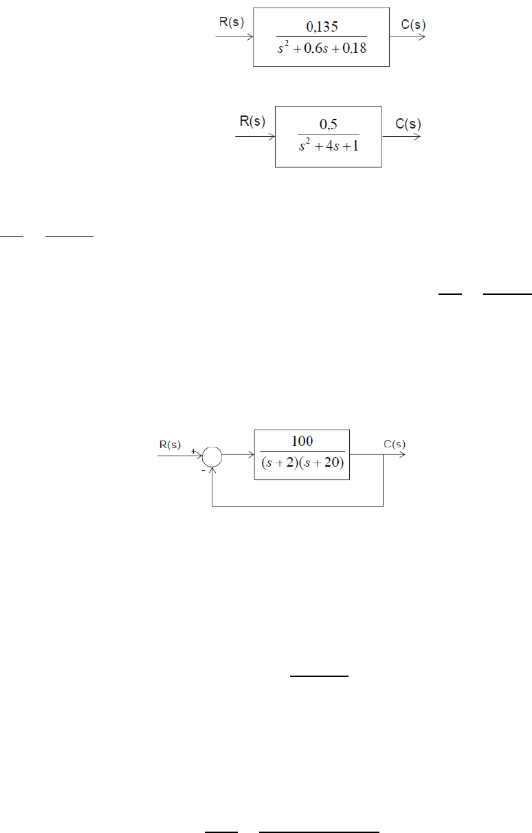 EXERCÍCIOS - RESPOSTA DE SISTEMAS 1) Obtenha a resposta dos sistemas abaixo para as seguintes entradas; a) Degrau de amplitude 2; b) Degrau de amplitude 4; 2) Considere o sistema cuja função de transferência é dada por: �(�) �(�) = � � ���� . Qual a resposta deste sistema para uma entrada em degrau unitário? 3) Considere o sistema cuja função de transferência é dada por: �(�) �(�) = � � ����� . Qual a resposta deste sistema para uma entrada em degrau unitário? 4) Obtenha a resposta do sistema abaixo para um entrada em degrau de amplitude 3. Calcule todos os valores importantes. EXERCÍCIOS DO OGATA 1) Considere a resposta ao degrau unitário do sistema de controle com realimentação unitária cuja função de transferência de malha aberta seja: (�) = 1 �(� + 1) Obtenha o tempo de subida, o tempo de pico, o máximo sobressinal e o tempo de acomodação. 2) Considere o sistema de malha fechada dado por: �(�) �(�) = �� � �� + 2���� + �� � Determine os valores de ζ e wn de modo que o sistema responda a uma entrada em degrau com aproximadamente 5% de sobressinal e com um tempo de acomodação de 2 segundos. (Utilize o critério de 2%). 3) Considere o sistema mostrado na figura (a). O coeficiente de amortecimento do sistema é 0,158 e a freqüência natural não amortecida é 3,16rad/s. Para melhorar a estabilidade relativa, utilizamos a realimentação tacométrica. A figura (b) mostra esse sistema com o tacômetro no ramo de realimentação. Determine o valor de Kh de modo que o coeficiente de amortecimento seja de 0,5. Desenhe as curvas de resposta ao degrau unitário do sistema original e do sistema com realimentação tacométrica. Desenhe também as curvas de erro versus tempo para a resposta à rampa unitária de ambos os sistemas. 4) Considere o sistema mostrado na figura abaixo. Determine o valor de k de modo que o coeficiente de amortecimento ζ seja 0,5. Então, obtenha o tempo de subida tr, o tempo de pico tp, o máximo sobressinal Mp e o tempo de acomodação ts na resposta ao degrau unitário. 5) Utilizando o Matlab, obtenha a resposta ao degrau unitário, à rampa unitária e ao impulso unitário do seguinte sistema: �(�) �(�) = 10 �� + 2� + 10 onde R(s) e C(s) são as transformadas de Laplace da entrada r(t) e da saída c(t), respectivamente.