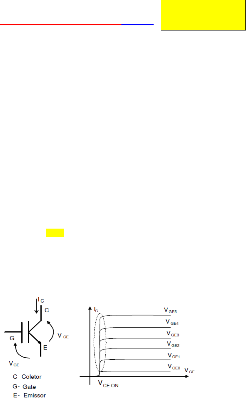 ELPOT – Prof. Milton D Xavier - Página 1 de 24 Chaves de Potência - Rev.2 Daremos sequência ao estudo de algumas chaves de potência analisando as perdas de potência, os seus principais parâmetros, e a adequação de utilização de cada uma delas analisando as variantes Frequência x Tensão x Corrente, e algumas aplicações. Transistores de potência são transistores com altos valores nominais de tensão e corrente. Em Eletrônica de Potência, onde o objetivo principal é o controle de potência, eles são utilizados, principalmente em choppers (conversores DC-DC), e inversores de tensão (DC-AC). O IGBT O IGBT (Isolated Gate Bipolar Transistor) associa a característica de comando dos MOSFET com a característica de condução dos BJT. Nos últimos anos, vem tendo considerável evolução, com o crescimento de sua velocidade de comutação. A figura a seguir mostra o símbolo e a curva característica do IGBT, onde se nota que o componente apresenta os terminais coletor e emissor (como no BJT) e gate (como no Mosfet). A invenção do IGBT, foi induzida pelas limitações típicas de tensão dos MOSFETs e dos BJTs, e de corrente dos MOSFETs. Os IGBTs são próprios para tarefas que envolvem alta tensão e alta corrente. Trabalham com baixas perdas no estado ligado, e requerem circuitos simples de acionamento. Suportam velocidades de chaveamento relativamente altas. ELETRÔ�ICA DE POTÊ�CIA ELPOT – Prof. Milton D Xavier - Página 2 de 24 Módulo de um IGBT: O IGBT apresenta a vantagem de ser comandado por tensão requerendo baixa quantidade de energia do circuito de comando, e em condução tem a vantagem do BJT de baixas tensões VCEon, podendo conduzir elevadas correntes com baixas perdas. O tempo de entrada em condução é maior que o do MOSFET, na ordem de décimos de µs, e no bloqueio surge o fenômeno da corrente de cauda que provoca elevadas perdas de comutação em altas freqüências. A figura a seguir mostra o esquema simplificado do comando com suas principais formas de onda. Tipicamente, VGE entre 12V e 20V resulta em VCEON reduzida, diminuindo as perdas de condução. Os IGBT’s são muito utilizados em conversores isolados e não isolados, inversores e choppers, e em aplicações de controle de corrente de partida de motores . ELPOT – Prof. Milton D Xavier - Página 3 de 24 A tabela a seguir mostra as características principais de uma linha comercial de IGBT’s da International Rectifiers Semiconductors e seus parâmetros importantes a serem especificados e aplicações típicas. tr = tempo de subida td(on) = tempo de atraso na entrada em condução tf = tempo de descida td(off) = tempo de atraso no bloqueio ELPOT – Prof. Milton D Xavier - Página 4 de 24 Mosfet de Potência O Mosfet (Transistor de Efeito de Campo Metal Óxido-Semicondutor), cujo símbolo e curva característica são mostrados na figura a seguir, é um componente totalmente controlado: é comandado por tensão aplicada entre os terminais Gate (G) e Fonte (S). Este dispositivo se aproxima de uma chave fechada (região ôhmica) quando a tensão VGS é adequada, tipicamente de 9 a 15V. E está bloqueado quando esta tensão for inferior ao limite VGSth (4V, típico). Quando em condução, o dispositivo necessita de permanente aplicação da tensão VGS (tensão entre gate e fonte), entretanto não flui corrente no gate, exceto durante as transições ON – OFF e OFF – ON, quando a capacitância de gate é carregada e descarregada. Condições de operação • Condução garantida: tensão VGS > 0 e maior que VTH • Bloqueio garantido: tensão VGS = 0. Operando na região ôhmica, o Mosfet se comporta como uma resistência de valor relativamente baixo entre dreno e fonte (RDSON), sendo assim, é a região de interesse para operação como chave. ELPOT – Prof. Milton D Xavier - Página 5 de 24 Características importantes - O transistor MosFet conduz se for aplicada uma tensão VGS > VTH e cessa a condução se VGS < VTH ; - A tensão de “threshold” VTH é da ordem de uns 3V a 4V; - A impedância de entrada entre gatilho e source é elevada. Desse modo a potência consumida do circuito de comando (gatilho) é pequena. - A máxima tensão VGS é de até +30V (tipicamente, até +20V). Existe um valor máximo de tensão VGS que pode ser aplicada ao MosFet acima da qual ocorre destruição do transistor. Para evitar este problema, é comum utilizar zener entre gate e souce (catodo = gate). – Os tempos de comutação são curtos (da ordem de dezenas de ns), logo este dispositivo possui poucas perdas em aplicações de altas freqüências (acima de 50K Hz). Desse modo podem operar com freqüências mais elevadas; - O parâmetro mais importante do MosFet é a resistencia do canal RDSon. Este parâmetro está relacionado com as perdas de potência por CONDUÇÃO: Pcon ≈ Rds(on) . Id2. ton / T - Uma outra característica importante é a capacitância Cgs intrínseca entre gate e source (ordem de nF), que interfere nas perdas por CHAVEAMENTO. Perdas por chaveamento são as perdas que ocorrem no transistor durante a subida ou descida da tensão VDS, ou seja, enquanto o transistor está ligando ou desligando. Quanto maior for o valor de Cgs, maior será o tempo de subida, acarretando maiores perdas no chaveamento (cruzamento Vds x Id). Quanto menor for o valor ôhmico da resistência Rds , menores serão as perdas por condução. Portanto, o compromisso no projeto será utilizar um transistor MOSFET que tenha menor Rds possível. Este parâmetro se torna ainda mais essencial em baixas tensões de chaveamento, e altas potências de transferência para a carga, onde a corrente Id terá de ser maior. ELPOT – Prof. Milton D Xavier - Página 6 de 24 Como o dispositivo é comandado por tensão, seu circuito de gate é simples e consome pouca energia, como mostra o esquema e as formas de onda da figura a seguir. Cabe destacar que em qualquer Mosfet existe um diodo intrínseco entre os term