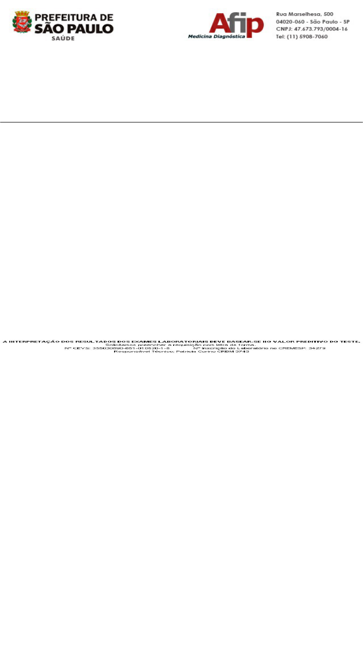 O.S. (Pedido) : 060-18454-14194 (1802851747) Data/Hora : 10/07/2018 - 13:41 Nome : ANGELICA APARECIDA DA SILVA THEOBALDO Código CNS: : 80144045349296211120 Nascimento/Sexo :17/02/1989 - F Convênio : 20023 PMSP CENTRO OESTE Idade : 29 anos, 4 meses Unidade : 06013 BUTANTA - UBS REAL PQ PAULO M.ALBERNAZFILHO RG : Médico : JULIANA GONCALVES FIDELIS (COREN 169610 SP) RESULTADOS Página : 001/006 Dosagem serica de TSH - Hormonio Tireoestimulante 1,24 uIU/mL Material: Soro Metodo: Quimioluminescencia Valor de referência: RN : Ate 39,00 uIU/mL 2a semana a 1 mes: 0,34 a 16,00 uIU/mL 1 mes a 5 anos : 0,34 a 9,00 uIU/mL 6 a 18 anos : 0,34 a 6,00 uIU/mL Adultos : 0,34 a 5,60 uIU/mL Gestantes 1o trimestre: 0,1 a 2,5 uIU/mL 2o trimestre: 0,2 a 3,0 uIU/mL 3o trimestre: 0,3 a 3,0 uIU/mL Ref: De Groot L, et al. Management of thyroid dysfunction during pregnancy and postpartum: an Endocrine Society clinical practice guideline. J Clin Endocrinol Metab. 2012 Aug;97(8):2543-65. Teste de terceira geracao (HYPERsensitive hTSH) Data coleta: 10/07/2018 Data liberação 10/07/2018 às 18:53 Exame liberado por Thais Pavan Basseto CRBio: 64592/01D Responsavel medico: Dra. Glais Libanori - CRM 44432 ASSINATURA DIGITAL F9C4D846F7EFE695F3284179CB O.S. (Pedido) : 060-18454-14194 (1802851747) Data/Hora : 10/07/2018 - 13:41 Nome : ANGELICA APARECIDA DA SILVA THEOBALDO Código CNS: : 80144045349296211120 Nascimento/Sexo :17/02/1989 - F Convênio : 20023 PMSP CENTRO OESTE Idade : 29 anos, 4 meses Unidade : 06013 BUTANTA - UBS REAL PQ PAULO M.ALBERNAZFILHO RG : Médico : JULIANA GONCALVES FIDELIS (COREN 169610 SP) RESULTADOS Página : 002/006 Dosagem serica de T4 Livre - Tiroxina Fracao Livre 0,83 ng/dL Material: Soro Metodo: Quimioluminescencia Valor de referência: 0,54 a 1,60 ng/dL Nota: De acordo com diretriz da National Academy of Clinical Biochemists (NACB) em estudo realizado no Access Beckman Coulter, 95% da populacao estudada o limite inferior de referencia foi de 0,54 a 0,67 ng/dL Data coleta: 10/07/2018 Data liberação 10/07/2018 às 18:38 Exame liberado por Thais Pavan Basseto CRBio: 64592/01D Responsavel medico: Dra. Glais Libanori - CRM 44432 ASSINATURA DIGITAL F9C4D846F7EFE695F3284179CB O.S. (Pedido) : 060-18454-14194 (1802851747) Data/Hora : 10/07/2018 - 13:41 Nome : ANGELICA APARECIDA DA SILVA THEOBALDO Código CNS: : 80144045349296211120 Nascimento/Sexo :17/02/1989 - F Convênio : 20023 PMSP CENTRO OESTE Idade : 29 anos, 4 meses Unidade : 06013 BUTANTA - UBS REAL PQ PAULO M.ALBERNAZFILHO RG : Médico : JULIANA GONCALVES FIDELIS (COREN 169610 SP) RESULTADOS Página : 003/006 Dosagem serica de LH - Hormonio Luteinizante 2,49 mIU/mL Material: Soro Metodo: Quimioluminescencia Valor de referência: Masculino = 1,24 a 8,62 muI/mL Feminino: Folicular = 2,12 a 10,89 muI/mL Pico = 19,18 a 103,00 muI/mL Gestante = < 1,50 muI/ml F.Lutea = 1,20 a 12,86 muI/mL Pos-Menopausa = 10,87 a 58,64 muI/mL Criancas = < 6,00 muI/mL Data coleta: 10/07/2018 Data liberação 16/07/2018 às 06:03 Exame liberado por Thais Pavan Basseto CRBio: 64592/01D Exame assinado por Dr. Fabio De Souza Modesto - CRBM 12753 Responsavel medico: Dra. Glais Libanori - CRM 44432 ASSINATURA DIGITAL F9C4D846F7EFE695F3284179CB O.S. (Pedido) : 060-18454-14194 (1802851747) Data/Hora : 10/07/2018 - 13:41 Nome : ANGELICA APARECIDA DA SILVA THEOBALDO Código CNS: : 80144045349296211120 Nascimento/Sexo :17/02/1989 - F Convênio : 20023 PMSP CENTRO OESTE Idade : 29 anos, 4 meses Unidade : 06013 BUTANTA - UBS REAL PQ PAULO M.ALBERNAZFILHO RG : Médico : JULIANA GONCALVES FIDELIS (COREN 169610 SP) RESULTADOS Página : 004/006 Dosagem serica de FSH - Hormonio Foliculo Estimulante 5,74 mUI/mL Material: Soro Metodo: Quimioluminescencia Valor de referência: Masculino = 1,27 a 19,26 muI/mL Feminino: Folicular = 3,85 a 8,78 muI/mL Pico = 4,54 a 22,51 muI/mL F.Lutea = 1,79 a 5,12 muI/mL Pos-Menopausa = 16,74 a 113,59 muI/mL Gestante = < 0,30 muI/mL Criancas > 2¦ = inferior a 2,5 muI/mL Data coleta: 10/07/2018 Data liberação 16/07/2018 às 06:03 Exame liberado por Thais Pavan Basseto CRBio: 64592/01D Exame assinado por Dr. Fabio De Souza Modesto - CRBM 12753 Responsavel medico: Dra. Glais Libanori - CRM 44432 ASSINATURA DIGITAL F9C4D846F7EFE695F3284179CB O.S. (Pedido) : 060-18454-14194 (1802851747) Data/Hora : 10/07/2018 - 13:41 Nome : ANGELICA APARECIDA DA SILVA THEOBALDO Código CNS: : 80144045349296211120 Nascimento/Sexo :17/02/1989 - F Convênio : 20023 PMSP CENTRO OESTE Idade : 29 anos, 4 meses Unidade : 06013 BUTANTA - UBS REAL PQ PAULO M.ALBERNAZFILHO RG : Médico : JULIANA GONCALVES FIDELIS (COREN 169610 SP) RESULTADOS Página : 005/006 Dosagem serica de Progesterona < 0,10 ng/mL Material: Soro Metodo: Quimioluminescencia Valor de referência: Masculino = 0,10 a 0,84 ng/mL Feminino: Folicular = 0,31 a 1,52 ng/mL F.Lutea = 5,16 a 18,56 ng/mL Pos Menopausa = 0,08 a 0,78 ng/mL Gravidez Primeiro Semestre: 4,73 a 50,74 ng/mL Segundo Semestre: 19,41 a 45,30 ng/mL Data coleta: 10/07/2018 Data liberação 16/07/2018 às 06:03 Exame liberado por Thais Pavan Basseto CRBio: 64592/01D Exame assinado por Dr. Fabio De Souza Modesto - CRBM 12753 Responsavel medico: Dra. Glais Libanori - CRM 44432 ASSINATURA DIGITAL F9C4D846F7EFE695F3284179CB O.S. (Pedido) : 060-18454-14194 (1802851747) Data/Hora : 10/07/2018 - 13:41 Nome : ANGELICA APARECIDA DA SILVA THEOBALDO Código CNS: : 80144045349296211120 Nascimento/Sexo :17/02/1989 - F Convênio : 20023 PMSP CENTRO OESTE Idade : 29 anos, 4 meses Unidade : 06013 BUTANTA - UBS REAL PQ PAULO M.ALBERNAZFILHO RG : Médico : JULIANA GONCALVES FIDELIS (COREN 169610 SP) RESULTADOS Página : 006/006 Dosagem serica de E2 - Estradiol 26,0 pg/mL Material: Soro Metodo: Quimioluminescencia Valor de referência: Masculino : < 75,0 pg/mL Feminino: F.Folicular : 24,0 a 114,0 pg/mL Pico : 62,0 a 534,0 pg/mL F.Lutea : 80,0 a 273,0 pg/mL Pos-Menop. : < 88,0 pg/mL Data coleta: 10/07/2018 Data liberação 10/07/2018 às 18:38 Exame liberado por Thai