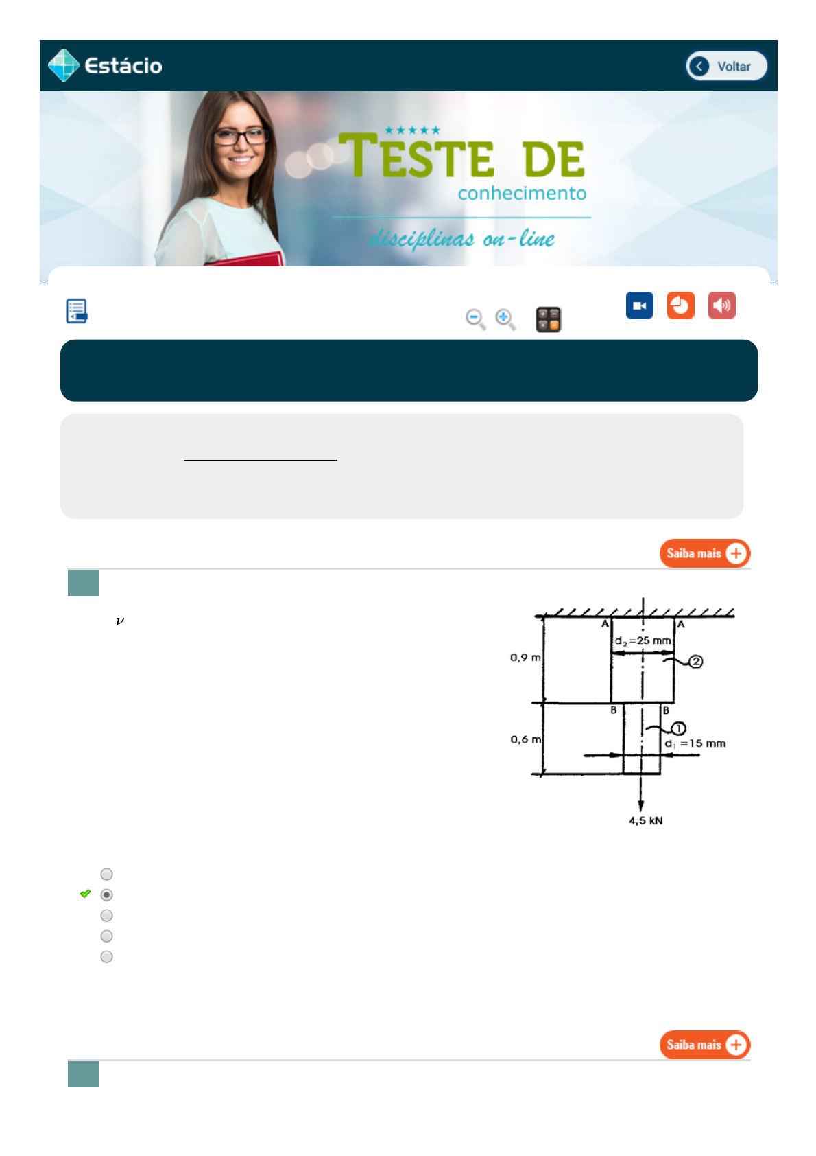 07/10/2019 EPS estacio.webaula.com.br/Classroom/index.html?id=2216601&courseId=1873&classId=1224048&topicId=0&enableForum=S&enableMessage=S&… 1/5 Considerando a situação das duas barras de aço (E=200 Gpa e =0,3) da figura, determine, desprezando o efeito do peso próprio, a deformação longitudinal de cada barra O conjunto abaixo consiste de um tubo de alumínio AB tendo uma área de 400 mm². Uma haste de aço de diâmetro de 10 mm é conectada ao tubo AB por uma arruela e uma RESISTÊNCIA DOS MATERIAIS I CCE0510_A8_201708262891_V1 Lupa Calc. Vídeo PPT MP3 Aluno: RAMON PEDRO JORGE FERREIRA Matr.: 201708262891 Disc.: RES. DOS MATERIAIS I 2019.2 - F (GT) / EX Prezado (a) Aluno(a), Você fará agora seu TESTE DE CONHECIMENTO! Lembre-se que este exercício é opcional, mas não valerá ponto para sua avaliação. O mesmo será composto de questões de múltipla escolha. Após responde cada questão, você terá acesso ao gabarito comentado e/ou à explicação da mesma. Aproveite para se familiarizar com este modelo de questões que será usado na sua AV e AVS. 1. 0,0000121 e 0,000065 0,000121 e 0,00065 0,0121 e 0,065 1,21% e 0,65% 0,00121 e 0,0065 2. ν 07/10/2019 EPS estacio.webaula.com.br/Classroom/index.html?id=2216601&courseId=1873&classId=1224048&topicId=0&enableForum=S&enableMessage=S&… 2/5 porca em B. Se uma força de 50 kN é aplicada na haste, determine o deslocamento na extremidade C. Eaço = 200 GPa e Eal = 70 GPa. Considerando a situação das duas barras de aço (E=210 GPa e =0,3) da figura ao lado, determine, desprezando o efeito do peso próprio, o comprimento total do conjunto 5,62 mm 6,62 mm 2,62 mm 4,62 mm 3,62 mm Gabarito Coment. 3. 1500,112 mm 1500,0112 1500,056 ν 07/10/2019 EPS estacio.webaula.com.br/Classroom/index.html?id=2216601&courseId=1873&classId=1224048&topicId=0&enableForum=S&enableMessage=S&… 3/5 Afigura abaixo mostra uma placa que está presa à base por meio de 6 parafusos de aço. A tensão de cisalhamento última do aço é de 300 MPa. Utilizando-se um coeficiente de segurança de 3 determine o diâmetro mínimo do parafuso a ser usado. Considere o valor da força axial igual a 60 kN. Considerando a situação das duas barras de aço (E=200 GPa e =0,3) da figura, determine, desprezando o efeito do peso próprio, o alongamento de cada barra. 1500,56 1505,6mm Gabarito Coment. 4. o diâmetro é 11,28 mm o diâmetro é 0,28 mm o diâmetro é 22,57 mm o diâmetro é 139,24 mm o diâmetro é 1,28 mm Explicação: 5. ν 07/10/2019 EPS estacio.webaula.com.br/Classroom/index.html?id=2216601&courseId=1873&classId=1224048&topicId=0&enableForum=S&enableMessage=S&… 4/5 Uma barra constituída por uma liga de aço 1040, com diâmetro 2 cm e comprimento 2 m é submetida à tração por uma força de 100 kN e sofre um alongamento absoluto de 3 mm. Determinar o módulo de elasticidade do material da barra (em GPa), considerando válida a Lei de Hooke. Um corpo sem solicitação de carga apresenta um comprimento igual a 20 cm. Aplicando-se uma carga de tração de 1.000 kgf passa a ter um comprimento igual a 24 cm. Determinar a deformação longitudinal absoluta e a percentual. A chapa retangular está subme�da a deformação mostrada pela linha tracejada. Determine a deformação por cisalhamento média ϒxy da chapa. 0,073 mm e 0,039 mm 0,73 e 0,39 mm 7,3 mm e 3,9 mm 0,146 e 0,78 mm 1,46 e 0,78 mm Gabarito Coment. 6. 153,35 GPa 212,31 GPa 5,3 GPa 21,23 GPa 212,31 MPa 7. 4 cm e 20% 4 cm e 0,2 24 cm e 20% 4 cm e 0,2% 24 cm e 0,2% 8. 07/10/2019 EPS estacio.webaula.com.br/Classroom/index.html?id=2216601&courseId=1873&classId=1224048&topicId=0&enableForum=S&enableMessage=S&… 5/5 ϒxy = - 0,29 rad ϒxy = 0,0029 rad ϒxy = - 0,0029 rad ϒxy = - 0,029 rad ϒxy = 0,29 rad Legenda: Questão não respondida Questão não gravada Questão gravada Exercício inciado em 07/10/2019 15:31:56.