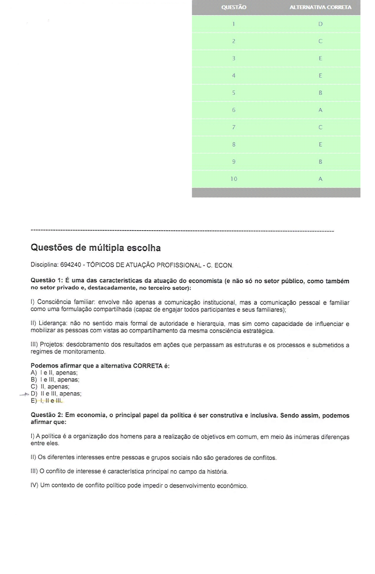 4 E5 — à;5 'ª' ? ________________________________________________________________ r: ______________________________ Questões de múltipla escolha Disciplina: 694240 — TÓPICOS DE ATUAÇÃO PROFISSIONAL -— C. ECON, Questão 1: É uma das caracteristicas da atuação do economista (e não só no setor público, como também no setor privado e, destacadamente, no terceiro setor): i) Consciencia familiar: envolve não apenas a comunicação institucional, mas a comunicação pessoal e familiar como uma formulação compartilhada (capaz de engajar todos participantes e seus familiares); 2!) Liderança: não no sentido mais formal de autoridade e hierarquia. mas sim como capacidade de influenciar e mobilizar as pessoas com vistas ao compartilhamento da mesma consciência estratégica. ill) Projetos: desdobramento dos resultados em ações que perpassam as estruturas e os processos e submetidos a regimes de monitoramento. Podemos afirmar que a alternativa CORRETA é: A) i e li, apenas; B) le Iii, apenas; C) II, apenas; ., D) II e Iii, apenas; E) I, II e ill. Questão 2: Em economia, o principal papel da política é ser construtiva e inclusiva. Sendo assim, podemos afirmar que: I) A política é a organização dos homens para a realização de objetivos em comum. em meio às inúmeras diferenças entre eles. ll) Os diferentes interesses entre pessoas e grupos sociais não sao geradores de conflitos. lil) O conflito de interesse é característica principal no campo da historia. IV) Um contexto de conflito político pode impedir o desenvolvimento econômico. Podemos afirmar que a alternativa CORRETA é: A) ie ll, apenas; “,.B) Ie lli, apenas; C) I e IV, apenas; D) III e IV, apenas; E) |, il, lil e tv. Questão 3: Outra maneira de atuação profissional em nível regional do economista é em Organizações Não Governamentais, as chamadas ONGs, entidades privadas sem fins lucrativos que existem sob as formas jurídicas de associação ou fundação. Muitas ONGs operam como a chamada Organização da Sociedade Civil de Interesse Público (Oscip) quando atuam junto a um ou mais organismos públicos, a prefeitura, ao governo do estado ou da federação. As ONGs atuam nas seguintes divisões: |) Assistência sociai, cultura, defesa e conservação do patrimônio histórico e artístico. educação, saúde, segurança aiimentar e nutricional, defesa, preservação e conservação do meio ambiente e promoção do desenvolvimento sustentável. pesquisa científica, desenvolvimento de tecnologias alternativas, modernização de sistemas de gestão, produção e divulgação de informações e conhecimentos técnicos e científicos, promoção da ética, da cidadania, da democracia e dos direitos humanos e em atividades religiosas. II) O profissional que trabalha nessa ocupação, em geral, apresenta características distintas daqueie que opera no mercado privado, pois deve ter uma preocupação não apenas financeira, mas um olhar sobre as carências da população menos favorecidas. Hoje os profissionais são remunerados financeiramente, apesar de ainda existirem profissionais voluntários. lli) Essa área também é conhecida por terceiro setor, justamente por fazer a ponte entre o setor privado e o público. Atualmente, há muitos especialistas em projetos sociais e gestão em terceiro setor. Como em toda área diversificada, nesse segmento e possível encontrar não apenas economistas. mas também sociólogos, cientistas sociais, engenheiros, contadores, administradores ou bacharéis em cursos da area da saúde. O profissional desse segmento deve ter a característica de construir um olhar interdisciplinar sobre a sociedade. Podemos afirmar que a aiternativa CORRETA é: A) Ie II, apenas; B) I e III, apenas; C) II, apenas; D) Ill, apenas; "ª” E) l, II e lli. Questão 4: De acordo com o relatório “O Futuro dos Empregos” (WORLD ECONOMIC FORUM, 2016), a dinâmica econômica e social imposta no bojo da 4ª Revolução lndustriai, com a presença cada vez mais massiva da robótica avançada, automação no transporte, inteligência artiticial e aprendizagem automática, propicia um cenário socioeconômico, geopolítico e demográfico em constante mudança e transmutação. E isso certamente terá efeito sobre o mercado de trabalho, com aparecimento ou desaparecimento de profissões. Algumas profissões têm mais alterações e são as mais afetadas, como os setores da mídia e entretenimento, consumo, saúde e energia. Outras, como as das áreas de finanças, infraestrutura e mobilidade, deverão ter transformações mais profundas nos próximos anos. Diante desse cenário, a certeza é de que as profissões estão se alterando, e muito rapidamente, e isso requer mais flexibilidade e adaptabilidade dos profissionais. De acordo com esse reiatório, as habilidades que um profissional deve ter ou desenvolver são: |) Capacidade de resolver problemas compiexos e Pensamento crítico. ——- ll) Criatividade e Competência para gerir pessoas. lll) Habilidade de coordenar as próprias ações e inteligência emocional. IV) Capacidade de julgamento e de tomada de decisões e Orientação para servir. V) Senso de negociação e Flexibilidade cognitiva. Podemos afirmar que a alternativa CORRETA é: A) |, [| e ill, apenas; B) ll, III e IV, apenas; C) lil. IV e V. apenas; D) ill e V, apenas; —» E) |, ll, lll, lVeV. Questão 5: Deve-se ressaltar que o papel do economista moderno vai além do pensamento individualista, pois e' importante ressaltar a importância da economia para o entendimento e soluções diante de uma sociedade repleta de problemas econômicos e injustiças sociais. Portanto, deve o economista moderno: %) Debruçar-se sobre os problemas sociais, se afastar do mundo onírioo e neutro das teorias, resgatando a ideia de que um mundo melhor para todos somente será possívei com a diminuição substantiva das disparidades sociais. Il) Deve ter uma visão mais abstrata e puramente 