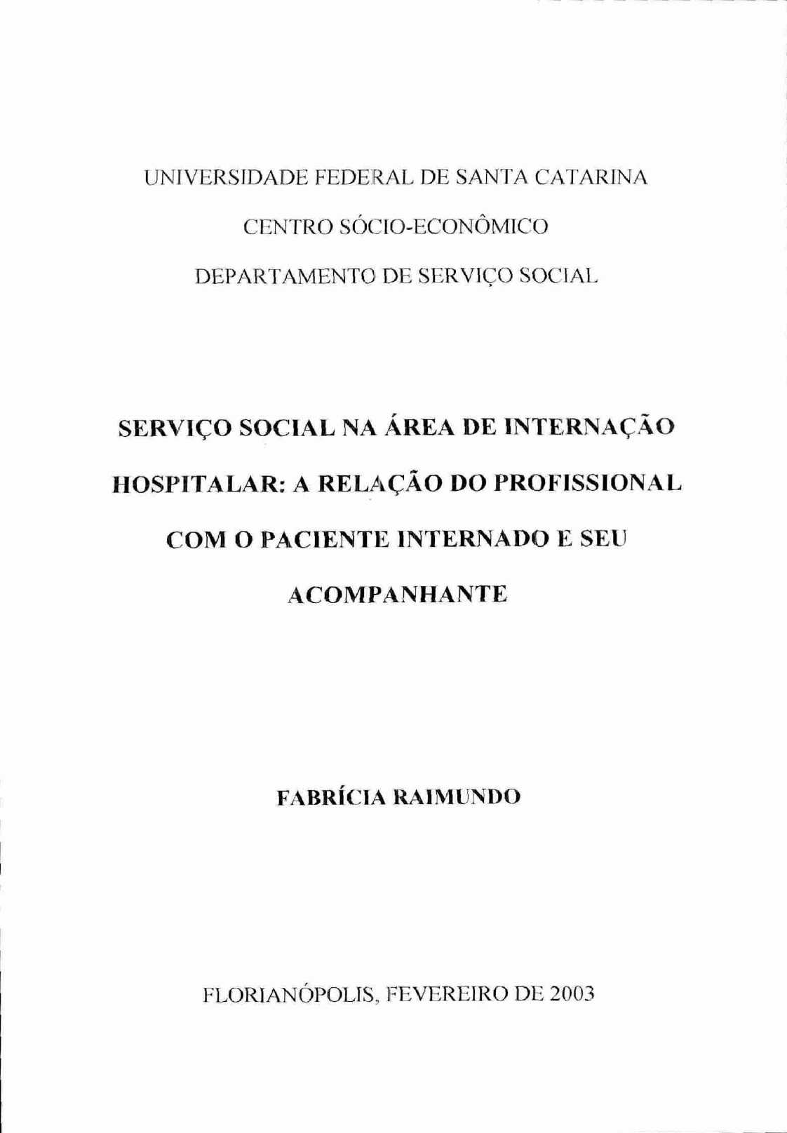 UNIVERSIDADE FEDERAL DE SANTA CATARINA CENTRO SÓCIO-ECONÓMICO DEPARTAMENTO DE SERVIÇO SOCIAL SERVIÇO SOCIAL NA ÁREA DE INTERNAÇÃO HOSPITALAR: A RELAÇÃO DO PROFISSIONAL COM O PACIENTE INTERNADO E SEU ACOMPANHANTE FABRÍCIA RA IMUNDO FLORIANÓPOLIS, FEVEREIRO DE 2003 FABRIC IA RAIMUNDO SERVIÇO SOCIAL NA ÁREA DE INTERNAÇÃO HOSPITALAR: A RELAÇÃO DO PROFISSIONAL COM O PACIENTE INTERNADO E SEU ACOM PANHANTE IA l_ DEFENDIDO E APROVADO Monografia apresentada ao Curso de Serviço Social da Universidade Federal de Santa Catarina, para obtenção do Titulo de Bacharel em Serviço Social. 1 ProAljadstyna Chefe do Depto C5E/tin:. Costa vic Social Orientadora: Pror Magda Duarte dos Anjos Scherer Florianõpolis, fevereiro de 2003. BANCA EXAMINADORA Magda Duarte dos Anjos Scherer Presidente da Banca Luiza Mari Lorenzini Gerber 2° Examinador 41145-41111111.1111.1717eViga do Rosario 3° Examinador Data de Aprovação: 28/02/2003 Acadêmica: Fabricia Raimundo AGRADECIMENTOS Primeiramente quero manifestar minha gratidão a Deus! Aos meus pais Anelita e Nelito e minha irmã Grazi, pelo carinho, amor e paciência que sempre me dedicaram. A toda minha família, que direta ou indiretamente torceram por mim desde o dia que passei no vestibular, em especial a minha tia Lúcia que foi a primeira a me dar noticia. As amigas que fiz durante estes quatro anos de curso, Satnara, Priscila, Gisele e Lorena e todos os meus amigos, no qual prefiro não citar nomes para não correr o risco de esquecer de alguém, obrigada por me apoiarem e pela amizade. professora Magda Duarte dos Anjos Scherer, pela orientação e dedicação neste trabalho. Assistente Social do HU, Luiza Maria Lorenzini Gerber, pela oportunidade e orientação durante o período de meu estágio, e a todos da mesma instituição que me acolheram e me apoiaram de alguma forma. A Nazaré, por aceitar prontamente a participar de minha banca. SUMARIO RESUMO INTRODUÇÃO CAPÍTULO I s I A TRAJETÓRIA DA SAÚDE NO BRASIL CAPÍTULOII ,3 I 0 SERVIÇO SOCIAL NA ÁREA DA SAÚDE ,3 CAPÍTULO III 35 I A RELAÇÃO ASSISTENTE SOCIAL, PACIENTE INTERN ADO E ACOMPANILANTE 37 CONSIDERAÇÕES FINAIS REFERÊNCIAS -n4 ANEXOS RESUMO O presente trabalho tem por objetivo promover a discussão de um tema pouco difundido no Serviço Social, o Serviço Social na area da saúde mais especificamente o Assistente Social na Area hospitalar e a relação do profissional coin o paciente internado e seu acompanhante. Para melhor apresentar o tema a monografia foi dividida em três capitulos. Em seu primeiro capitulo intitulado de; A trajetória da saúde no Brasil, apresento um breve histórico da trajetória da saúde no Brasil até a implantação do atual sistema de saúde o SUS, e as mudanças que ocorreram duranie este periodo. Como a significativa atuação do Assistente Social na área da saúde principalmente em hospitais e as políticas públicas que estes profissionais se utilizam em seu cotidiano lidando com pacientes internados e seus acompanhantes. No segundo capitulo; O Serviço Social na area da saúde apresento um breve histórico da trajetória e criação do Serviço Social em todo o mundo e especialmente no Brasil, e sua evolução que abriu portas para a atuação do profissional em diferentes áreas como a da saúde e todos os obstáculos que o Assistente Social enfrentou ate ser reconhecido como profissional de saúde de nível superior somente em 1997 apesar de já atuar nesta área a vários anos. Finalmente no terceiro e último capitulo; A relação Assistente Social, paciente internado e acompanhante, apresento um pouco da historia dos hospitais para tentar esclarecer de onde vem este estigma do hospital ligado a morte e o medo que as pessoas sentem dele, e também a relação do profissional do Serviço Social que trabalha justamente neste lugar que causa tanto receio nos pacientes internados e seus acompanhantes e as dificuldades e mudanças que enfrentam durante o período da internação. INTRODUÇÃO O tema da presente monografia é resultado de um grande interesse que em mim foi despertado durante meu estágio curricular obrigatório, que realizei no Hospital Universitário junto as Clinicas Médicas I e II (Clinicas de internação) e UTI. No estágio pude vivenciar e participar da realidade do Assistente Social e seu relacionamento com os pacientes internados e seus acompanhantes Este trabalho, que desenvolvi atra N és de pesquisa bibliográfica, constitui-se de três capítulos. Tendo corno objetivo principal apresentar uma discussão sobre o Serviço Social na area da saúde, especialmente na internação hospitalar e a relação do profissional com o paciente internado e seu acompanhante. No primeiro capitulo procurei apresentar um breve histórico da trajetória da saúde no Brasil, todos os avanços que foram alcançados até chegar no atual modelo que com todo este processo de mudança abriu uma nova area de atuação para o Serviço Social na saúde pública, principalmente em hospitais onde sua demanda é muito grande, mostrando em especial sua atuação na area de internação. Também procurei mostrar algumas das politicas públicas de saúde destinadas aos pacientes internados e seus acompanhantes, atores do cotidiano do profissional que trabalha nesta area, e que exigem do mesmo um posicionamento firme e esforço frente estas políticas para tentar efetiva-las da melhor forma possível. Procurei abordar corno questão de maior dificuldade de resolução para o profissional que trabalha na area hospitalar de internações a acomodação do acompanhante do paciente internado, pois é assegurado somente o direito de ter acompanhante a pacientes menores de dezoito anos e maiores de sessenta anos. Mesmo existindo leis que asseguram este direito, na maioria das vezes esta não pode ser cumprida, pois não ha estrutura para acomoda-los adequadamente, o que ocasiona uma certa revolta por parte do acompanhante que geralmente acha que 