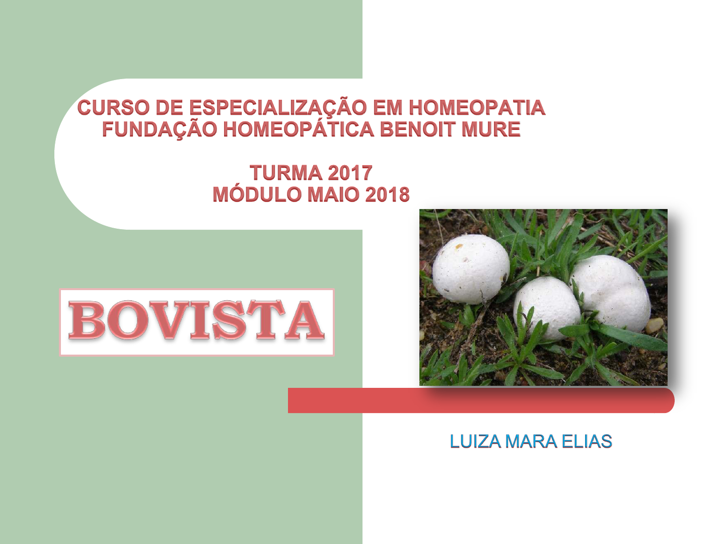 CURSO DE ESPECIALIZAÇÃO EM HOMEOPATIA FUNDAÇÃO HOMEOPÁTICA BENOIT MURE TURMA 2017 MÓDULO MAIO 2018 LUIZA MARA ELIAS BOVISTA BOVISTA Pertencem à família dos fungos Medem aproximadamente 1,5 a 3,5 cm. Possuem aspecto globosos e cor amarelada. Nascem esparsos na grama, amplamente distribuídos. Frutificam durante todo o ano e são comestíveis. BOVISTA Bovista é um gênero de fungos comumente conhecido como o verdadeiro bufa-de-lobo (puffballs). Foi anteriormente classificado dentro da ordem agora obsoleta Lycoperdales, que, após uma reestruturação da taxonomia fúngica causada pela filogenia molecular, foi dividida. As espécies de Bovista são agora colocadas na família Agaricaceae da ordem Agaricales . As espécies Bovista têm uma distribuição coletivamente ampla e são encontradas em grande parte em regiões temperadas do mundo. Diversas espécies têm sido historicamente usadas em preparações homeopáticas. Bovista Bovistaplumbea Classificação científica Reino: Fungos Divisão: Basidiomycota Classe: Agaricomicetos Ordem: Agaricales Família: Agaricaceae Gênero: Bovista Pers. (1794) [1] Espécie de tipo Bovistaplumbea Pers. (1795) Sinônimos [5] Piesmycus Raf. (1808) Piemycus Raf. (1813) Sackea Rostk. (1844) [2] Globaria Quél. (1873) [3] Pseudolycoperdon Velen. (1947) Bufa-de-lobo do gênero Bovista geralmente são comestíveis quando jovens e brancos dentro, mas deve-se tomar cuidado para evitar confusão com Amanitas imaturas e potencialmente mortais. Isso é feito cortando-se os corpos de frutas longitudinalmente para assegurar que eles sejam totalmente brancos e não tenham estruturas internas. USO EM HOMEOPATIA Referência ao gênero apareceu em vários livros do século XIX sobre homeopatia. Richard Hughes escreveu em Um Manual de Farmacodinâmica (1870) "Diz-se que Bovista é indicado, e provou ser curativo em afecções da cabeça caracterizadas por uma sensação como se a cabeça fosse enormemente aumentada em tamanho". Em Lectures on Clinical Materia Medica (1887), EA Farrington afirma que os esporos de Bovista restringem a circulação sanguínea através dos capilares e sugere usos associados com irregularidade menstrual ou trauma. Ele também menciona que Bovista produz alguns sintomas de sufocamento e pode ser útil para remediar a asfixia resultante da inalação de fumaça de carvão. Ainda mais doenças têm sido sugeridas para melhorar com o uso de Bovista, como "constrangimento na fala e ação", " gagueira ou gagueira de crianças", " palpitação após uma refeição", diabetes mellitus , cistos ovarianos e acne. https://en.m.wikipedia.org/wiki/Bovista REINO FUNGI SANKARAN Sensação Vital Invadindo. Erosão. Cavando. Escavando. Escoriando. Corrosivo. Ulcerativo. Penetrando. Expandindo. Espalhando. Força. Controle sobre-humano. Perigo/ladrões. Reação Passiva Sente-se vazio. Oco. Apieda-se de si mesmo. Delirium silencioso. Hemorragia passiva. Reação Ativa Invade. Espalha-se. Força aumentada. Egolatria. Corajoso. Compensação Corajoso diante do perigo e invasão. Palavras chaves Escavando. Invadindo. Erosão. Penetrando. Encolhendo. BOVISTA Miasmas & Medicamentos: Agudo: Muscarinum Malaria: Boletus laricis; Polypurus pinicola Sicótico: Bovista Câncer: Agaricus Tubercular: Ustilago Leproso: Sol-t-ae, Secale cornutum MENTAL (Sintomas patogenéticos) Irritável, toma tudo de forma errada, é facilmente ofendido. Briguenta. Aversão a tudo. Está ausente, tem dificuldades de concentração, atenção. Então, muitas vezes se engana ao utiliza as palavras quando fala ou escreve. Memória fraca. Triste, deprimida, especialmente quando está sozinha. Pensamentos sombrios. Ri e chora alternativamente e de maneira espasmódica. Grande loquacidade, fala sem reservas ou controle. Fonte: "Vijnovsky Homeopática Materia Medica" BOVISTA (Lycoperdon Bovista) SINTOMAS GERAIS Não tolera roupas apertadas, principalmente no epigástrio, abdômen e tórax. Pior: antes e durante a menstruação ou depois; à noite; pela manhã; depois de comer, ao assoar o nariz; comida fria; tempo quente; após o coito; com lua cheia; depois de café e vinho. Melhor: enclinar-se para frente; de dia; comendo; dobrando-se; comidas quente. Secreções muito espessas, filamentosas e aderente de todas as membranas mucosas (Kali Bichr). Diabetes. Tem um inchaço generalizado, embora não muito evidente; utilizando tesouras ou facas deixou uma impressão profunda em seus dedos. Tendência a hemorragias por relaxamento capilar, especialmente à noite, pela manhã e ao menor esforço. Em pessoas que sofrem de erupções pruriginosas por todo o corpo, secas ou não. Em solteironas com palpitações. Transtornos por inalação de gases de combustão de carvão. Asfixia. Grande falta de forças, com fraqueza articular. Ondas de calor com sede intensa. DESEJOS Bebidas alcoólicas, vinho, leite e pão, bebidas frias. SINTOMAS ESPECÍFICOS Sensação de alargamento da cabeça, especialmente na região occipital. Cefaleia expansiva, pior de manhã, ao ar livre e deitado. Vertigem e ss de tontura na cabeça de manhã; quedas, às vezes com perda de consciência momentânea. Vertigem parado, como se tudo estivesse girando. Cefaleia noturna insuportável ao levantar a cabeça. Grande sensibilidade no couro cabeludo ao toque. Queda de cabelo. Escoriações e prurido, pioram de calor. As pálpebras são coladas noite. Olhos sem brilho. As coisas parecem estar mais perto do que eles são realmenente. Paralisia do nervo óptico D com cegueira. Hemiopia vertical. Coceira na orelha que am colocando o dedo. Hippoacusia. Descarga de pus fétido das orelhas. Erupção húmida nas orelhas. Epistaxe no início da manhã ou dormindo, ao espirrar. Narinas escoriadas, com crostas. Obstrução nasal. Secreção nasal muito viscosa, pegajosa, filamentosa. Face muito pálida quando se levanta de manhã. Inchaço do lábio superior, bochecha e nariz. Cantos bucais ulcerados. Vago, olhando fixamente. Dor re