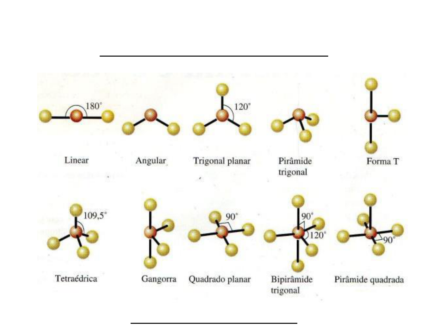 Universidade Federal do Triângulo Mineiro (UFTM) Disciplina: Química Para Engenharia Aula: A forma das moléculas e sua estrutura Profª Rafaela Cristina Sanfelice A forma das moléculas e dos íons - A estrutura de Lewis representa uma localização aproximada dos elétrons ligantes e dos pares isolados em uma molécula. – Não representa corretamente o arranjo espacial dos átomos. - Algumas moléculas simétricas podem ser representadas de forma bastante simples A forma das moléculas e dos íons - Para descrever as formas das moléculas menos simétricas, fornecemos os ângulos de ligações - A forma molecular, assim como os ângulos e comprimentos de ligação, podem ser previstos a partir de cálculos baseados na equação de Schroedinger. Esses cálculos, em alguns casos baseiam-se parcialmente em informações experimentais, e então são denominados de Métodos semi-empíricos. Em outros casos, são previsões puramente teóricas, e então são chamados de Métodos ab initio. O Modelo VSEPR - Para explicarmos os ângulos das ligações químicas e as formas das moléculas precisamos adicionar no modelo de ligação de Lewis, o fato de que regiões de alta concentração eletrônica se repelem. - Isso quer dizer que elétrons ligantes e pares isolados se posicionam tão longe quanto possível um do outro para minimizar a repulsão. - No modelo VSEPR (Valence-shell electron-pair repulsion model), em português Modelo da repulsão por pares de elétrons da camada de valência usamos o átomo central como referência - Ex: Trifluoreto de Boro O Modelo VSEPR - Na molécula de BF4 existem três pares de elétrons ligantes presos ao átomo central e não há presença de pares isolados: - A formação da molécula de metano ocorre de forma similar: Estrutura Trigonal Planar Ângulo de 120º Estrutura Tetraédrica Ângulo de 109,5º O Modelo VSEPR - Quando utilizamos o Modelo VSEPR não distinguimos entre ligações simples ou múltiplas. Uma ligação múltipla é tratada como uma região simples de alta concentração eletrônica. - Quando há mais de um átomo central – as ligações de cada átomo são consideradas independentes. Estrutura Linear Ângulo de 180º O arranjo em volta de cada átomo de carbono é trigonal planar Ângulo de 120º O Modelo VSEPR - Pares isolados no átomo central afetam a forma da molécula. - Pares isolados devem ser tratados como tendo um maior efeito de repulsão que os pares ligantes. Por isso teremos a seguinte ordem: Par isolado-par isolado › par isolado-par ligante › par ligante-par ligante Estrutura angular O Modelo VSEPR Para determinar a forma de uma molécula, escreva a estrutura de Lewis e então identifique o arranjo de pares de elétrons e ligações de modo que os pares de elétrons fiquem o mais afastado possível entre eles. Nomeie a forma molecular considerando somente a localização dos átomos. Pares isolados distorcem a forma da molécula para reduzir as repulsões entre os pares isolados e pares ligantes. As moléculas polares - Uma molécula polar é uma molécula com momento de dipolo diferente de zero - Toda molécula diatômica é polar se suas ligações foram polares. - Uma molécula apolar ou não-polar é uma molécula que tem momento de dipolo igual a zero - Para uma molécula poliatômica, a definição de polaridade é mais complexa. A forma de uma molécula irá definir se ela é polar ou apolar. As moléculas polares Teoria da Ligação de Valência - Teoria da ligação de valência é um modelo mecânico quântico da distribuição dos elétrons em ligações. As ligações Sigma e pi Teoria da Ligação de Valência Teoria da Ligação de Valência Teoria da Ligação de Valência - Uma ligação simples é uma ligação sigma (σ) - Uma ligação dupla é uma ligação σ mais uma ligação pi - Uma ligação tripla é uma ligação σ mais duas ligações pi Quando se usa a teoria da ligação de valência, primeiro se identificam os orbitais atômicos da camada de valência que contêm elétrons desemparelhados, permite-se então aos elétrons formarem pares e os orbitais atômicos que eles ocupam se sobrepõem final-final para formar as ligações sigma, ou lateralmente para formar as ligações pi. Teoria da Ligação de Valência Teoria da Ligação de Valência - O átomo de carbono tem 4 elétrons na camada de valência. - Dois desses átomos já se encontram emparelhados. Somente os dois orbitais 2p do carbono encontram-se disponíveis para a ligação - A característica tetravalente do carbono é devido à pequena quantidade de energia utilizada na promoção de um átomo de carbono - Essa energia é pequena porque um elétron 2s é transferido de um orbital ocupado para um orbital vazio 2p – menor repulsão A hibridização dos orbitais - Natureza tetraédrica do carbono – ligações idênticas - As ligações são idênticas porque o átomo de carbono sofre um processo denominado de hibridização dos orbitais s e p. A hibridização dos orbitais Hibridização sp3 Hibridização sp2 A hibridização dos orbitais Hibridização sp - Carbono com hibridização sp – Duas ligações sigma e duas pi - Carbono com hibridização sp2 – Três ligações sigma e uma pi - Carbono com hibridização sp3 – Quatro ligações sigma Características das ligações duplas - Uma ligação dupla C=C é mais forte que uma ligação simples C-C, porém mais fraca que a soma de duas ligações simples. - Uma ligação tripla também é mais fraca que a soma de três ligações simples. Exercícios 1) Preveja o arranjo eletrônico e a forma da molécula trifluoreto de nitrogênio, NF3 2) Preveja se (a) uma molécula de trifluoreto de boro, BF3, e (b) uma molécula de ozônio (O3), são polares. 3) Qual é a fórmula da molécula de clorofórmio (CHCl3)? Essa molécula é polar? 4) As seguintes estruturas são polares ou apolares? (a) CH2Cl2, (b) CCl4, (c) CS2 e (d) SF4 5) As seguintes estruturas são po