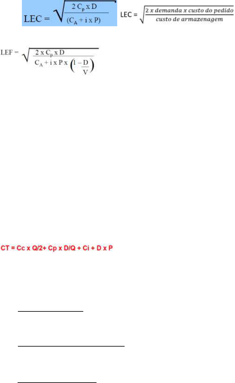 Lista de exercícios – GESTÃO DE ESTOQUES LOTE ECONÔMICO DE COMPRA LOTE ECONÔMICO DE FABRICAÇÃO ESTOQUE MÁXIMO: Emax = ES + Q ESTOQUE MÉDIO: Em = ES + Q/2 PONTO DE PEDIDO: PP = (TA x D) + ES INTERVALO ENTRE PEDIDOS: IP = 1/N onde N = D/Q ESTOQUE MÍNIMO: Emin = Q x K Q = Consumo Médio Mensal K = fator de segurança arbitrário - é proporcional ao grau de atendimento desejado (G.A) para o item. GRAU DE ATENDIMENTO: G.A = 1 - RISCO CUSTOS TOTAIS CT=(Ca+iP)×(estoque médio) + Cp×(nº Pedidos efetuados)+ Custos Independentes Onde: Custo de carregamento (Cc) = (Ca + iP) ACURÁCIA 𝐀𝐂𝐓 = (% 𝐈𝐭𝐞𝐧𝐬 𝐜𝐨𝐧𝐭𝐚𝐝𝐨𝐬𝐀 × 𝐀𝐂𝐀) + (% 𝐈𝐭𝐞𝐧𝐬 𝐜𝐨𝐧𝐭𝐚𝐝𝐨𝐬𝐁 × 𝐀𝐂𝐁) + (% 𝐈𝐭𝐞𝐧𝐬 𝐜𝐨𝐧𝐭𝐚𝐝𝐨𝐬𝐂 × 𝐀𝐂𝐂) NÍVEL DE ATENDIMENTO 𝑵𝑺 = 𝑵𝒓. 𝑰𝒕𝒆𝒏𝒔 𝑬𝒏𝒕𝒓𝒆𝒈𝒖𝒆𝒔 𝑵𝒓. 𝑰𝒕𝒆𝒏𝒔 𝑷𝒆𝒅𝒊𝒅𝒐𝒔 GIRO DE ESTOQUE 𝑮𝑬 = 𝑻𝒐𝒕𝒂𝒍 𝑪𝒐𝒏𝒔𝒖𝒎𝒊𝒅𝒐/𝒎𝒐𝒗𝒊𝒎𝒆𝒏𝒕𝒂𝒅𝒐 𝑬𝒔𝒕𝒐𝒒𝒖𝒆 𝒎é𝒅𝒊𝒐 COBERTURA DE ESTOQUE 𝑪𝑬 = 𝒕𝒐𝒕𝒂𝒍 𝒅𝒆 𝒅𝒊𝒂𝒔 𝒅𝒐 𝒑𝒆𝒓í𝒐𝒅𝒐 𝑮𝒊𝒓𝒐 𝒅𝒆 𝑬𝒔𝒕𝒐𝒒𝒖𝒆 1 - A empresa KTM comercializa um item cuja demanda anual é de 8.000 unidades. Determine o número de pedidos de compra que se deve emitir por ano para uma compra. a) Em lotes de 1.000 unidades. b) Em lotes de 2.000 unidades. c) em lotes de 800 unidades. 2 - Uma empresa efetuou o levantamento de vários fatores de custos envolvidos na manutenção dos estoques, encontrando: Armazenamento R$0,10 /unidade/mês Obsolescência R$0,90 /unidade/ano Perdas R$2,45/unidade/ano Furtos e roubos R$1,50/unidade/ano Preço de compra do item R$2,40/unidade Taxa de Juros (ao ano) 15% Custo de obtenção (compra) R$35,00/pedido Custo de transporte R$20,00/pedido Custos independentes R$15,00/ano Determine: a) Custo unitário de carregamento. b) Custo unitário de obtenção. c) Custo total anual decorrente da necessidade de estoques, considerando, pedidos com 500 unidades para atender uma demanda de 4.000 unidades. 3 - O custo de preparação de uma ordem de fabricação (OF) é de R$125,00/ano. Os custos de manutenção dos estoques são de R$1,50 /unidade/ano. Os custos fixos são de R$75,00/ano. Calcule o custo total anual de manutenção dos estoques, se a demanda anual é de 12.000 unidades, sendo o lote de fabricação de 1.200 unidades. 4– Um item tem custo de armazenagem anual total de R$1,60 por unidade e preço de compra de cada unidade é de R$12,00. Considerando uma taxa de juros de 12% ao ano, calcular o custo de carregamento do estoque desse item. 5- Um item tem custo de armazenagem anual total de R$0,50 por unidade e preço de compra unitária de R$3,00. Considerando uma taxa de juros de 15%a.a., calcular o custo de carregamento do estoque desse item. 6 - A empresa Certa, a partir dos dados do ano anterior, computou todas as despesas do departamento de compras, como custos de mão-de-obra e encargos, materiais de escritório, aluguel das salas, correio, telefone e fax, chegando a um valor médio de R$18,00 por emissão de pedido de compras. Determinar os custos que serão incorridos na obtenção de um item de estoque cuja demanda anual é de 12.000 unidades, para compras duas vezes por ano e para compras dez vezes por ano. Indicadores de estoque 1. Em uma contagem de estoque, foi apurado que de 11 240 itens, 540 estavam errados. Existem 3 classes de produtos: a Classe “A” possuía 6800 itens corretos e 240 com erros. A Classe “B” possuía um total de 2200 itens sendo que desses 88 estavam errados e a classe “C” possuía 2000 peças. Determine a Acurácia por item e total do Inventário. “A acurácia determina a relação entre o número de itens ou valores corretos e a quantidade ou valor total de itens apurados no inventário” Classe Total de Itens Contados % dos itens contados Total de Itens Corretos Itens com Divergência Acurácia A 7.040 62,63% 6.800 240 0,9659 B 2.200 19,57% 2.112 88 0,9600 C 2.000 17,79% 1.788 212 0,8940 Total 540 2. Durante o mês de dezembro de 2012, a empresa processou e entregou 2800 requisições, sendo que, em média, cada requisição possuía 2,4 itens. O total de itens solicitados foi de 7.000. Calcule a percentual do nível de serviço da empresa. “Indica a capacidade de atendimento das solicitações feitas pelos usuários do estoque. ” 3. A empresa J. Laskado Ltda movimentou em seu estoque o valor de R$ 2.520.000,00 durante o ano de 2012. A média do valor de seu estoque foi de 212.570,00. Calcule o GIRO DE ESTOQUE que a empresa teve no ano. Calcule também o prazo de COBERTURA do estoque no período. “Giro de Estoque mede quantas vezes, por unidade de tempo, o estoque se renovou ou girou.” “Cobertura do estoque indica o número de unidades de tempo (dias) que o estoque médio será suficiente para cobrir a demanda média”. CUSTO DO ESTOQUE Custos diretamente proporcional 4. Um item tem custo de armazenagem anual de R$ 0,35 por unidade e preço de compra unitário de R$ 10,00. Considerando uma taxa de juros de 3% ao mês, calcular o CUSTO DE CARREGAMENTO deste item. Custos inversamente proporcional 5. Uma empresa revende Parafusos de pressão, que é utilizado na construção de Móveis e tem uma demanda anual estimada em 240.000 unidades. O custo de transporte, de R$ 140,00 por lote, fica por conta do comprador. O custo de emissão de um pedido é estimado em R$ 20,00. Sabendo que a empresa faz 2 pedidos por mês do produto, determinar o custo anual de obtenção em que ela irá incorrer. D = 240.000 unidades/ano n = 24 pedidos/ano Q = D/n: 10000 . 6. Determinar o custo anual de manutenção dos estoques de uma empresa que comercializa um produto cuja demanda anual é de 240.000 unidades. O p