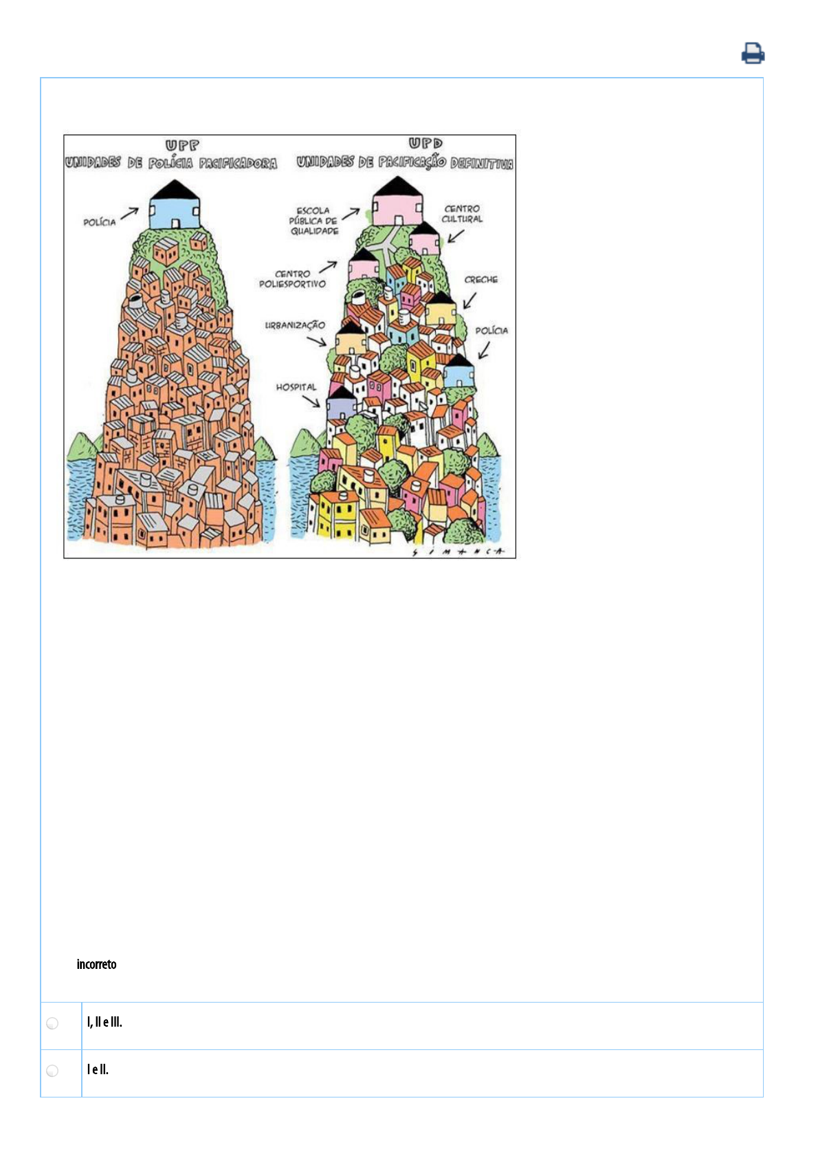 14/10/2019 Universidade Paulista - UNIP : Disciplina On-line. https://online.unip.br/disciplina/detalhes/9015 1/2 Veja a charge e leia o texto a seguir: Disponível em: <http://urbecarioca.blogspot.com.br/2013/07/semana-24062013-28062013.html>. Acesso em: 4 jun de 2017 Cabe ao Estado a obrigação de criar condições objetivas para o efetivo acesso ao serviço de segurança pública. Entretanto, é importante notar que as relações sociais evoluem diariamente e que as instituições policiais, para poderem acompanhar a sociedade, devem aprimorar-se e evoluir em consonância com ela, humanizando-se e racionalizando recursos �nanceiros, tecnológicos e materiais a �m de melhorar a prestação de serviço de segurança pública à coletividade. Assim, percebe-se, na atualidade, um enorme esforço do governo para a conquista da paci�cação social em favelas. Para atingir esse objetivo adotou-se, na prática, uma nova estratégia de segurança pública: a ocupação permanente das favelas por Unidades de Polícia Paci�cadora, as chamadas UPP´s. Agora, analise as a�rmativas abaixo: I A charge faz uma dura crítica às UPP´s, Unidades de Polícia Paci�cadora, na medida em que aponta o seu pouco ou nenhum envolvimento com o progresso e o bem-estar da sociedade e mostra um modelo um ideal, através da UPD´s (Unidades de Paci�cação De�nitiva). II Nas UPD´s (Unidades de Paci�cação De�nitiva), a polícia é tida como elemento central no quadro de ações sociais, capaz de promover o bem-estar e a qualidade de vida da coletividade. III A charge identi�ca as UPP´s (Unidades de Polícia Paci�cadora) e as UPD´s (Unidades de Paci�cação De�nitiva) como estruturas similares, que atuam visando ao mesmo propósito. Está incorreto o a�rmado em A I, II e III. B I e II. 14/10/2019 Universidade Paulista - UNIP : Disciplina On-line. https://online.unip.br/disciplina/detalhes/9015 2/2 C I e III. D II e III. E III. Você já respondeu e acertou esse exercício. A resposta correta é: D.
