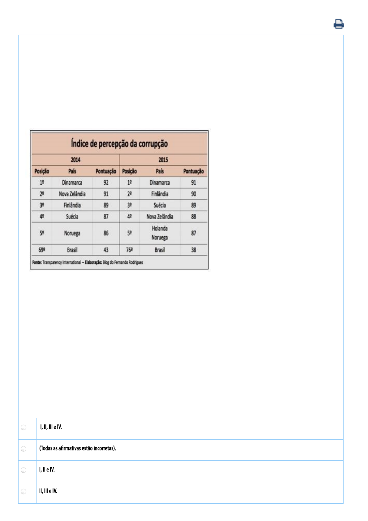 14/10/2019 Universidade Paulista - UNIP : Disciplina On-line. https://online.unip.br/disciplina/detalhes/9015 1/2 Desde 1995, a Organização não Governamental Transparência Internacional, com sede em Berlim, publica o relatório anual do Índice de Percepção de Corrupção (IPC), que ordena os países do mundo de acordo com o grau de corrupção. Isto ocorre por meio de pesquisas junto a entidades da sociedade civil, agências de risco, empresários e investidores, com o objetivo de evidenciar a percepção que esses agentes econômicos têm a respeito da transparência no sistema de gestão pública ao qual pertencem. O índice objetiva, também, demonstrar como cada país é visto pela comunidade internacional. Assim, quanto mais transparente o governo for, melhor será sua classi�cação no ranking mundial. A metodologia adotada por essa ONG estabelece que o país é tanto menos corrupto quanto mais próximo de 100 estiver sua pontuação. Entretanto, os países que se afastam desse resultado e se recusam a ser transparentes, criam uma cultura de impunidade contra a corrupção e deixam claro que tais elementos são prósperos em suas sistemáticas de gestão. Veja o quadro a seguir: Disponível em: https: <//conteudo.imguol.com.br/blogs/52/�les/2016/01/Indice-percepcao-corrupcao-26jan2016-1024x518.png>. Acesso em: 7 jun de 2017. Tomando essas informações por base, analise as a�rmativas a seguir: I Entre os países de menor índice de corrupção em 2015 incluem-se: Dinamarca (Europa), Finlândia (Europa), Suécia (Europa) Nova Zelândia (Oceania), Holanda e Noruega (Europa), o que rea�rma a posição da Oceania como o continente de maior expressão de combate à corrupção. II A Dinamarca lidera o ranking assumindo, em 2015, a pontuação 91, o que lhe confere o título de nação menos transparente no cenário internacional. III Os primeiros lugares do ranking de 2015 �caram com países do norte da Europa: Dinamarca, Finlândia e Suécia encabeçam a lista. Em 2014, esses 3 países já estavam entre os cinco primeiros do ranking. A Nova Zelândia caiu 2 posições, saindo do 2º lugar em 2014 para o 4º lugar em 2015. IV Em 2014 o Brasil estava na 69ª posição entre 174 países. Em 2015, o país aparece em 76º lugar. Perdeu pontos no ranking: tinha 43 pontos em 2014 e �cou com 38 em 2015, o que con�rma o critério de avaliação: quanto mais pontos, menor é a percepção da corrupção. Está correto o a�rmado em A I, II, III e IV. B (Todas as a�rmativas estão incorretas). C I, II e IV. D II, III e IV. 14/10/2019 Universidade Paulista - UNIP : Disciplina On-line. https://online.unip.br/disciplina/detalhes/9015 2/2 E III e IV. Você já respondeu e acertou esse exercício. A resposta correta é: E.