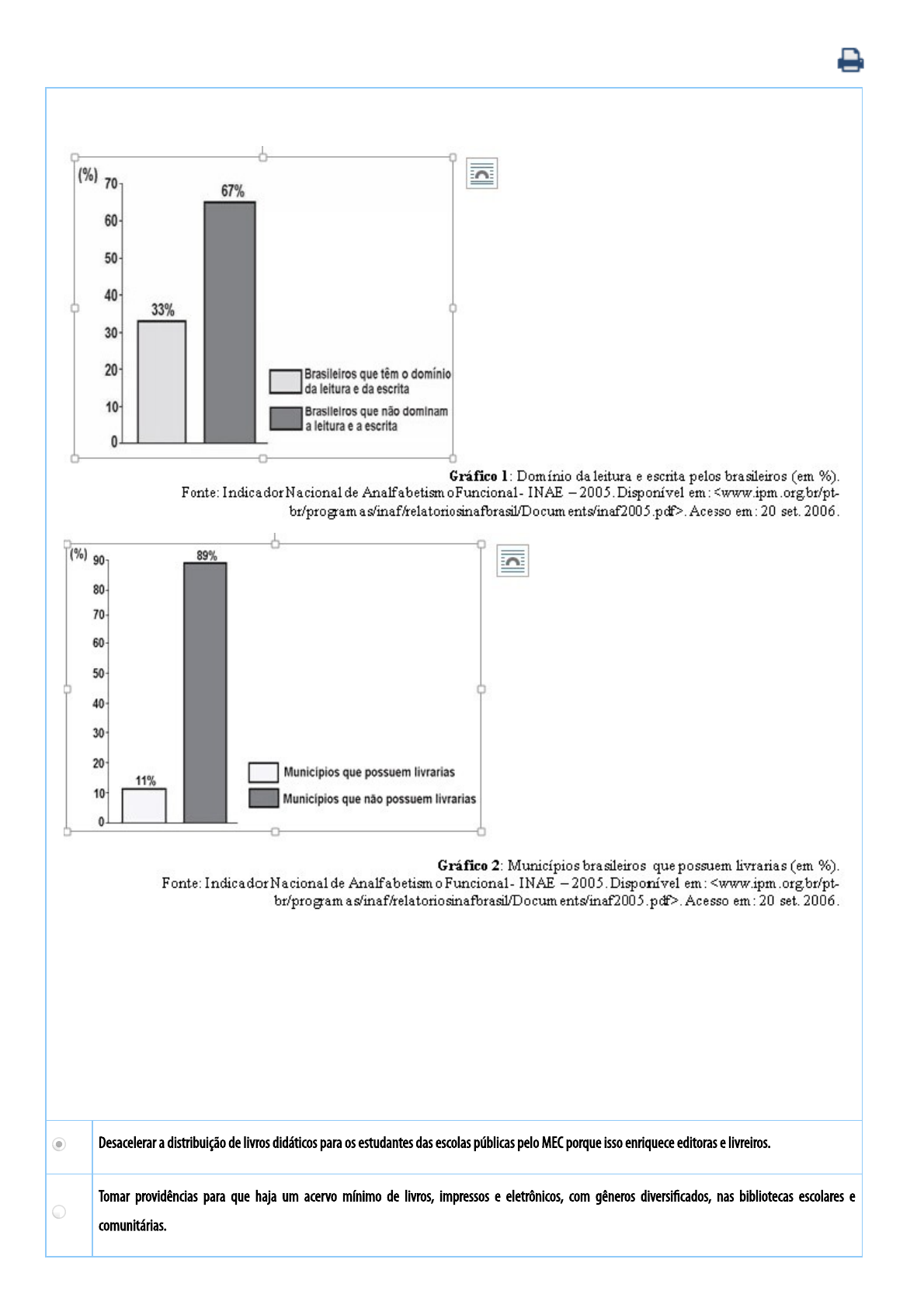14/10/2019 Universidade Paulista - UNIP : Disciplina On-line. https://online.unip.br/disciplina/detalhes/9015 1/2 Leia os grá�cos: Relacione esses grá�cos às seguintes informações: Em 2008 o Ministério da Cultura divulgou que o Brasil não só produz mais da metade dos livros do continente americano, como também tem parque grá�co atualizado, excelente nível de produção editorial e grande quantidade de papel. Estima-se que 73% dos livros do país estejam nas mãos de 16% da população. Para melhorar essa situação é necessário que o Brasil adote políticas públicas capazes de conduzir o país à formação de uma sociedade leitora. Qual das seguintes ações NÃO contribui para a formação de uma sociedade leitora? A Desacelerar a distribuição de livros didáticos para os estudantes das escolas públicas pelo MEC porque isso enriquece editoras e livreiros. B Tomar providências para que haja um acervo mínimo de livros, impressos e eletrônicos, com gêneros diversi�cados, nas bibliotecas escolares e comunitárias. 14/10/2019 Universidade Paulista - UNIP : Disciplina On-line. https://online.unip.br/disciplina/detalhes/9015 2/2 C Criar programas de formação continuada de professores, capacitando-os para criar um vínculo signi�cativo entre o estudante e o texto. D Criar programas, de iniciativa pública e privada, garantindo que os livros migrem das estantes para as mãos dos leitores. E Utilizar a literatura como estratégia de motivação dos estudantes, contribuindo para uma leitura mais prazerosa. Você já respondeu e acertou esse exercício. A resposta correta é: A.