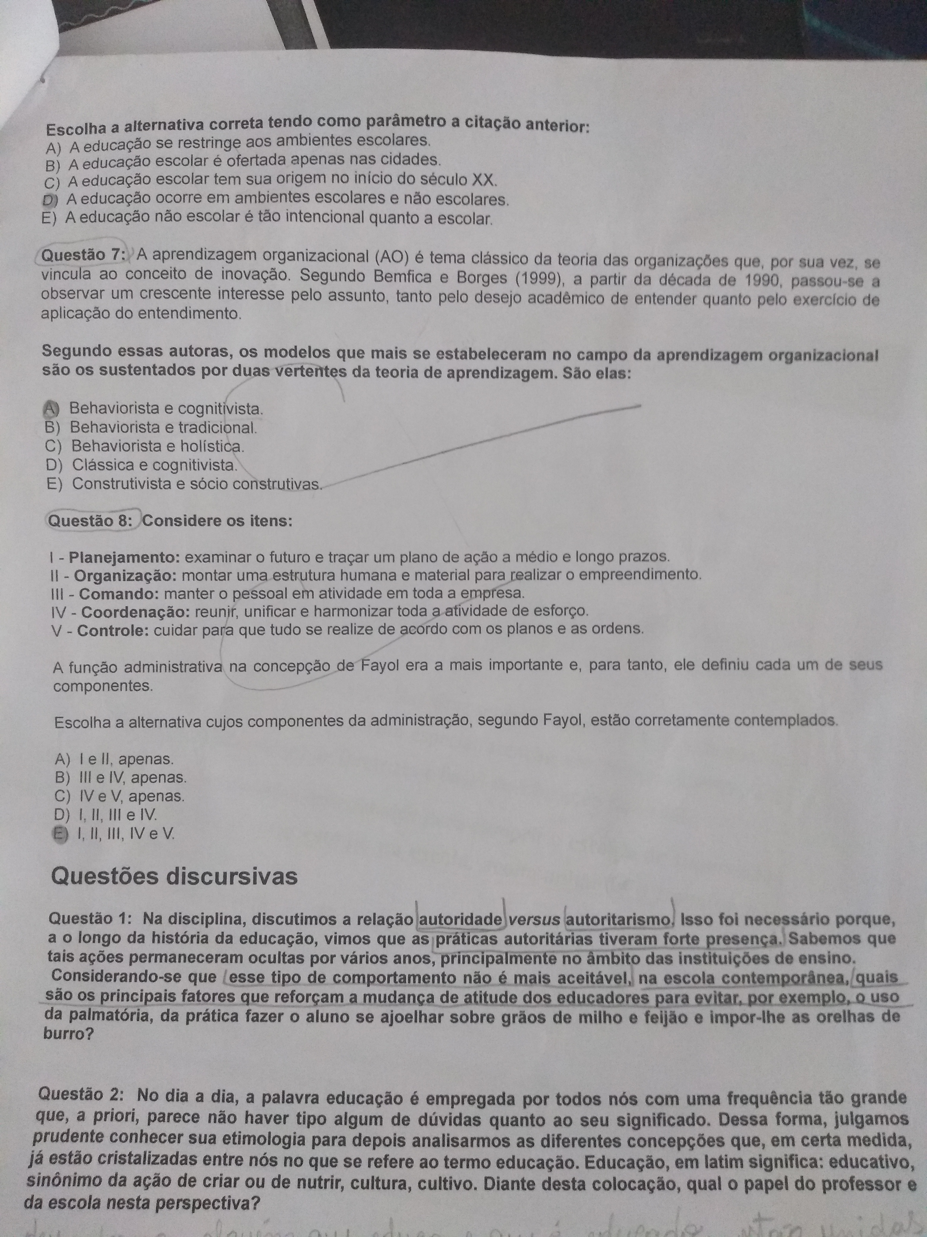 Escolha a alternativa correta tendo como parametro a citacao anterior: A) A educacao se restringe aos ambientes escolares. B) A educacao escolar e ofertada apenas nas cidades. C) A educacao escolar tem sua origem no inicio do seculo XX. D) A educacao ocorre em ambientes escolares e nao escolares. E) A educacao nao escolar e tao intencional quanto a escolar.