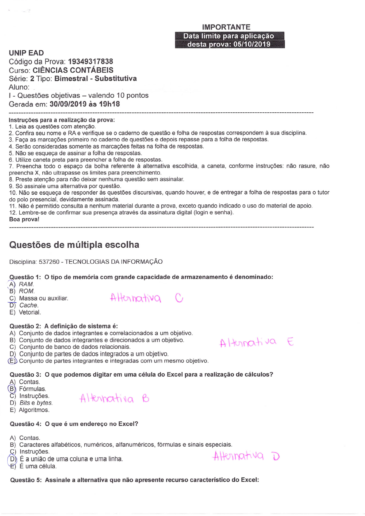 i蘭PORTANTE UNIP EAD 器霊謹濃器…龍 S6rie: 2 Tipo: Bimest「aI - Substitutiva Aiuno: - l - Quest6es objetivas - Valendo lO pontos Gerada em: 30IO9I2019 as 19h18 lnst「uc6es pa「a a realizaeao da p「OVa: 1.しeia as quest6es com aten9aO. 2. Confira seu nome e RA e ve「ifique se o cade「no de questao e foIha de 「espostas co「「espondem a sua disciplina. 3. Fa9a aS marca96es p「imeiro no cademo de quest6es e depois repasse pa「a a folha de 「espostas. 4. Se「ao conside「adas somente as marca96es feitas na fdiha de respostas, 5. Nao se esque9a de assina「 a folha de respostas. 6. Utilize caneta p「eta pa「a p「eenche「 a foIha de 「espostas. 7. P「eencha todo o espa9O da boiha 「efe「ente a altemativa escoIhida, a Caneta, COnfo「me instl田e6es: naO 「aSu「e, naO P「eenCha X, naO uIt「apasse os limites pa「a p「eenchimento. 8. P「este aten?aO Pa「a naO deixar nenhuma questao sem assinaIa「・ 9. S6 assinale uma a看te「nativa po「 questao. 10. Nao se esqueea de 「esponde「 as quest6es discu「Sivas, quando houve「, e de ent「egar a fdiha de respostas para o tutor do poIo presencial, devidamente assinada. 11. Nao e pe「mitido consuita a nenhum mate「ial durante a p「OVa, eXCetO quando indicado o uso do mate「iai de apoio. 12. Lembre-Se de confirmar sua p「esenea atrav色s da assinatu「a digital (Iogin e senha), Boa prova! Quest6es de m劇tipla escolha DiscipIina: 537260 - TECNOLOGIAS DA INFORMAQÅo Quest尋o l: O tipo de mem6ria com grande capacidade de a「mazenamento 6 denominado: 鵠ouaux両a「 ⊥、_告 E) Veto「iaI. Questao 2: A definicao de sistema 6: A) Conjunto de dados integ「antes e co「relacionados a um objetivo. B) Conjunto de dados integ「antes e di「ecionados a um objetivo. C) Conjunto de banco de dados relacionais. 思 Conjunto de partes de dados integ「ados a um oPjetivo"Conjunto de partes integrantes e integ「adas com um mesmo oPjetivo. 由来ハ「{) - Quest尋o 3: O que podemos digita「 em uma c61ula do ExceI para a realizaeao de calculos? 鱒Contas. F6rmuIas. i nst「u96es. D) Bife e byfes. E) AIgo「itmos. 臣下、、、、/十 Questao 4: O que 6 um ende「e9o nO Excel? A) Contas. B) Ca「acteres aifabeticos, numericos, alfanumericos, fo「mulas e sinais especiais. ㊥楽器㌫uma。。一una。um。冊a. 正 + 」二¥ DE uma celuIa. Questao 5: Assinale a aite「nativa que nao ap「esente recurso ca「acteristico do Excei: Montagem de plan冊as e g「ades de caIculo e g「aficos. Manipuia?aO de imagens. P「Odu9aO de caienda「ios. Cont「Ole de estoque. Compa巾Ihamento de dados. 6: Qua1 6 o sistema baseado em controie da administra9aO do neg6cio do cIiente? 中土▼ i /千十っ仁、∴主 Questao 7: Os tipos de meios de teIecomunicac6es incIuem: A) Mejos baseados em fios de cob「e. B) Sistemas de mic「O-Ondas po「 terra. C) Linhas de fibra 6tica e satdites de comunica96es. 圃Sistemas de fadio.todas as altemativas ante「io「es. Questao 8こO que o MS Excel efetua「ia se utiIizasse a f6muia = Soma (Al : A20)? A) Uma soma ent「e a ceIuIaAe a linha 20・ 儲Uma somaentrea linha l ea linha20. Uma soma dos vaIo「es no interva10 da ceIula Al ate a celuIaA2O. ._. Uma soma dos vaIo「es da c色IuIaAl e da c色IulaA20. E) Umasoma na coIunaAelinha 20. Questao 9: Se uma empresa utiliza a lnte「net para ma而e締hg, COmp「a, Venda e assistencia a produtos e Servieos ao Iongo das redes, ela esta utilizando a inte「net pa「a apoiar: A) Acomunica9aO e a COIabo「a9aO naS emPreSaS. 患O ge「enciamento de 「ecu「SOS humanos.O comercio elet「6nico. D) As aIianeas comerciais estrategicas" E) A Ext「anet. Questao lO: O que podemos digita「em uma c6lula do Excel? ㊨Contas.Ca「acte「es alfabeticos, nume「icos, aIfanumericos, formulas e sinais especiais. C) lnstrue6es- D) Bits e bytes. E) AIgo「itmos. 十←∵ 上白l 十 ????? ? ????? ???