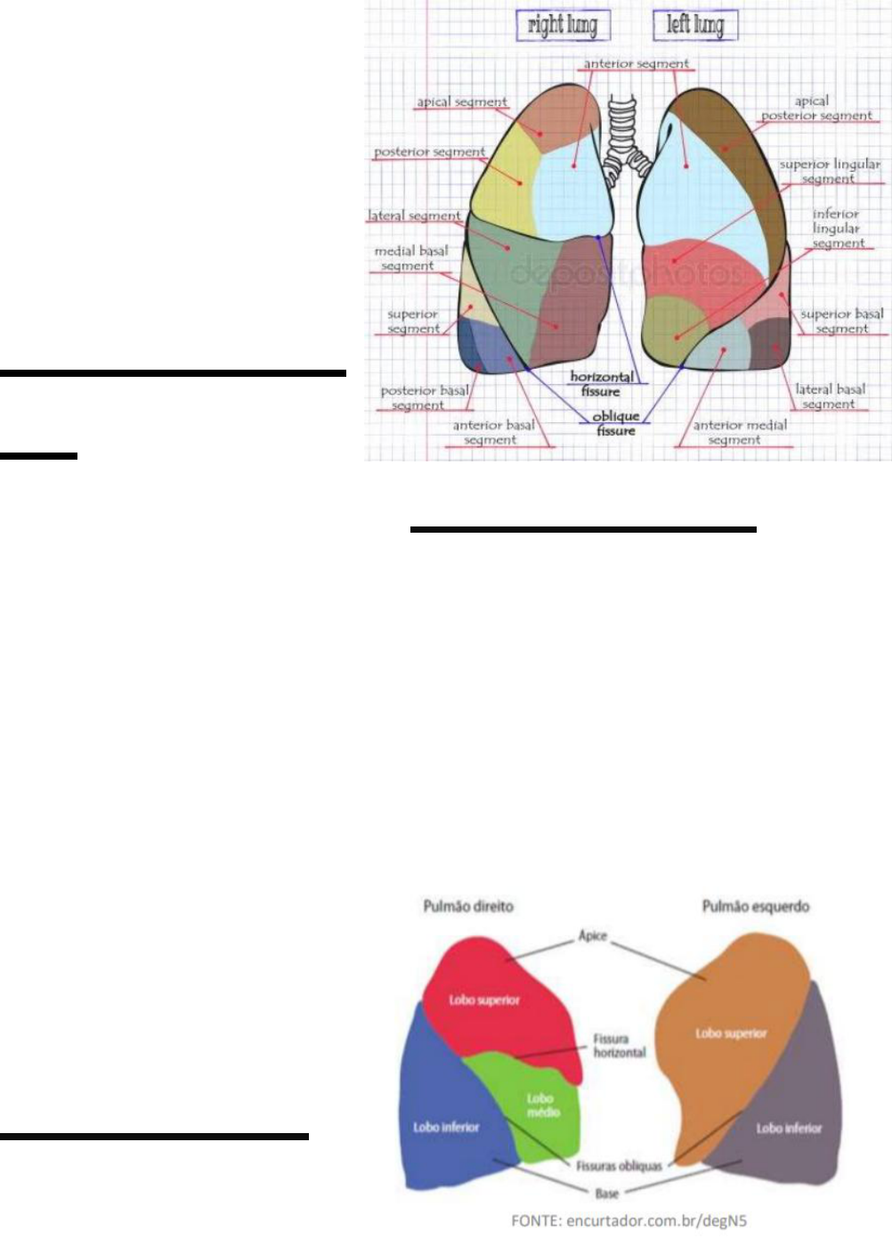 Anatomia do Pulmão Introdução: - Pulmão é um órgão duplo que realiza funções de ventilação e hematose, permitindo a troca e difusão do oxigênio e gás carbônico em prol da homeostasia orgânica. - Como é a passagem do ar pelo sistema respiratório? nariz cavidade nasal coanas nasais nasofaringe orofaringe laringofaringe laringe traqueia brônquios bronquíolos bronquíolos terminais bronquíolos respiratórios sacos alveolares ductos alveolares. - A partir dos ductos alveolares, ocorre a hematose. - O oxigênio vai para os tecidos permitindo a manutenção do metabolismo aeróbico, e o CO2 proveniente das reações orgânicas (anabólicas ou catabólicas) faz o caminho inverso, sendo eliminado para o ambiente externo (expiração). Anatomia do pulmão - Os pulmões são órgãos intratorácicos de consistência macia, elástica e esponjosa. - O mediastino separa o pulmão esquerdo do direito. - Pontos anatômicos = ambos os pulmões apresentam ápice e base que estão localizados acima do diafragma: - Pulmão direito: Possui três lobos e duas fissuras. O lobo superior direito é separado pela fissura horizontal do lobo médio. A fissura obliqua separa o lobo médio do lobo inferior. - Pulmão Esquerdo: Apresenta apenas dois lobos (sup. e inf.) que são separados pela fissura obliqua esquerda. Podemos considerar a região da língula como correspondente ao lobo médio do lado direito. O pulmão esquerdo não possui lobo médio. - HILO PULMONAR: está localizada na porção mediastinal e corresponde à região de entrada da artéria pulmonar, veia pulmonar e brônquio principal. O hilo esquerdo está localizado em posição mais alta do que o direito - PLEURA: a pleura se divide em visceral e parietal e entre elas existe um espaço virtual. Quando ocorre o acumulo de liquido entre esses folhetos temos um derrame pleural. - Derrame pleural – ocorre por complicações de processos infecciosos como pneumonia e tuberculose. - ÁRVORE TRAQUEOBRÔNQUICA: a traqueia, na região da Carina, se bifurca em brônquio principal direito e brônquio principal esquerdo. - Brônquio principal direito por se apresentam em posição retificada é o local mais comum de impactação de corpo estranho. - Brônquios principais se dividem em brônquios lobares (secundários) brônquios segmentares (terciários) chegando aos segmentos bronco pulmonares bronquíolos condutores bronquíolos terminais bronquíolos respiratórios ductos alveolares sacos alveolares alvéolos Faces pulmonares FACE MEDIASTINAL – porção em formato de côncavo que está relacionada com o mediastino e compreende o hilo pulmonar. Relaciona-se com 2/3 do pericárdio que estão desviados para o lado esquerdo da linha mediana. FACE DIAFRAGMÁTICA – porção que está apoiada no diafragma – base pulmonar FACE COSTAL – porção que se relaciona com as vertebras torácicas Vascularização: - A vascularização pulmonar e pleural é realizada pela artéria brônquica. - Pulmão direito – irrigado pela artéria brônquica direita - Pulmão esquerdo – irrigado pela artéria brônquica esquerda Drenagem nervosa : - Uma parte da drenagem venosa é realizada pelas veias bronquiais e o resto pelas veia pulmonares. - A veia bronquial direita ira drenar para a veia ázigo e a esquerda para hemiazigo acessória. Drenagem linfática: - Plexo linfático pulmonar linfonodos hilares linfonodos bronco pulmonares linfonodos traque bronquiais sup. e inf. troncos linfáticos bronco mediastinais direito e esquerdo Inervação: - Fibras simpáticas e parassimpáticas nervo vago - Pleura parietal nervo intercostal e nervo frênico