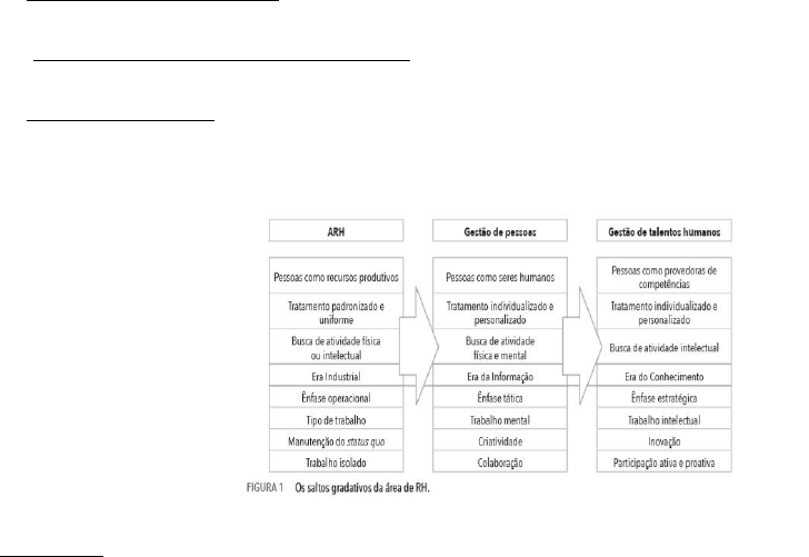 ETEC PARQUE BELÉM- 1º AB – GP I 1.Linha de evolução da área de Recursos Humanos e sua importância na atualidade para o sucesso das organizações: Em uma perspectiva de evolução, podemos tratar a gestão de pessoas em três estágios: a) administração de pessoal – rotinas de geração de folha de pagamento, manutenção de registros, assentamentos funcionais e controle dos servidores; b) administração de recursos humanos – sensível avanço quanto ao elemento humano e nos processos de trabalho, análise sistêmica da organização e destaque no ambiente laboral; c) gestão de pessoas – organizações voltadas às pessoas como seu mais valioso componente de capital, recurso capaz de gerar riquezas. Exercícios: 1-Qual era o papel das pessoas nas organizações no início de século XX? 2-Porque as relações humanas passaram a ser valorizadas? 3-Quando surge o conceito de Administração de Recursos Humanos e qual sua importância nas organizações? 4-O que é enfoque sistêmico? 5-Quais as características que uma organização que possui enfoque sistêmico deve ter? 2.Conceitos de Missão, Visão e Valores : Exercícios: 1- A missão do Ifes é “Promover educação profissional pública de excelência, integrando ensino, pesquisa e extensão, para a construção de uma sociedade democrática, justa e sustentável.” De acordo com Chiavenato (2015), é CORRETO afirmar que o conceito de Missão é: A.Referir-se àquilo que a organização deseja ser no futuro. B.Declarar o propósito e o alcance da empresa em termos de produto e de mercado. Definir o papel da organização dentro da sociedade em que está envolvida e significa sua razão de ser e de existir. C.Proporcionar um clima em que as pessoas possam satisfazer uma variedade de necessidades humanas. D.Proporcionar um retorno justo aos fatores de entrada. E.Aumentar o bem-estar da sociedade através do uso econômico dos recursos. 2-Dois dos pressupostos fundamentais para a elaboração do planejamento estratégico são a definição dos princípios que norteiam o comportamento da organização e como ela se vê no futuro. Esses dois elementos aparecem na teoria do planejamento como, respectivamente: A. regras e missão. B. missão e visão. C. valores e visão. D. regulamentos e visão. E. valores e missão. 3- A respeito da cultura das organizações e dos diferentes mecanismos de avaliação do seu funcionamento, julgue o item que se segue. O resultado do pensamento estratégico é a visão ou o objetivo de longo prazo, bem como o plano que a empresa pretende adotar para alcançá‐lo. ( ) Certo ( ) Errado 4- A missão da Universidade Federal do Ceará é formar profissionais da mais alta qualificação, gerar e difundir conhecimentos, preservar e divulgar os valores éticos, científicos, artísticos e culturais, constituindo-se em instituição estratégica para o desenvolvimento do Ceará, do Nordeste e do Brasil. Obedecendo a lógica da hierarquia dos objetivos de uma organização, é correto afirmar que: A.Os objetivos gerais de longo prazo são definidos com base na missão. B.Os objetivos específicos definem as missões para cada departamento. C.A missão não abrange os objetivos departamentais e de unidades D.A missão é definida com base nos objetivos gerais de longo prazo, da organização. E.A missão é definida com base nos objetivos individuais e de desenvolvimento de pessoal, da organização. 5- A missão da organização aponta sua razão de existir, é essencial e importante; logo toda organização possui uma missão. ( )Certo ( )Errado Profª Regina Campos