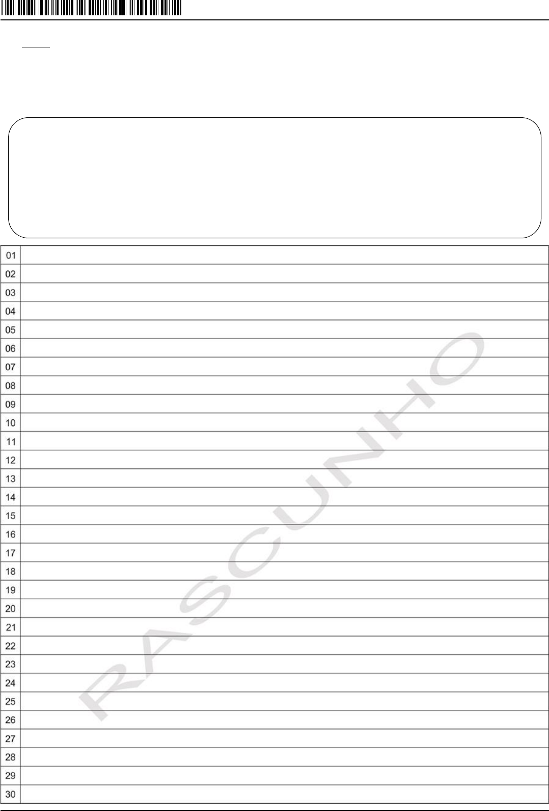 20 TRF1R-An.Jud.-Informática-D REDAÇÃO Atenção: − Deverão ser rigorosamente observados os limites mínimo de 20 linhas e máximo de 30 linhas. − Conforme Edital do Concurso, será atribuída nota ZERO à Prova de Redação, na Folha Definitiva, que: a) fugir à modalidade de texto solicitada e/ou ao tema proposto; b) apresentar textos sob forma não articulada verbalmente (apenas com desenhos, números e palavras soltas ou em versos) ou qualquer fragmento de texto escrito fora do local apropriado; c) for assinada fora do local apropriado; d) apresentar qualquer sinal que, de alguma forma, possibilite a identificação do candidato; e) for escrita a lápis, em parte ou em sua totalidade; f) estiver em branco; g) apresentar letra ilegível e/ou incompreensível. − Em hipótese alguma o rascunho elaborado pelo candidato será considerado na correção da Prova de Redação. Em entrevista recente, o filósofo francês Alain Badiou explicou sua afirmação de que “a ecologia é o ópio do povo”, feita anteriormente. Segundo ele, “a ecologia é hoje um misticismo que não teme assumir tonalidades catastrofistas. Com o declínio das religiões históricas, a ecologia, com o acento que ela coloca em questões como ‘a preservação da natureza’, ou mesmo de uma relação perdida do homem com esta mesma natureza, parece-me uma nova forma de messianismo. Eu não me preocupo exatamente com o destino da natureza, preocupo-me com o destino dos homens. É essa preocupação que deveria pautar nossas ações atuais”. (Folha de S.Paulo, 6/7/14, com adaptações) Desenvolva um texto dissertativo-argumentativo, sobre as questões que Alain Badiou discute acima. Justifique seu ponto de vista. Caderno de Prova ’D’, Tipo 001 www.pciconcursos.com.br By Carla Gabola
