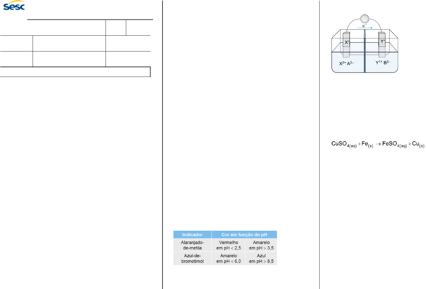 1 CENTRO EDUCAÇÃO SESC JOSÉ ROBERTO TADROS Resolução nº 132/13 – C.E.E./AM Educação infantil – Ensino fundamental – Ensino médio Aluno (a): Série: 2° Turma: A/B Disciplina: Química Professor (a): Joyce Almeida Data: ___/___2019 Lista de Apoio Bimestre: 4° Conteúdo: Equilíbrio Iônico e Oxidorredução 1) A constante de ionização do HCN é igual a 7,2 . 10 -10 M, a uma certa temperatura. Calcule o grau de ionização do HCN numa solução 0,2M 2) O grau de ionização do ácido acético (HAc), numa solução 0,5M, é de 0,6%. Calcule a constante de ionização desse ácido. 3) Quais são os números de oxidação do iodo nas substâncias l2, Nal, NalO4 e A l I3? 4) Nas substâncias CaCO3, CaC2, CO2, C (grafite) e CH4, os números de oxidação do carbono são, respectivamente: 5) Temos um sistema em que se estabelece o equilíbrio: 2 CrO42- + 2 H+ → Cr2O72- + H2O a) O que acontece a esse sistema se adicionarmos HCl? b) O que acontece a esse sistema se adicionarmos Na2Cr2O7? c) O que acontece a esse sistema se adicionarmos KOH? 6) Uma solução possui Ka = 9. 10 -7 e concentração molar igual a 0,1. Determine o valor da [H+], o valor do pH e do pOH. (log 3 = 0,4) 7) Uma solução de um monoácido fraco de concentração igual a 0,25 mol/L apresenta grau de ionização igual a 0,4%. O pH desta solução é igual a? 8) Um suco de tomate tem pH = 4,0 e um suco de limão tem pH = 2, 0. Sabendo-se que pH = -log[H+] e pH + pOH = 14: a) calcule quantas vezes a concentração de H+ do suco de limão é maior do que a concentração de H+ do suco de tomate; b) calcule o volume de solução aquosa de NaOH de concentração 0,010 mol/L necessário para neutralizar 100 mL de cada um dos sucos. 9) A um litro de solução de ácido clorídrico (HCℓ) de pH = 2 são adicionados nove litros de água destilada. O pH da solução final é: 10) Admita que café tem pH = 5,0 e leite tem pH = 6,0. Sabendo-se que pH = -log[H+] e que pH + pOH = 14, calcule: a) a concentração de OH- no café; b) a concentração de H+, em mol/L, em uma “média” de café com leite que contém 100 mL de cada bebida. 11) A 25°C, o pH de uma solução aquosa de um certo eletrólito é igual a 14. Qual a concentração de OH– dessa solução? 12) A tabela a seguir relaciona a cor de indicadores com pH de soluções aquosas: Indique a cor adquirida pelas soluções na presença de cada um dos indicadores. a) Solução 0,01 M de ácido clorídrico, 100% ionizado. b) Solução 0,01 M de ácido acético, 1% ionizado. 13) Dado o esquema da pilha: : Pergunta-se a) qual é o cátodo e o ânodo? b) equacione as semirreações de oxidação e redução. c) onde existe a maior concentração de massa na placa? d) quais os íons que irão passar pela parede porosa? 14) Observe a reação espontânea que ocorre numa célula eletroquímica, nas condições-padrão, é: Essa reação indica que: a) o eletrodo Fe(s) / Fe2+(aq) é o cátodo da célula. b) o eletrodo Cu2+(aq) / Cu(s) é o ânodo da célula. c) o metal ferro é oxidado. d) o CuSO4 é o agente redutor. e) o metal cobre é reduzido. 15) (PUC-SP) Para montar uma pilha, dispõe-se dos materiais e dos dados a seguir. Materiais: – uma lâmina de cobre; – dois béqueres; – uma lâmina de zinco; – um fio condutor; – solução de CuSO4 a 1 mol/L; – uma ponte contendo KNO3. – solução de ZnSO4 a 1 mol/L; Dados: Cu2+ + 2e- → Cu ΔE° = + 0,34 V Zn2+ + 2e- → Zn ΔE° = – 0,76 V em que ΔE° = potencial de redução. 2 a) Faça um desenho esquematizado da pilha e escreva sua notação simplificada. b) Indique o sentido dos elétrons do fio. c) O que ocorre com as massas dos metais Zn e Cu? d) Calcule a ddp da pilha. e) Qual a função da ponte salina? 16) Da mesma forma que trabalhamos com potenciais de oxidação, podemos fazê-lo com os de redução. Observe que, nas mesmas condições experimentais, os valores absolutos dos dois potenciais são iguais, mas de sinais contrários. Os valores são tabelados a 25°C, 1 atm e solução 1,0 mol/L. Das espécies químicas fornecidas, o melhor agente oxidante e o melhor agente redutor são, respectivamente: a) Aℓ e Cu b) Cu e Aℓ c) Cu e Aℓ3+ d) Cu2+ e Aℓ3+ e) Cu2+ e Aℓ 17) Assinale a opção que contém, respectivamente, o ΔE°, ânodo, cátodo e número de elétrons envolvidos na reação total da pilha galvânica padrão representada abaixo. Dados: Zn2+ + 2e- → Zn° E° = –0,76 V Cr3+ + 3e- → Cr° E° = – 0,74 volt 18) A pilha utilizada nos marca-passos é constituída por um eletrodo de iodo e outro de lítio. Conhecidos os potenciais de redução padrão para os eletrodos: I2(s) + 2 e- → 2 I1- E° = + 0,536 V Li1+ + 1 e- → Li(s) E° = - 3,045 V Pedem-se: a) a equação da reação global da pilha; b) a força eletromotriz padrão da pilha. 19) Dada a reação de transformação do alumínio em cloreto de alumínio pela ação do gás cloro: Pode-se verificar que a semirreação que representa o processo de oxidação é? 20) Observe os potenciais-padrão: Das espécies químicas citadas, a melhor oxidante e a melhor redutora são, respectivamente? 21) O melhor agente redutor é:
