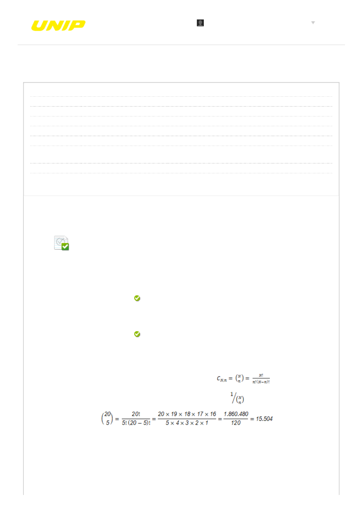 28/09/2019 Revisar envio do teste: QUESTIONÁRIO UNIDADE II – 7354-... https://ava.ead.unip.br/webapps/assessment/review/review.jsp?attempt_id=_24316053_1&course_id=_45781_1&content_id=_718703_1&return… 1/14 Revisar envio do teste: QUESTIONÁRIO UNIDADE II BIOESTATISTICA APLICADA A BIOMEDICINA 7354-30_44801_R_20192 CONTEÚDO Usuário luciana.perotti @unipinterativa.edu.br Curso BIOESTATISTICA APLICADA A BIOMEDICINA Teste QUESTIONÁRIO UNIDADE II Iniciado 28/09/19 18:19 Enviado 28/09/19 18:20 Status Completada Resultado da tentativa 5 em 5 pontos Tempo decorrido 1 minuto Resultados exibidos Todas as respostas, Respostas enviadas, Respostas corretas, Comentários, Perguntas respondidas incorretamente Pergunta 1 Resposta Selecionada: c. Respostas: a. b. c. d. e. Feedback da resposta: As verduras de 20 restaurantes são fornecidas pelo mesmo distribuidor. O pro�ssional deseja incorporar no seu portfólio de produtos alguns legumes especiais, porém que lhe custam mais. Com o �nal de ano se aproximando, ele avaliou que talvez fosse uma boa hora para introduzir esses novos produtos e, então, resolveu presentear aleatoriamente alguns de seus clientes para avaliar se tais legumes teriam boa aceitação. Qual é a probabilidade de que uma amostra de cinco restaurantes seja aleatoriamente selecionada entre aquelas que fazem parte de seu grupo de clientes �éis? 1/15.504. 1/1.860.480. 1/120. 1/15.504. 1/20. 1/4. Resposta: C Comentário: nesse tipo de amostragem, η〈 possíveis amostras de n elementos que podem ser extraídas a partir da população, bem como cada amostra tem a mesma probabilidade, , de ser selecionada. Assim: Logo, a probabilidade de que uma amostra de cinco restaurantes seja aleatoriamente selecionada será de 1/15.504. UNIP EAD BIBLIOTECAS MURAL DO ALUNO TUTORIAISCONTEÚDOS ACADÊMICOS 0,5 em 0,5 pontos luciana.perotti @unipinterativa.edu.br 28/09/2019 Revisar envio do teste: QUESTIONÁRIO UNIDADE II – 7354-... https://ava.ead.unip.br/webapps/assessment/review/review.jsp?attempt_id=_24316053_1&course_id=_45781_1&content_id=_718703_1&return… 2/14 Pergunta 2 Resposta Selecionada: b. Respostas: a. b. c. d. e. Feedback da resposta: Em determinada espécie de canídeo, a cor da pelagem preta (P) é dominante sobre a pelagem clara (p), e o pelo liso (L) é dominante sobre o pelo cacheado (l). O gene da cor do pelo e o gene da textura do pelo estão em diferentes cromossomos, portanto, segregam independentemente e não são ligados ao sexo. Em um cruzamento de dois indivíduos heterozigotos (PpLl), qual seria a fração esperada: �lhotes com pelos pretos e lisos? 9/16. 1/16. 9/16. 3/4. 15/16. 1/2. Resposta: B Comentário: se ambos os pais são heterozigotos para cada característica (PpLl), logo, a chance de um �lhote herdar um alelo dominante P ou L de um dos pais é de 1/2 para cada alelo: Chance de herdar um alelo dominante P ou L de um dos pais: p(P) ou p(L) = 1/2 Da mesma forma, a chance de herdar um alelo recessivo p ou l de um dos pais é de 1/2 para cada alelo: Chance de herdar um alelo p ou l de um dos pais: p(p) ou p(l) = 1/2 Chance de herdar ambos os alelos p (pp) ou l (ll) dos dois pais: p(pp) ou p(ll) = Chance de herdar ao menos um dos alelos dominantes P ou L de um dos pais: p(P x) = 1 – p(pp) ou p(L x) = 1 – p(ll) = Uma vez que a pelagem preta e lisa é traço dominante, todos os �lhotes PP e Pp terão pelos pretos e todos os �lhotes LL e Ll terão pelos lisos. Assim, como os eventos são independentes, a probabilidade de um �lhote possuir pelagem preta e lisa pode ser obtida multiplicando-se as probabilidades desses dois eventos: P(P xL x) = Pergunta 3 Uma determinada empresa desejava comprar cabos, tendo recebido do fabricante a informação de que a tensão média de ruptura era de 8.000 kgf. Para analisar se a a�rmação do fabricante é verdadeira, efetuou-se um teste de hipótese unicaudal. Se um ensaio com 6 cabos forneceu uma tensão média de ruptura de 7.750 kgf, com desvio padrão de 145 kgf, é possível concluir que a chance de erro em a�rmar que a média amostral é igual à média populacional foi de? Assinale a alternativa cujo valor for o mais próximo. Para responder a essa pergunta, efetue um teste t para uma amostra e se baseie na tabela de valores críticos de t. 0,5 em 0,5 pontos 0,5 em 0,5 pontos 28/09/2019 Revisar envio do teste: QUESTIONÁRIO UNIDADE II – 7354-... https://ava.ead.unip.br/webapps/assessment/review/review.jsp?attempt_id=_24316053_1&course_id=_45781_1&content_id=_718703_1&return… 3/14 Resposta Selecionada: e. Respostas: a. b. c. d. e. Feedback da resposta: Tabela – Valores críticos de t (excerto do apêndice B) p < 0,005. p > 0,05. p < 0,05. p < 0,025. p < 0,01. p < 0,005. Resposta: E Comentário: um teste unicaudal é utilizado quando um pesquisador já possui uma dada predição a partir da direção dos resultados antes da coleta de dados. Em outras palavras, deseja avaliar se a média amostral é maior ou menor que determinado valor a ser comparado, ou seja, objetiva-se apenas uma das laterais da distribuição. Nesse caso: H 0: média amostral ≥ valor de referência (8.000 kgf) H a: média amostral < valor de referência (8.000 kgf) Como: Sendo GL = n – 1 = 5, ao consultar a tabela t, devemos ver na linha de 5 graus de liberdade qual valor se aproxima mais do valor de t calculado: Para um teste unilateral à esquerda, a tomada de decisão se dará de modo que, se t calc > -t crit, não há evidências para rejeitar H 0, devendo aceitá-lo como verdadeiro; já se t calc ≤ -t crit, há evidências para rejeitar H 0, devendo- se aceitar H a como verdadeiro. No caso: t calc ≤ -t crit -4,223 ≤ -4,032 Portanto, há evidências para rejeitar H 0, devendo aceitar H a como verdadeiro. Isso indica que a tensão média de ruptura da amostra de cabos é menor do que a informação dada pelo fabricante. Quanto será a chance de erro (p)? Ela é maior ou menor que o nível de signi�cância