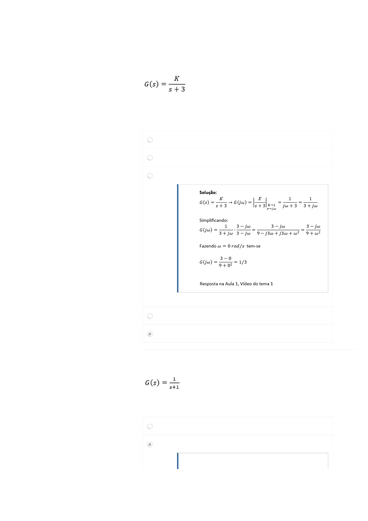 26/10/2018 AVA UNIVIRTUS http://univirtus-277877701.sa-east-1.elb.amazonaws.com/ava/web/#/ava/AvaliacaoUsuarioHistorico/320405/novo/2/57336 1/6 Questão 1/5 - Controle Discreto Dado um sistema em malha fechada com realimentação unitária, cuja função de transferência direta é dada por Determine o ponto inicial do diagrama de Nyquist. Nota: 0.0 A 1/4 B 1/2 C 1/3 D 2/3 E 2/5 Questão 2/5 - Controle Discreto Realize o mapeamento do ponto s = – 1 + j2, em F(s), sendo e F(s) = 1 + G(s) Nota: 20.0 A 2 + j1 B 1 – j0,5 Você acertou! 26/10/2018 AVA UNIVIRTUS http://univirtus-277877701.sa-east-1.elb.amazonaws.com/ava/web/#/ava/AvaliacaoUsuarioHistorico/320405/novo/2/57336 2/6 C –1 + j2 D –2 – j1 E 1 + j0,5 Questão 3/5 - Controle Discreto Dado um sistema em espaço de estados, na forma determine a matriz de controlabilidade Nota: 0.0 A B C D 26/10/2018 AVA UNIVIRTUS http://univirtus-277877701.sa-east-1.elb.amazonaws.com/ava/web/#/ava/AvaliacaoUsuarioHistorico/320405/novo/2/57336 3/6 E Questão 4/5 - Controle Discreto Dado um sistema em espaço de estados, na forma determine a matriz de observabilidade Nota: 0.0 A B C D E Questão 5/5 - Controle Discreto Considere a o seguinte diagramas de blocos, onde G(s) é a função de transferência direta e H(s) é a função de 26/10/2018 AVA UNIVIRTUS http://univirtus-277877701.sa-east-1.elb.amazonaws.com/ava/web/#/ava/AvaliacaoUsuarioHistorico/320405/novo/2/57336 4/6 transferência do ramo de realimentação. Para que um sistema seja estável pelo critério de Nyquist, ele deve satisfazer a condição data por Z = P + N em que, Z é número de zeros de 1 + G(s)H(s) no semiplano direito do plano s, N é o número de vezes que o ponto –1+j0 é envolvido no sentido horário, e P é o número de polos G(s)H(s) no semiplano direito do plano s. O diagrama de Nyquist do sistema em blocos é mostrado a seguir. 26/10/2018 AVA UNIVIRTUS http://univirtus-277877701.sa-east-1.elb.amazonaws.com/ava/web/#/ava/AvaliacaoUsuarioHistorico/320405/novo/2/57336 5/6 Com base nas informações do enunciado, analise as afirmativas e assinale a alternativa correta. I. O sistema é estável, pois Z = P + N. II. O sistema é estável, sendo Z = 3, P = 0 e N = 3. III. O sistema é instável, pois Z é diferente de P + N. IV. Z é igual a 3, N é igual a 0 e P é igual a 3. V. O sistema é estável, e N é igual a 3. Nota: 20.0 A Somente as afirmativas I, II e IV são corretas. B Somente a afirmativa III é correta. C Somente as afirmativas II, IV e V são corretas. D Somente as afirmativas I, IV e V são corretas. Você acertou! 26/10/2018 AVA UNIVIRTUS http://univirtus-277877701.sa-east-1.elb.amazonaws.com/ava/web/#/ava/AvaliacaoUsuarioHistorico/320405/novo/2/57336 6/6 E Somente as afirmativas I, II e V.
