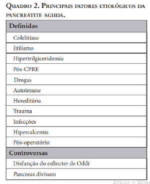 Pancreatite aguda → Processo inflamatório agudo do pâncreas com envolvimento variável de outros tecidos regionais ou sistemas orgânicos. → Na maioria dos casos é autolimitada e se resolve com medidas clínicas. → Pancreatite aguda grave = quadro de pancreatite aguda acompanhada de disfunção orgânica importante e/ou presença de complicações locais (necrose, abscesso ou pseudocisto) ou presença de mais de dois critérios de Ransom ou escore APACHE II maior que 8. Etiologia: A etiologia da Pancreatite determina o tratamento a ser empregado. 1) Colelitíase: ● Causa mais comum de pancreatite aguda! ● De 3 a 7% dos pacientes com litíase biliar desenvolvem quadro de pancreatite aguda → sexo masculino e cálculos pequenos 5mm. ● A obstrução da papila, pela presença do cálculo ou pelo edema secundário ao trauma de sua passagem pela papila, leva ao refluxo de bile para do ducto pancreático principal através de um “canal comum”; ou ocorreria obstrução dos ductos pancreáticos diretamente pelo cálculo, sem refluxo biliar. 2) Álcool: ● 5 a 10% dos alcoolistas são acometidos pela pancreatite aguda → multifatorial: fatores genéticos e ambientais. ● Fatores de risco: tabagismo, mutações nos genes CFTR (cystic fibrosis transmembrane conductance regulator) e SPINK1 (serine protease inhibitor kazal type 1) e sexo masculino. 3) Hipertrigliceridemia: ● 2% dos casos. ● Suspeitada quando o nível sérico de triglicerídeo > de 1000mg/dl → a dosagem de triglicerídeos deve ser solicitada para os pacientes que não apresentem outra causa óbvia. ● Elevações da amilase e lipase pouco acentuadas e a evolução clínica é semelhante aos casos de etiologia biliar. ● O tratamento da dislipidemia previne novos episódios de pancreatite aguda. 4) Pós CPRE: ● É a complicação mais comum da CPRE, ocorrendo em 5% dos pacientes submetidos ao exame. ● É frequente a elevação assintomática da amilase após a CPRE → presença de dor abdominal típica + elevação de, pelo menos, três vezes dos níveis séricos de amilase e lipase = pancreatite. 5) Drogas: ● Diversas drogas foram relacionadas com o desenvolvimento de pancreatite aguda. ● O quadro clínico tende a ser brando, evoluindo com resolução total após a suspensão do fármaco. 6) Autoimune: ● Quadro subagudo e os achados clínicos apresentam mais semelhança com os encontrados na pancreatite crônica → dor abdominal de leve a moderada e elevação discreta da amilase e lipase. ● Exames de imagem → aumento localizado do pâncreas, geralmente em sua porção cefálica com estenose ou irregularidades no ducto pancreático. ● Achados característicos → elevação dos níveis séricos de IgG4, presença de infiltrado linfoplasmocítico e elevados níveis de IgG4 no tecido pancreático. ● Tratamento → corticosteroides, com rápida melhora clínica e normalização dos achados tomográficos. 7) Hereditária e genética: ● Autossômico dominante com penetrância variável. ● Mutações do gene PRSS1 (protease, serina) → conversão prematura do tripsinogênio e autodigestão pancreática. ● Quadros redicivante de pancreatite aguda na infância que evoluem para pancreatite crônica. ● ↑ risco de desenvolvimento de câncer pancreático, principalmente se associado a outros fatores de risco como tabagismo e etilismo. Quadro clínico: Dor abdominal → constante, intensa, de aparecimento repentino, com localização epigástrica e irradiação para flancos e dorso, pode ser precipitada por ingestão excessiva de álcool ou alimentos. Melhora com o decúbito lateral e a flexão das coxas sobre o abdômen, além da aspiração gástrica e jejum. Náuseas e vômitos → frequentes e precoces, de natureza reflexa ou por compressão gástrica e/ou duodenal pelo pâncreas edemaciado. Parada de eliminação de gases e fezes e distensão abdominal. Hipotensão arterial, taquicardia, sudorese, febre, torpor, e coma → casos graves. Diagnóstico: ▪ Exame físico: Dor em hipocôndrio direito e/ou epigástrio com defesa muscular, mas raramente com descompressão dolorosa; Distensão abdominal e diminuição da peristalse em decorrência do íleo adinâmico determinado pelo processo inflamatório pancreático;Indicativos de hemorragia retroperitoneal que pode ocorrer em casos de pancreatite grave Sinal de Gray-Turner → equimose em flancos; Sinal de Cullen → equimose em região periumbilical. ▪ Exames laboratoriais: Principais: dosagens de amilase e lipase séricas! Lipase → exame laboratorial primário; alta sensibilidade e especificidade; se mantém elevado por vários dias. Amilase → marcador clássico da pancreatite. Alta sensibilidade e baixa especificidade. Leucocitose e hiperglicemia moderada → resultado da resposta inflamatória sistêmica. Elevação discreta das transaminases → caso haja elevação significativa de ALT (acima de 150 UI/l), a etiologia biliar deve ser fortemente suspeitada. ▪ Imagem: Tomografia computadorizada: Melhor exame de imagem para diagnosticar as lesões pancreáticas e estratificar a doença! Confirmar o diagnóstico clínico, determinar a etiologia, excluir outras causas de dor associadas à elevação de amilase/lipase e determinar a gravidade e a extensão da pancreatite aguda. Permite diagnosticar complicações → necrose, abscesso, pseudocisto. Possíveis achados: aumento do órgão, borramento da gordura peripancreática, áreas hipocaptantes de contraste no parênquima pancreático sugestivas de necrose. Radiografia de abdômen: Radiografias convencionais de abdômen e estudos contrastados do tubo digestivo. Úteis para ajudar no diagnóstico de PA e para demonstrar complicações relacionadas → abscessos e estreitamentos de alça intestinal ou fístulas. Não têm indicação na estratificação da gravidade. Ultrassonografia de abdome: Início da avaliação da pancreatite leve. Demonstra a extensão extra pancreátic