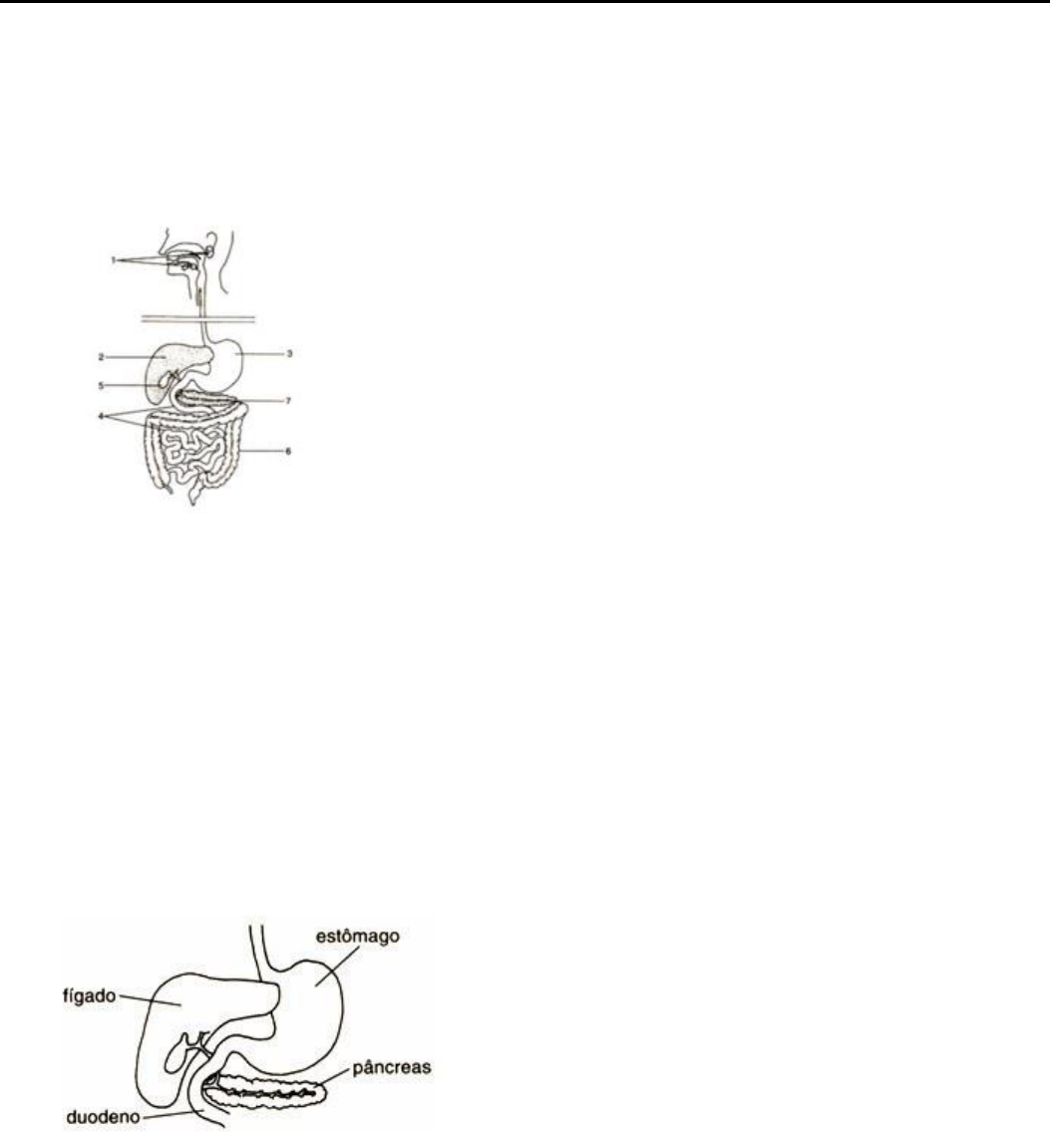 UNIVERSIDADE POTIGUAR - UNP ESTUDO DIRIGIDO DISCIPLINA – ESTRUTURA E FUNÇÃO AULA - Sistema Digestório: Aspectos do desenvolvimento, da macro e microscopia. SISTEMA DIGESTÓRIO 1) Observe o esquema abaixo: Identifique: a) os órgãos apontados pelas setas de um a sete. b) o local onde tem início a digestão das proteínas. c) o órgão que produz a bile. d) a região onde ocorre a absorção dos alimentos. 2) Analise o esquema que representa parte do sistema digestivo do homem. a) Qual o nível de acidez (pH) no estômago? b) No intestino delgado o pH gira em torno de oito. A que se deve a alcalinidade do meio intestinal? c) Sobre que substrato alimentar atua a pepsina do estômago? d) Qual a função da bile produzida pelo fígado? 3) O esquema abaixo representa uma seção do tubo digestivo humano com alguns anexos. Observe as indicações e resolva os itens a) Cite o nome do substrato digerido pela principal enzima produzida em I. b) Qual a função da substância armazenada em IV? c) Pacientes com problemas de metabolismo da glicose podem apresentar disfunção de secreção endócrina do anexo indicado por qual número? 4. Além de sua função digestiva, o pâncreas atua ativamente na coordenação hormonal, já que é também uma glândula endócrina. Assinale a opção que apresenta respectivamente os papéis digestivo e de coordenação. a) Emulsão de gorduras e liberação de aldosterona. b) Liberação de pepsina e produção de gastrina. c) Acidificação do quimo e liberação de tripsina. d) Desaminação de aminoácidos e produção de insulina. e) Desdobramento do amido e produção de glucagon. 5. Em uma amostra retirada do tubo digestivo de uma pessoa que se alimentara há duas horas, foram encontrados lipídios, peptídios e maltose, em pH baixo. Pode-se concluir que o material foi coletado a) da boca. b) do esôfago. c) do duodeno. d) do estômago. e) do intestino grosso. 6. Uma pessoa que tenha sofrido uma cirurgia para retirada do estômago deverá ter prejuízo, principalmente, na digestão de: a) proteínas. b) amido. c) lipídios. d) ácidos nucléicos. e) vitaminas. 7. Em qual das alternativas a seguir as três funções mencionadas são realizadas pelo fígado? a) Regular o nível de glicose no sangue, transformar amônia em uréia, produzir bile. b) Regular o nível de glicose no sangue, transformar amônia em uréia, secretar quimotripsina. c) Regular o nível de glicose no sangue, produzir ácido clorídrico, secretar quimotripsina. d) Produzir bile, transformar amônia em uréia, produzir ácido clorídrico. e) Produzir bile, produzir ácido clorídrico, secretar quimotripsina. 8. A abertura que leva à laringe fica na parte de trás da língua, em frente ao esôfago. Isso significa que ar e alimento compartilham a mesma passagem. Qual é o mecanismo que impede o alimento de entrar na laringe e bloquear a traquéia? Se isso acontecer, como nosso corpo reage? 9. Quantas e quais são as glândulas salivares humanas? 10. Quais são os segmentos do tubo digestivo humano desde a entrada do alimento até a eliminação dos detritos fecais. 11. Quais são as glândulas anexas ao tubo digestivo humano? 12. A faringe é um órgão comum a dois sistemas orgânicos. Quais são esses sistemas? 13. Considere o seguinte texto: "... o órgão responsável pela digestão (...) acha-se escondido na profundidade de nosso abdômen, bem protegido, colado na parede lá atrás (...) uma pequena massa que pesa menos de 100 g, mas constitui um laboratório maravilhoso (...) seus sucos são tão poderosos que são capazes de atacar qualquer tipo de comida (...)" O órgão, a que o texto se refere, é: a) o intestino delgado. b) a vesícula biliar. c) o estômago. d) o pâncreas. e) o fígado. 14. aspectos anatômicos de órgãos da digestão, no homem: I - Se classificam em parótidas, sublinguais e submandibulares II - É um canal de contrações voluntárias que desloca o alimento para o esôfago III - Realiza movimentos peristálticos involuntários, com o objetivo de deslocar o bolo alimentar para o estômago a) glândulas salivares, intestino e esôfago b) língua, intestino e esôfago c) língua intestino e faringe d) glândulas salivares, faringe e esôfago 15. O sufocamento por alimento é responsável por quase 3.000 mortes, anualmente, nos EUA, mais do que os acidentes com armas de fogo ou aviões. O sufocamento ocorre quando uma porção do alimento bloqueia o(a): a) brônquio. b) esôfago. c) glote. d) laringe. e) faringe. 16. Algumas pessoas se submetem a uma cirurgia de diminuição do estômago, como auxiliar no processo de emagrecimento. Esse procedimento tem como finalidade: a) a diminuição da digestão de gorduras e carboidratos, processo que ocorre nesse órgão. b) a diminuição da superfície de absorção de nutrientes. c) fazer com que o indivíduo se sinta saciado com menor quantidade de alimento. d) aumentar a velocidade dos movimentos peristálticos, eliminando mais rápido o bolo fecal. e) alterar o pH do meio, dificultando a digestão total do alimento. 17. Uma pessoa cujas glândulas gástricas não estão produzindo ácido clorídrico, certamente terá dificuldades na digestão de: a) amido. b) vegetais. c) açúcares. d) gorduras. e) proteínas.