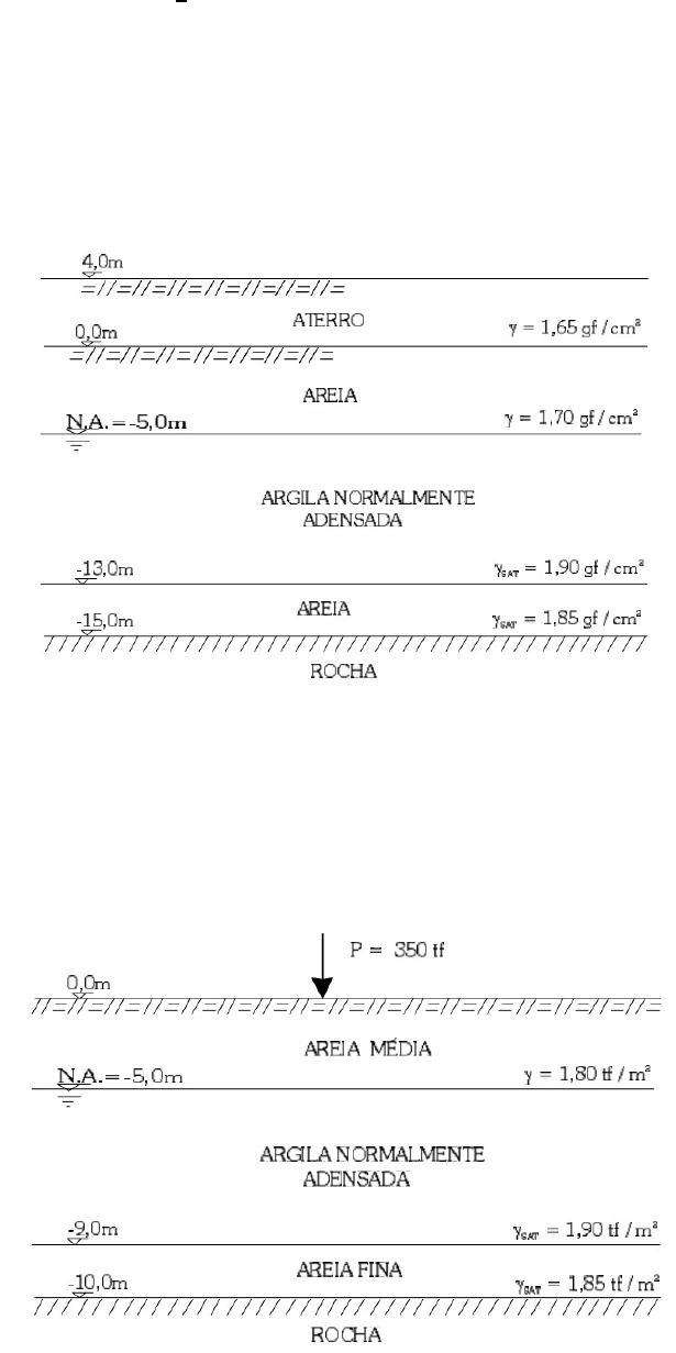 MECÂNICA DOS SOLOS II Período: 2019.2 1 2a Lista de Exercícios 1. Qual será o tempo necessário para que ocorra um recalque por adensamento de 33 cm, causado pelo aterro construído recentemente numa extensa área, esquematizado no perfil abaixo. Dados da camada de argila: CC = 0,6; CV = 10-4 cm²/s; eo = 1,2. PERFIL: Resposta: 9,072 x 108 segundos 2. Calcular o recalque sob o ponto de aplicação da sobrecarga considerada como concentrada, devido ao adensamento da camada de argila, para um tempo de adensamento de 6 x 106 segundos. Dados da camada de argila: CC = 0,50; CV = 3 x 10-4 cm²/s ; eo = 1,2 Resposta: recalque = 2,6 cm 3. Na fundação direta em sapatas circulares, esquematizada abaixo, determinar: 1º) o recalque diferencial total entre os centros das sapatas; MECÂNICA DOS SOLOS II Período: 2019.2 2 2º) o tempo necessário para que ocorra um recalque de 4,43 cm no centro da sapata A. As taxas de cargas transmitidas pelas sapatas A e B são de 1,8 kgf/cm² e 1,5 kgf/cm², respectivamente, devendo-se ainda levar em conta o efeito das escavações previstas. Os acréscimos de pressão devidos a sobrecargas, deverão ser calculados pelo método de Newmark 4. Para o perfil esquematizado abaixo calcular: a) o máximo recalque que ocorrerá no centro do radier de 5,0 m x 5,0 m construído recentemente; b) os tempos necessários para que ocorra 40% de adensamento em cada camada compressível. Carga total da obra incluindo o peso do radier = 1000 tf. A argila das duas camadas têm as mesmas características: G = 2,7 e CV = 2 x 10-4 cm2/s. Estes dados referem-se aos planos médios das camadas de argila. MECÂNICA DOS SOLOS II Período: 2019.2 3 5. Os gráficos apresentados a seguir, representam os resultados de um ensaio de adensamento com dupla drenagem, realizado com uma amostra indeformada de argila. Determinar graficamente (Casagrande e Pacheco-Silva) sabendo que e0=0,710: a) o seu índice de compressão; b) a sua pressão de pré-adensamento; c) o estado da amostra, sabendo-se que a pressão efetiva sobre ela no solo era de 30 tf/m²; d) O coeficiente de adensamento da amostra.