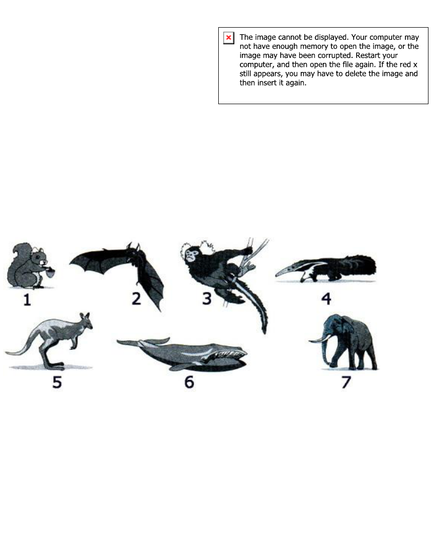 Escola municipal Maria Herriqueta Rebuá Siufi. Miranda MS- ___/___/___. Aluno(A)_______________________ Nº_____7ª ano E.F. Prof. Elinete. Exame de Ciências 1-Os animais abaixo representados são bastante diferentes na sua aparência, mas apresentam várias características comuns. Entre essas características NÃO se inclui: a) fecundação interna. b) oviparidade. c) homeotermia. d) respiração pulmonar 2- Sobre os mamíferos, marque a alternativa incorreta: a) Pêlos, glândulas sebáceas, dentes diferenciados e a presença de mamas caracterizam os mamíferos. b) Mamíferos são homeotérmicos. c) Todas as fêmeas de mamíferos são vivíparas. d) A pele dos mamíferos, em geral, é rica em queratina e recoberta por pelos. 3- (CESGRANRIO) As figuras abaixo, indicadas por números, ilustram vários tipos de mamíferos. Assinale a opção que indica o grupo a que pertencem as respectivas figura: a) Edentata, Marsupialia, Rodentia, Cetacea, Proboscidea, Chiroptera e Primates. b) Rodentia, Chiroptera, Primates, Edentata, Marsupialia, Cetacea e Proboscídea. c) Primates, Edentata, Proboscidea, Cetacea, Rodentia, Chiroptera e Marsupialia. d) Marsupialia, Primates, Chiroptera, Proboscidea, Rodentia, Edentata e Cetácea. e) Proboscidea, Cetacea, Marsupialia, Rodentia, Primates, Chiroptera e Edentata. 4- (UFLA) Presença de coluna vertebral, respiração pulmonar, fecundação interna, ovo com casca dura e homeotermia, são características relativas à classe: a) Aves. b) Répteis. c) Mamíferos. e) Anfíbios. 5- A quais classes de vertebrados pertencem os animais representados nas figuras? a) ________________________________ b) ________________________________ 6- Complete as lacunas do texto abaixo, que trata dos três principais grupos de répteis. As tartarugas, os cágados e os jabutis fazem parte dos_________________ , caracterizados pela__________ dura em volta do tronco. Os______________________ , como jacarés e crocodilos, são caracterizados pelos focinhos longos com dentes afiados e pelas______________ que formam uma couraça protetora. Lagartos e serpentes são do grupo chamado__________________ . São caracterizados por possuírem_______________________ . 7- Marque as afirmativas abaixo com (V) para verdadeiro ou (F) para falso: ( ) Anfíbios, répteis, aves e mamíferos são considerados tetrápodes. ( ) Todos os representantes do Subfilo Vertebrata possuem vértebras. ( ) Condrictes são animais aquáticos, dotados de esqueleto cartilaginoso. ( ) A Classe Amphibia é representada somente pelos sapos, rãs e pererecas. 8- Na Classe Mammalia, quando nos referimos aos cetáceos, quirópteros, carnívoros, roedores e edentados, estamos falando dos seguintes animais: A) Baleia, morcego, tigre, rato e tatu. B) Peixe-boi, canguru, tigre, coelho e zebra. C) Peixe-boi, morcego, rato, porco e tatu. D) Baleia, canguru, tigre, rato e zebra. E) Peixe-boi, morcego, tigre, porco e zebra. 9- -Escreva duas características para: a)mamíferos _________________________________________________________________ b)répteis ____________________________________________________________________ c)anfíbios ___________________________________________________________________ d)aves ______________________________________________________________________ e)peixes _____________________________________________________________________ 10- Observe a tirinha e responda: a) A qual classe e ordem pertencem os morcegos? b) Quais são as principais diferenças entre insetos e o morcego?