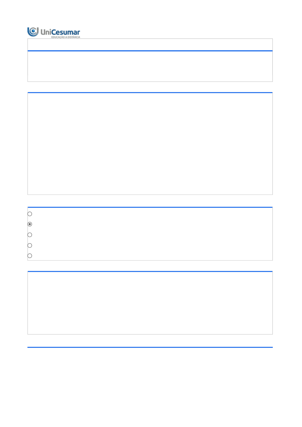 ATIVIDADE 3 - ENG SOFT - ALGORITMOS E LÓGICA DE PROGRAMAÇÃO I - 2019B Período: 03/06/2019 08:00 a 18/06/2019 23:59 (Horário de Brasília) Status:ENCERRADO Nota máxima: 0,50 Gabarito:Gabarito será liberado no dia 19/06/2019 00:00 (Horário de Brasília) Nota obtida:0,35 1ª QUESTÃO Analise o pseudocódigo abaixo: Algoritmo Impressora var ___________, papel: inteiro inicio escreva("Informe a quantidade de cópias que serão impressas") ___________________ __________________________________________ escreva("Imprimindo ", papel, " de ", copias) fim_para fim. A partir do pseudocódigo apresentado acima, complete as lacunas na ordem que segue: ALTERNATIVAS copias, leia (copias), para copias de 1 copias 1 faca copias, leia (copias), para papel de 1 ate copias passo 1 faca copias, leia (papel), para papel de 1 ate copias passo 1 faca copias, leia (papel), para papel de 1 ate copias passo 2 faca copias, leia (copias, papel), para papel de 1 ate papel passo 1 faca 2ª QUESTÃO Dada a matriz abaixo, analise-a: 12 22 32 15 25 35 17 27 37 Dentro do contexto de matriz, declare a matriz valores e some todos os seus elementos utilizando a estrututa de repetição para. Assuma que a matriz já está preenchida, e que as outras variáveis utilizadas estão declaradas. ALTERNATIVAS valores: vetor 1..3, 1..3 de inteiro somador<-0 para i de 1 ate 3 passo 1 faca para j de 1 ate 3 passo 1 faca somador<-somador+valores i, j fim_para fim_para valores: vetor 1..3, 1..3 de inteiro somador<-12 para i de 1 ate 3 passo 1 faca para j de 1 ate 3 passo 1 faca somador<-somador+valores i, j fim_para fim_para para i de 1 ate 3 passo 1 faca para j de 1 ate 3 passo 1 faca somador<-somador+valores i, i fim_para fim_para valores: vetor 1..3, 1..3 de inteiro para i de 1 ate 3 passo 1 faca somador<-0 para j de 1 ate 3 passo 1 faca somador<-somador+valores i, j fim_para fim_para valores: vetor 1..3, 1..3 de inteiro somador<-0 para i de 1 ate 3 passo 1 faca para j de 1 ate 3 passo 1 faca somador<-valores i, j fim_para fim_para 3ª QUESTÃO A estrutrutura de dados heterogêna diferentemente da estrutura homogênea que aceita apenas um tipo de dado, a heterogênea aceita diversas diversos tipos, este recurso é muito utilizado para armazenamento de registros. Dentro do contexto acima, assinale a alternativa que declare um registro do tipo Produto, e que tenha os campos, codigo, nome, quantidade, preco com os seus respectivos campos: inteiro, caractere, inteiro, real. ALTERNATIVAS Tipo registro = Produto codigo: inteiro nome: caractere quantidade: inteiro preco: real fim_registro Tipo Produto = registro codigo: inteiro nome: caractere quantidade: inteiro preco: real fim_registro Produto = registro codigo: inteiro nome: caractere quantidade: inteiro preco: real fim_registro Produto = registro codigo: inteiro nome: caractere quantidade: inteiro preco: real fim. Tipo Produto = registro inteiro: codigo caractere: nome inteiro: quantidade real: preco fim_reg 4ª QUESTÃO Dentro da estrutura homogenea, temos os vetores e matrizes, sendo estes, recursos muito utilizados pelos desenvolvedores para armazenar múltiplos valores e passar por parâmetro na chamada de funções por exemplo. O vetor em específico, armazena multiplos valores em apenas uma dimensão de um tipo de dado em uma única variavel. Dentro do contexto apresentado, assinale a alternativa correta que crie e armazene em vetor de real, os valores de depósitos bancários de uma pizzaria durante 5 dias. Assuma, que o restante do algoritmo e a variável dia estejam declaradas. I - depositos: vetor 1..5 de real; para dia de 1 ate 5 passo 1 faca leia(depositos dia ) fim_para II - depositos: vetor 1..5 de real; dia<-1 enquanto (dia <= 5) faca leia(depositos dia ) dia<-dia + 1 fim_enquanto III - depositos: vetor 1..5 de real; dia<-1 repita leia(depositos dia ) dia<-dia + 1 ate_que(dia>5) IV - depositos: vetor 1..5 de inteiro para dia de 1 ate 5 passo 1 faca leia(depositos dia ) fim_para V - dia<-0 enquanto (dia <= 5) faca leia(depositos dia ) dia<-dia + 1 fim_enquanto É correto o que se afirma em: ALTERNATIVAS I e II, apenas. I e V, apenas. II e IV, apenas. I, II e III, apenas. I, II, III, IV e IV. 5ª QUESTÃO Observe o algoritmo: algoritmo exemplo var x, y, z : inteiro início x := 0 y := 0 z := 0 enquanto (x > z) faça y := y + x x := x + 1 escreva(y) fim_enquanto escreva(y) fim. Agora, analise as afirmativas a seguir: I – O valor da variável “y” será escrito na tela (N + 1) vezes, pois N é o número de repetições do laço ENQUANTO. II – Na tela do usuário aparecerá: 0. III – Na tela do usuário aparecerão os valores 0, 1, 3, 6. IV – Na tela do usuário aparecerão os valores 0, 1, 3, 6, 6. É correto o que se afirma em: ALTERNATIVAS I e II, apenas. II e III, apenas. I, II e IV, apenas. I, III e IV, apenas. I, II, III e IV. 6ª QUESTÃO Estruturas de dados HOMOGÊNEAS são estruturas que agrupam diversas informações do mesmo tipo em uma única variável. Essas estruturas homogêneas são divididas em estruturas unidimensionais e multidimensionais. Considerando o assunto exposto, analise as afirmações seguintes: I – Os PROCEDIMENTOS são exemplos de estruturas UNIDIMENSIONAIS. II – As MATRIZES são exemplos de estruturas MULTIDIMENSIONAIS. III – Os VETORES são exemplos de estruturas UNIDIMENSIONAIS. IV – Os REGISTROS são exemplos de estruturas UNIDIMENSIONAIS E MULTIDIMENSIONAIS. É correto o que se afirma em: ALTERNATIVAS I e II, apenas. II e III, apenas. I, II e IV, apenas. I, III e IV, apenas. I, II, III e IV. 7ª QUESTÃO No dia a dia um programador, geralmente, encontra problemas complexos e abrangentes. Para resolver esse tipo de problema o primeiro passo consiste em decompô-lo em subproblemas para assim facilitar o processo de entendimento, análise e resolução. Na solução dos subproblemas são utilizadas sub-rotinas, bloco de instruções que realizam tarefas específicas. Na literatura encontramos, também, os termos subalgo