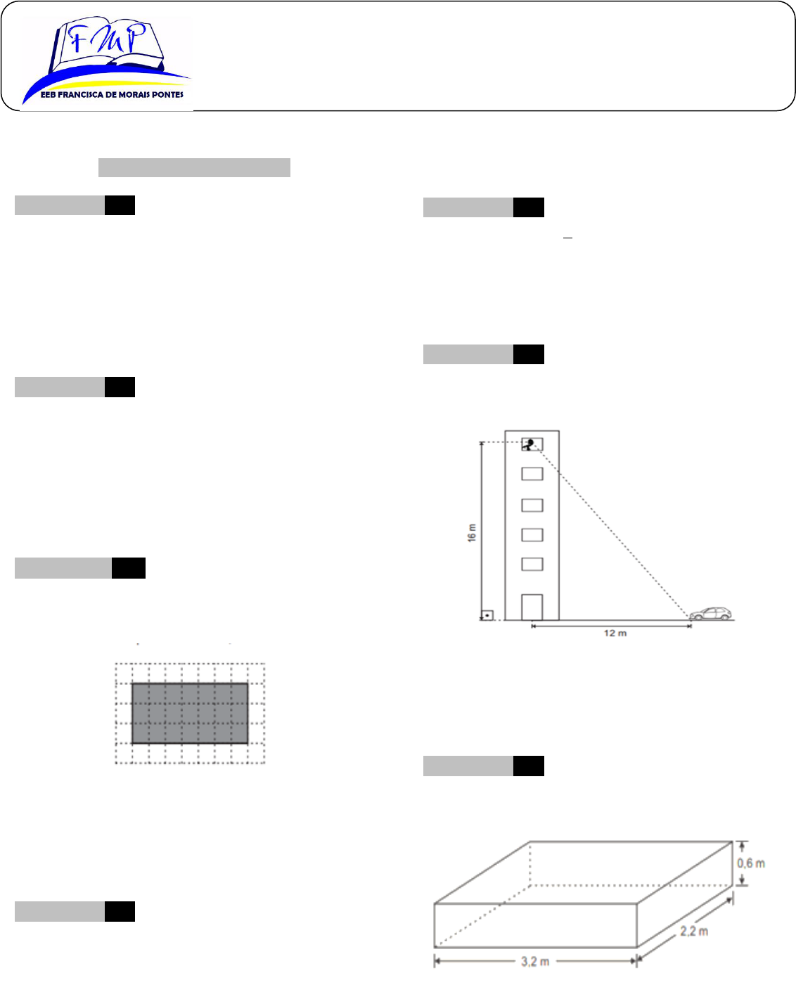 E. E. B Francisca de Morais Pontes 6º Simulado de Matemática Nome: ___________________________________________Nº. ____Data ____/____ /____ Simulado SPAECE - 2018 Professoras: Leilane Montenegro 9º Ano ______ BLOCO I – MATEMÁTICA D67 Questão 1 ––––––––––––––––––––––––––––––| Um campo de futebol tem forma retangular com 105 metros de comprimento e 70 metros de largura. Quantos metros quadrados, no mínimo, são necessários para cobrir toda a superfície desse campo de futebol? (A) 175 (B) 350 (C) 3675 (D) 7350 D17 Questão 2 –––––––––––––––––––––––––––––––| Lucas tem uma dívida de R$ 5.000,00 com o banco. No mês de outubro, ele conseguiu pagar 30% dessa dívida. Qual foi a quantia paga por Lucas, no mês de outubro, referente a essa dívida? (A) R$ 30,00 (B) R$ 50,00 (C) R$ 1.500,00 (D) R$ 3.500,00 D65 Questão 3 –––––––––––––––––––––––––––––––| Uma empresa encomendou de um fornecedor uma placa e acrílico cujas dimensões equivalem as da figura colorida em cinza na malha quadriculada abaixo, onde o lado de cada quadradinho equivale a 10 cm. Para a proteção dessa placa durante o transporte, foi utilizada uma fita autocolante e emborrachada em todo o seu contorno. Quantos centímetros dessa fita, no mínimo, o fornecedor utilizou para proteger a placa de acrílico? (A) 24 (B) 45 (C) 200 (D) 210 D18 Questão 4 –––––––––––––––––––––––––––––––| Com 2,5 kg de farinha de trigo, foram feitos 30 pães. Para fazer 90 pães, quantos quilogramas de farinha de trigo serão necessários? (A) 7,5 kg (B) 22,5 kg (C) 75 kg (D) 225 kg D13 Questão 5 –––––––––––––––––––––––––––––––| Mauricio gasta por mês do seu salário com alimentação. Esse gasto mensal corresponde a qual percentual de seu salário? (A) 0,2 % (B) 1,5% (C) 2% (D) 20% D50 Questão 6 ––––––––––––––––––––––––––––––| Um observador, da janela de um edifício, avista um carro parado a 12 metros de distância da entrada da portaria do seu prédio, conforme o desenho abaixo. Considerando essa rua plana, a distância, em metros, entre o carro e o observador, nesse momento é (A) 20 (B) 28 (C) 96 (D) 400 D69 Questão 7 –––––––––––––––––––––––––––––––| Uma caixa d’ água tem a forma de paralelepípedo retângulo e as dimensões apresentadas na figura abaixo. Qual é a capacidade máxima, em m3, dessa caixa d’ água? (A) 4,200 (B) 4,204 (C) 4,224 (D) 4,284 D07 Questão 8 –––––––––––––––––––––––––––––––| Um artista plástico irá construir, em uma parede de sua casa, um mosaico feito de quadrados de madeira. Para produzi-los, comprou placas retangulares de madeira, cujas as dimensões são 256 cm e 96 cm e cortou os quadrados com o maior lado possível, de forma que não houvesse desperdício e a placa fosse usada completamente. Qual é a medida em centímetro, dos lados dos quadrados que o artista cortou? (A) 32 (B) 40 (C) 80 (D) 96 D76 Questão 9 –––––––––––––––––––––––––––––––| No gráfico abaixo está representado o número de reatores nucleares em operação em alguns países. De acordo com o gráfico, qual é o número total de reatores em operação que esses países possuem? (A) 91 (B) 104 (C) 127 (D) 268 D67 Questão 10 –––––––––––––––––––––––––––––––| Carla utilizou um molde com o formato de um trapézio para fazer um ladrilho de argila conforme representado no desenho abaixo. A área do ladrilho de argila em relação a área do molde é (A) a metade. (B) a quarta parte. (C) o dobro. (D) o quádruplo. D10 Questão 11 ––––––––––––––––––––––––––––––| Um estagiário recebe uma bolsa-estágio fixa de R$ 555,00 e uma ajuda de custo de R$ 15,00 por cada dia trabalhado. Sabendo-se que, ao final de um mês de trabalho, ele recebeu um salário de R$ 855,00, quantos dias ele trabalhou? (A) 19 (B) 20 (C) 37 (D) 57 D26 Questão 12 –––––––––––––––––––––––––––––––| Maria disse a seus colegas: Quantos bombons Maria tem? (A) 6 (B) 5 (C) 4 (D) 3 D52 Questão 13 –––––––––––––––––––––––––––––––| Observe o dado representado pela figura abaixo. Que planificação corresponde a esse dado? BLOCO II– MATEMÁTICA D67 Questão 27 –––––––––––––––––––––––––––––––| Observe o círculo a seguir: Adote π=3,14. A área desse círculo é igual a (A) 37,68 cm2. (B) 59,16 cm2. (C) 113,04 cm2. (D) 226,08 cm2. D67 Questão 28 ––––––––––––––––––––––––––––––| O terreno do Sr. Lucas tem a forma de um trapézio, conforme a figura abaixo. A área total do terreno é (A) 21 m2 (B) 29 m2 (C) 48 m2 (D) 49 m2 D11 Questão 29 –––––––––––––––––––––––––––––––| O número -18/5 está localizado entre (A) -4 e -3. (B) -3 e -2. (C) -2 e -1. (D)2 e 3 D65 Questão 30 –––––––––––––––––––––––––––––––| Seu Artur deseja cercar com tela de arame, um canteiro que tem as medidas indicadas na figura abaixo. Se cada metro de tela custa R$ 3,00, quanto Seu Artur vai gastar? (A) R$ 39,40 (B) R$ 116,20 (C)R$ 117,20 (D)R$ 118,20 D19 Questão 31 –––––––––––––––––––––––––––––––| Daiane precisou pegar u