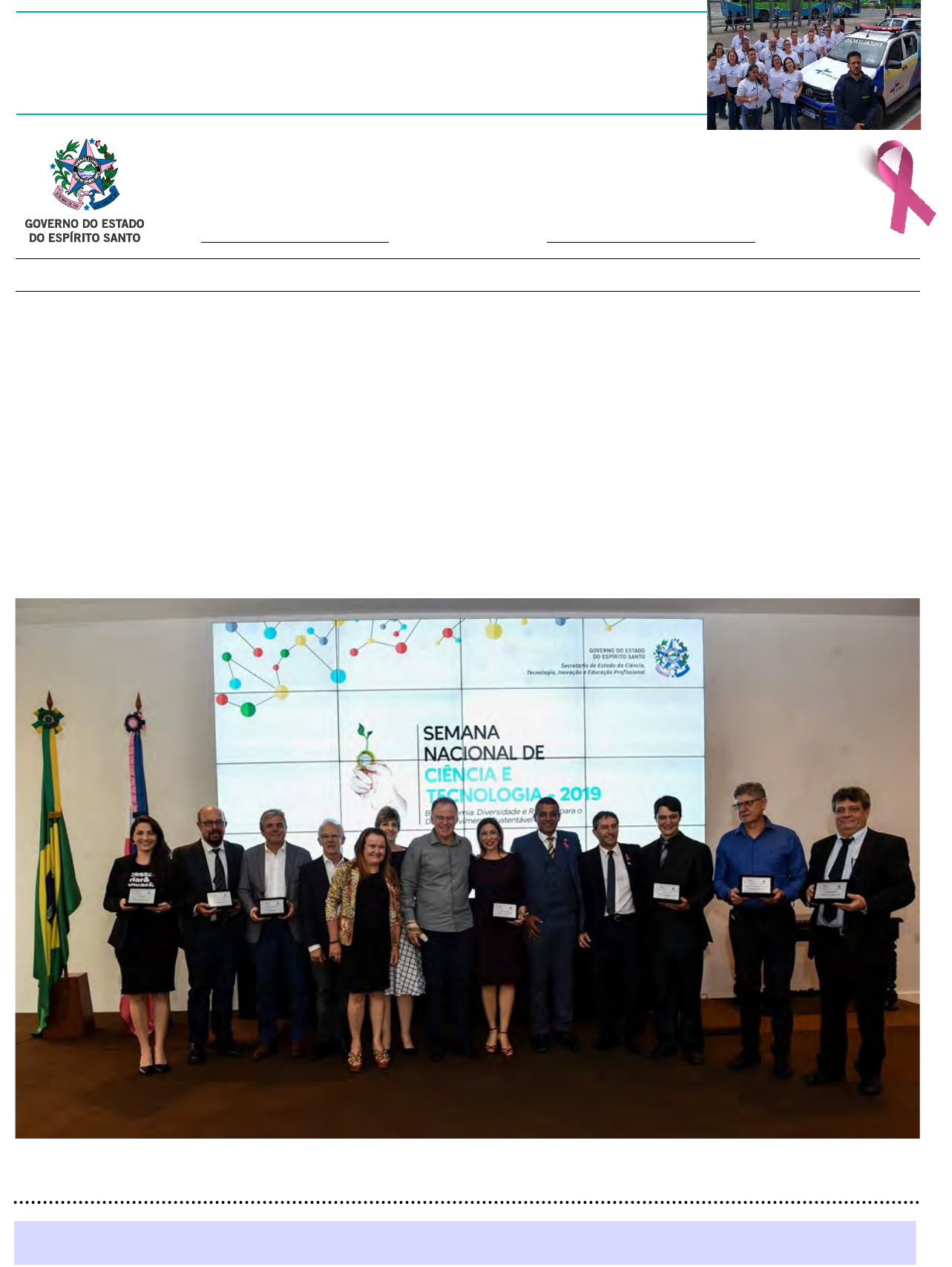 ESPÍRITO SANTO G O V E R N O D O E S T A D O w w w . d i o . e s . g o v . b r Desde 1890 A população capixaba passará a contar, a partir de ontem (23), com os serviços dos agentes de trânsito do Departamento Estadual de Trânsito do Espírito Santo (Detran|ES), que foram aprovados em curso de formação e poderão autuar infrações em blitze integradas e fiscalizar empresas credenciadas ao Órgão. A formatura da primeira turma, com 20 agentes, foi realizada na Sede do Detran|ES, em Vitória. Página 6 D IV U LG A Ç Ã O Casagrande abre a 16º Semana Estadual de Ciência e Tecnologia >>> Uma solenidade no Palácio Anchieta, em Vitória, marcou a abertura oficial da 16ª Semana Estadual de Ciência e Tecnologia. A edição terá como tema “Bioeconomia: Diversidade e Riqueza para o De- senvolvimento Sustentável”. A programação inclui palestras, oficinas e a exposição de mais de 100 projetos técnico-científicos. O evento acontece hoje (24) e sexta-feira (25) no Centro Estadual de Educa- ção Técnica (CEET) Vasco Coutinho, em Vila Velha, e conta com alguns eventos em outros municípios. A abertura oficial teve a participação do governador do Estado Renato Casagrande. Página 3 O evento acontece hoje (24) e sexta-feira (25) no Centro Estadual de Educação Técnica (CEET) Vasco Coutinho, em Vila Velha >>> Durante a solenidade de abertura da 16ª Semana Estadual de Ciência e Tecnologia, a Secretaria, por meio do Conselho Estadual de Ciência e Tecnologia (Concitec), homenageou personalidades e instituições que se destacaram nas áreas de C&T no Espírito Santo Cresce a taxa de ocupação hoteleira nos municípios da Grande Vitória Página 7 H ÉL IO F IL H O / SE C O M -E S Vitória (ES), Quinta-feira, 24 de Outubro de 2019 2 GOVERNO DO ESTADO DO ESPÍRITO SANTO Vitória (ES), Quinta-feira, 24 de Outubro de 2019 JACQUELINE MORAES DA SILVA Vice-goVernadora JOSÉ RENATO CASAGRANDE goVernador goVerno do eSTado Secretários de Estado DIRETORIA MADALENA SANTANA GOMES Diretora-presidente EDGARD RAMOS LIMA Diretor Administrativo e Financeiro Av. Marechal Mascarenhas de Moraes, 2375 Bento Ferreira, Vitória - ES CEP: 29050-625 Telefone: (27) 3636-6929 Fax: (27) 3636-6904 Filiado à Abio Associação Brasileira de Imprensas Oficiais iMPrenSa oFiciaL do eSPÍriTo SanTo (dio/eS) Os textos publicados são produzidos pela Rede de Comunicação do Governo do Espírito Santo. FUNDADO EM 23 DE MAIO DE 1890 TYAGO RIBEIRO HOFFMANN Governo 3636-1221 LENISE MENEZES LOUREIRO Gestão e Recursos Humanos 3636-5200 ROGELIO PEGORETTI CAETANO AMORIM Fazenda 3347-5501 ÁLVARO ROGÉRIO DUBOC FAJARDO Economia e Planejamento 3636-4255 RODRIGO FRANCISCO DE PAULA Procurador Geral do Estado 3636-5051 EDMAR MOREIRA CAMATA Controle e Transparência 3636-5352 VITOR AMORIM DE ANGELO Educação 3636-7702 NÉSIO FERNANDES DE MEDEIROS JUNIOR Saúde 3347-5647 ANTONIO ROBERTO CESÁRIO DE SÁ Segurança Pública e Defesa Social 3636-1500 LUIZ CARLOS DE CARVALHO CRUZ Justiça 3636-5700 BRUNO LAMAS SILVA Trabalho, Assistência e Desenvolvimento Social 3636-6821 NARA BORGO CYPRIANO MACHADO Direitos Humanos 3636-1443 FABRICIO HÉRICK MACHADO Meio Ambiente e Recursos Hídricos 3636-2500 PAULO ROBERTO FOLETTO Agricultura, Abastecimento, Aquicultura e Pesca 3636-3703 MARCUS ANTÔNIO VICENTE Saneamento, Habitação e Desenvolvimento Urbano 3636-5041 FABRÍCIO NORONHA FERNANDES Cultura 3636-7100 CRISTINA ENGEL DE ALVAREZ Ciência, Tecnologia, Inovação e Educação Profissional 3636-1801 JÚNIOR ABREU Esportes e Lazer 3636-7019 DORVAL DE ASSIS ULIANA Turismo 3636-8001 FLÁVIA REGINA DALLAPICOLA TEIXEIRA MIGNONI Superintendente Estadual de Comunicação Social 3636-4350 MARCOS KNEIP NAVARRO Desenvolvimento 3636-9701 FÁBIO NEY DAMASCENO Mobilidade e Infraestrutura | 3636-9600 DAVI DINIZ DE CARVALHO Casa Civil | 3636-1495 JOCARLY MARTINS DE AGUIAR JUNIOR Casa Militar 3636-1350 GILMAR ALVES BATISTA Defensor Público-Geral gabinete@defensoria.es.def.br - 3198-3300 VINICIUS CHAVES DE ARAÚJO Subdefensor Público-Geral subdefensoria@defensoria.es.def.br - 3198-3300 Defensoria Pública LÍVIA SOUZA BITTENCOURT Corregedora-Geral corregedoria@defensoria.es.def.br - 3198-3300 Ministério Público Estadual SÉRGIO LUIZ TEIXEIRA GAMA Presidente presidente@tjes.jus.br - 3334-2007 NEY BATISTA COUTINHO Vice-presidente vicepresidente@tjes.jus.br - 3334-2190 Tribunal de Justiça SAMUEL MEIRA BRASIL JÚNIOR Corregedor-geral da Justiça corregedor@tjes.jus.br - 3145-3101 EDER PONTES DA SILVA Procurador-geral de Justiça gabinetepgj@mpes.mp.br - 3194-4510 JOSEMAR MOREIRA Subprocurador-geral de Justiça Judicial subjudicial@mpes.mp.br - 3194-5103 ELDA MÁRCIA MORAES SPEDO Subprocuradora-geral de Justiça Administrativo spga@mpes.mp.br - 3194-5119 Tribunal de Contas LUCIANO MACHADO Primeiro secretário raquellessa@al.es.gov.br - 3382-5221 DR. EMILIO MAMERI Segundo secretário enivaldodosanjos@al.es.gov.br - 3382-5220 MARCELO SANTOS Primeiro Vice-presidente marcelosantos@al.es.gov.br - 3382-5206 ERICK MUSSO Presidente erickmusso@al.es.gov.br - 3382-3590 HUDSON LEAL Corregedor-geral corregedoria@al.es.gov.br - 3382-3811 LORENZO PAZOLINI Ouvidor-geral ouvidoria@al.es.gov.br - 3382-3845 Assembleia Legislativa LUCIANO VIEIRA Procurador-geral do Ministério Público Especial de Contas luciano.vieira@tce.es.gov.br - 3334-7608 RODRIGO FLÁVIO FREIRE FARIAS CHAMOUN Corregedor gc.rodrigo.chamoun@tce.es.gov.br - 3334-7712 SEBASTIÃO CARLOS RANNA DE MACEDO Ouvidor gc.carlos.ranna@tce.es.gov.br - 3334-7701 DOMINGOS AUGUSTO TAUFNER Vice-presidente domingos.taufner@tce.es.gov.br - 3334-7697 SÉRGIO ABOUDIB FERREIRA PINTO Presidente sergio.aboudib@tce.es.gov.br - 3334-7706 ALEXANDRE JOSÉ GUIMARÃES Subprocurador-geral de Justiça Institucional subinstitucional@mpes.mp.br - 3194-5076 goVerno onLine oUVidoria www.facebook.com/governoes @governoes @governoes@governoes www.es.gov.br @governoes www.ouvidoria.es.gov.br 0800 022 11 17 Assinado digitalmente pel