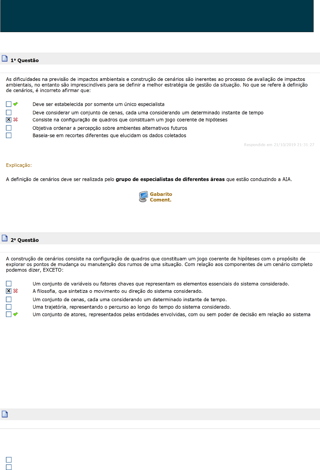 Exercício: CCE1805_EX_A7_201902382471_V1 21/10/2019 Aluno(a): ALEXANDRE MACHADO DUQUE 2019.3 EAD Disciplina: CCE1805 - ANÁLISE DE IMPACTOS AMBIENTAIS 201902382471 1a Questão As dificuldades na previsão de impactos ambientais e construção de cenários são inerentes ao processo de avaliação de impactos ambientais, no entanto são imprescindíveis para se definir a melhor estratégia de gestão da situação. No que se refere à definição de cenários, é incorreto afirmar que: Deve ser estabelecida por somente um único especialista Deve considerar um conjunto de cenas, cada uma considerando um determinado instante de tempo Consiste na configuração de quadros que constituam um jogo coerente de hipóteses Objetiva ordenar a percepção sobre ambientes alternativos futuros Baseia-se em recortes diferentes que elucidam os dados coletados Respondido em 21/10/2019 21:31:27 Explicação: A definição de cenários deve ser realizada pelo grupo de especialistas de diferentes áreas que estão conduzindo a AIA. Gabarito Coment. 2a Questão A construção de cenários consiste na configuração de quadros que constituam um jogo coerente de hipóteses com o propósito de explorar os pontos de mudança ou manutenção dos rumos de uma situação. Com relação aos componentes de um cenário completo podemos dizer, EXCETO: Um conjunto de variáveis ou fatores chaves que representam os elementos essenciais do sistema considerado. A filosofia, que sintetiza o movimento ou direção do sistema considerado. Um conjunto de cenas, cada uma considerando um determinado instante de tempo. Uma trajetória, representando o percurso ao longo do tempo do sistema considerado. Um conjunto de atores, representados pelas entidades envolvidas, com ou sem poder de decisão em relação ao sistema considerado. Respondido em 21/10/2019 21:31:33 Explicação: A definição de cenários no contexto da AIA envolve um conjunto de especialistas contratados pelo empreendedor, com notório saber em áreas distintas, com a finalidade de estabelecer hipóteses claras quanto aos impactos gerados pelo empreendimento. 3a Questão A avaliação dos impactos ambientais através da técnica de cenários simula cenários para diversas situações, inclusive cenários futuros, com o empreendimento sem e com as medidas de controle ambiental. É considerado exemplo de medida de controle ambiental: A valorização imobiliária do local onde o empreendimento é construído. A contratação de mão-de-obra local para a fase de implantação do empreendimento. A realização de palestras de educação ambiental para a comunidade circunvizinha ao empreendimento. Uma estação de tratamento de efluentes para tratar despejos de uma indústria antes do lançamento no curso d´água. A supressão de vegetação antes da construção de um empreendimento. Respondido em 21/10/2019 21:31:42 Explicação: As medidas de controle ambiental visam reduzir os impactos negativos de um empreendimento. Neste caso, a construção de uma estação de tratamento tem por objetivo assegurar que os efluentes tratados estejam em conformidade com os padrões estabelecidos pela legislação ambiental vigente, o que configura uma medida de controle ambiental. Gabarito Coment. Gabarito Coment. 4a Questão Os cenários são formas de reflexão sobre o futuro e suas possibilidades representadas em um conjunto articulado de circunstâncias verossímeis que auxiliam na decisão a ser tomada. Sobre a etapa de definição de cenários está correto afirmar que: Somente deve ser realizada para empreendimentos que gerem impactos significativos para o meio antrópico. Deve ser realizada por somente um profissional com formação em engenharia ou biologia. Deve ser realizada somente com a presença de funcionários de órgãos de controle ambiental. Deve ser realizada com a participação de especialistas de formação multidisciplinar, para que se tenha a visão mais ampla possível. Deve ser realizada considerando-se somente os impactos significativos com potencial de modificar a estrutura dos ecossistemas. Respondido em 21/10/2019 21:33:31 Explicação: No contexto do EIA, a definição de cenários deve ser realizada por uma equipe de espacialistas com notório saber em diferentes áreas, sendo fundamental neste caso o conhecimento dos processos sociais e biofísicos envolvidos, bem como as características do ambiente afetado (SÁNCHEZ, 2008). Gabarito Coment. Gabarito Coment. 5a Questão Analisando os impactos ambientais e socioeconômicos em pequenas cidades dos Estados Unidos da América, a Universidade de Chicago comprovou que a abertura de uma nova filial de uma famosa rede de hipermercados ocasionava um aumento considerável no número de desempregados, já que causava o fechamento de pequenos mercados de bairro. SÁNCHEZ, Luis Enrique. Avaliação de Impactos Ambientais Conceitos e Métodos. São Paulo: Oficina de Textos, 2008. A Técnica de Cenários Extrapolativa está caracterizada por: Caminhos alternativos viáveis para o futuro Visão de um conjunto de futuros alternativos e contrastantes Visão do futuro almejado e desejável Análise dos processos de mudança Previsão de eventos futuros pela extrapolação de eventos verificados no passado Respondido em 21/10/2019 21:32:08 Explicação: A técnica de cenários extrapolativa baseia-se em eventos passados para prever os efeitos da situação atual. Tal como exemplificado no enunciado, o caso da rede de supermercados leva a equipe a inferir que os resultados serão semelhantes em condições similares à do do caso anterior mencionado. 6a Questão Muitos autores, como Schwartz (2000), defendem que os objetivos da aplicação de cenários poderiam ser sintetizados em um conjunto de ideias/frases. Com relação a tais ideias ou princípios, marque a alternativa ERRADA: Perceber todos os diferente aspectos de cada panorama, possibilitando respostas mais eficazes a tais cenários. Preparar e facilitar a t