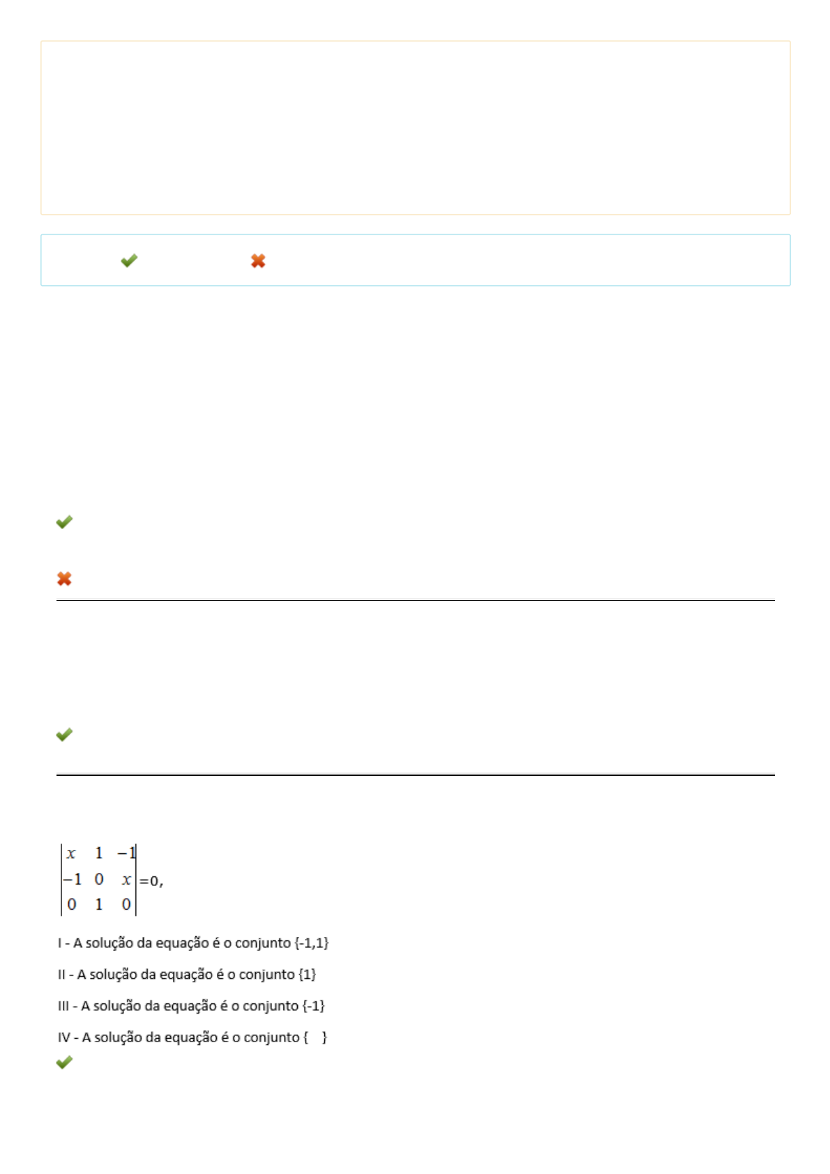 25/10/2019 UNIASSELVI - Centro Universitário Leonardo Da Vinci - Portal do Aluno - Portal do Aluno - Grupo UNIASSELVI https://portaldoalunoead.uniasselvi.com.br/ava/notas/request_gabarito_n2.php 1/4 Acadêmico: Hildesandra de Jesus da Silva (2061068) Disciplina: Geometria Analítica e Álgebra Vetorial (EMC02) Avaliação: Avaliação I - Individual FLEX ( Cod.:455732) ( peso.:1,50) Prova: 13420850 Nota da Prova: 7,00 Legenda: Resposta Certa Sua Resposta Errada 1. Arthur Cayley (1821-1895) foi um dos pioneiros no estudo das matrizes e, por volta de 1850, divulgou esse nome e passou a demonstrar sua aplicação. As matrizes, inicialmente, eram aplicadas quase que exclusivamente na resolução de sistemas lineares e apenas há pouco mais de 150 anos tiveram sua importância detectada. Com base no exposto, classifique V para as sentenças verdadeiras e F para as falsas: ( ) Se A é uma matriz quadrada então o sistema de equações A.X = B será determinado. ( ) O cálculo de MT.M sempre é possível e o resultado é uma matriz simétrica. ( ) Se C é triangular então det(C) será o produto da diagonal principal. ( ) det(P.Q) = 0 só se P ou Q tiver determinante zero. Assinale a alternativa que apresenta a sequência CORRETA: a) F - V - V - F. b) V - V - V - F. c) V - F - F - V. d) V - F - V - F. 2. Matriz quadrada é a que tem o mesmo número de linhas e de colunas. Esse tipo especial de matriz possui um número real associado. A este número real, damos o nome de determinante da matriz. Baseado nisso, sabendo que o determinante de uma matriz é igual a 5, assinale a alternativa CORRETA que apresenta o valor do novo determinante, obtido pela multiplicação de uma linha por -4: a) 1/20. b) -4. c) -20. d) 20. 3. Muitas vezes, quando nos deparamos com algum valor desconhecido em um determinante, devemos resolver a equação mediante uma resolução de um determinante. Baseado nisso, seja a equação a seguir, analise as sentenças quanto ao seu conjunto solução e assinale a alternativa CORRETA: a) Somente a sentença I está correta. b) Somente a sentença IV está correta. c) Somente a sentença II está correta. d) Somente a sentença III está correta. 25/10/2019 UNIASSELVI - Centro Universitário Leonardo Da Vinci - Portal do Aluno - Portal do Aluno - Grupo UNIASSELVI https://portaldoalunoead.uniasselvi.com.br/ava/notas/request_gabarito_n2.php 2/4 4. Dizemos que dois sistemas lineares são equivalentes quando possuem o mesmo conjunto solução. No entanto, podemos realizar esta análise, verificando os coeficientes numéricos das incógnitas e os termos independentes de cada sistema. Assim, dado o sistema a seguir, determine quais são os valores de a e b para que os sistemas sejam equivalentes: a) a = 2 e b = -2. b) a = 4 e b = -2. c) a = 4 e b = 2. d) a = 2 e b = 4. 5. Podemos construir uma matriz de acordo com uma lei de formação baseada em situações variadas. Cada uma destas situações poderá representar (ou modelar) alguma situação prática que necessite a utilização das matrizes para sua resolução. Baseado nistsso, dado a matriz a seguir, assinale a alternativa CORRETA que apresenta o termo a23: a) 10. b) 6. c) 13. d) 5. 6. Ao realizar o produto entre duas matrizes, devemos saber que o produto de uma matriz por outra não é determinado por meio do produto dos seus respectivos elementos. Precisamos realizar a verificação da possibilidade de resolução procedendo a análise das ordens das matrizes envolvidas. Baseado nisso, a partir do produto colocado a seguir, classifique V para as opções verdadeiras e F para as falsas e, em seguida, assinale a alternativa que apresenta a sequência CORRETA: a) V - F - F - F. b) F - V - F - F. c) F - F - V - F. d) F - F - F - V. 7. Existem várias técnicas utilizadas para calcular o determinante de uma matriz, entre elas estão: Regra de Sarrus, Teorema de Laplace, Teorema de Jacobi, entre outras. Todas essas técnicas podem ser facilitadas se aplicarmos as propriedades dos determinantes, lembrando que os determinantes, bem como suas propriedades, são aplicados apenas em matrizes quadradas. Quanto às possibilidades do valor do determinante ser nulo, classifique V para as sentenças verdadeiras e F para as falsas: ( ) O determinante possui duas linhas iguais. ( ) Todos os elementos de uma linha são iguais. ( ) Todos os elementos são números primos. ( ) Uma linha é combinação de outras. Assinale a alternativa que apresenta a sequência CORRETA: a) V - V - F - V. 25/10/2019 UNIASSELVI - Centro Universitário Leonardo Da Vinci - Portal do Aluno - Portal do Aluno - Grupo UNIASSELVI https://portaldoalunoead.uniasselvi.com.br/ava/notas/request_gabarito_n2.php 3/4 b) V - V - F - F. c) F - F - V - V. d) F - V - V - F. 8. Sistemas lineares é um conjunto de equações lineares, com m equações e n incógnitas. A solução de um sistema linear é a solução de todas as equações lineares. Existem muitas maneiras de resolver um sistema de equações lineares ou sistemas lineares, como quiser chamá-los. Desta forma, o mais importante é conhecer suas principais características e propriedades. Com base no sistema apresentado, classifique V para as sentenças verdadeiras e F para as falsas e, em seguida, assinale a alternativa que apresenta a sequência CORRETA: a) F - F - V - F. b) F - F - F - V. c) F - V - F - F. d) V - F - F - F. 9. Para realizar a discussão de um sistema linear, devemos verificar se o sistema é SPD (possível e determinado), SPI (possível e indeterminado) ou SI (impossível). Com base no sistema apresentado, analise as opções a seguir e, em seguida, assinale a alternativa CORRETA: a) Somente a opção IV está correta. b) Somente a opção II está correta. c) Somente a opção III está correta. d) Somente a opção I está correta. 10. Sistemas lineares são úteis para todos os campos da matemática aplicada, em particular, quando se trata de modelar e resolver numericamente problemas de diversas á