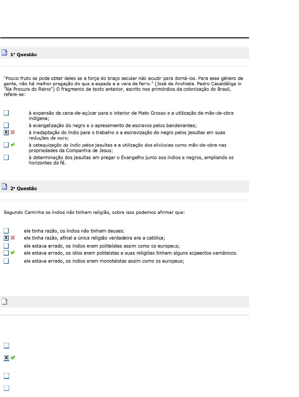 Exercício: CEL0495_EX_A1_201807048993_V1 30/08/201810:36:45 (Finalizada) Aluno(a): KELDMA MARQUES 2018.3 EAD Disciplina: CEL0495 - HISTÓRIA DOS POVOS INDÍGENAS E AFRO- DESCENDENTES 201807048993 1a Questão "Pouco fruto se pode obter deles se a força do braço secular não acudir para domá-los. Para esse gênero de gente, não há melhor pregação do que a espada e a vara de ferro." (José de Anchieta. Pedro Casaldáliga in "Na Procura do Reino") O fragmento de texto anterior, escrito nos primórdios da colonização do Brasil, refere-se: à expansão da cana-de-açúcar para o interior de Mato Grosso e a utilização de mão-de-obra indígena; à evangelização do negro e o apresamento de escravos pelos bandeirantes; à inadaptação do índio para o trabalho e a escravização do negro pelos jesuítas em suas reduções de ouro; à catequização do índio pelos jesuítas e a utilização dos silvícolas como mão-de-obra nas propriedades da Companhia de Jesus; à determinação dos jesuítas em pregar o Evangelho junto aos índios e negros, ampliando os horizontes da fé. 2a Questão Segundo Caminha os índios não tinham religião, sobre isso podemos afirmar que: ele tinha razão, os índios não tinham deuses; ele tinha razão, afinal a única religião verdadeira era a católica; ele estava errado, os índios eram politeístas assim como os europeus; ele estava errado, os ídios eram politeístas e suas religiões tinham alguns acpaectos xamãnicos. ele estava errado, os índios eram monoteístas assim como os europeus; 3a Questão Por que a conversão dos índios ao catolicismo pode ser tida como um importante fator de aculturação? Porque nos aldeamentos jesuíticos o índio entraria em contato com as famílias européias, podendo através da observação de seu cotidiano, aprender seus costumes mais facilmente. Porque através das aulas de catequese o índio recebia instrução não só religiosa, a ele eram ensinados a língua portuguesa e os valores morais. Ou seja, aprenderam costumes e hábitos socialmente aceitos. Porque através dos ensinamentos eles percebiam que a religião católica era mais piedosa do que a sua própria. Porque dentro dos aldeamentos jesuíticos os castigos eram notoriamente mais severos o que facilitaria a imposição de suas doutrinas. Porque carentes de sentido em suas vidas os índios aceitavam de maneira grata os novos hábitos e a nova vida. 4a Questão Os aldeamentos jesuíticos exerceram um papel fundamental para o sucesso da catequese, estando os índios reunidos em um só local era possível exercer uma influência diária sobre eles. A respeito da catequese podemos afirmar: foi exercida pela Ordem Jesuíta e tinha como objetivo a escravização dos índios. foi exercida pela Ordem Jesuíta e tinha como objetivo a conversão dos índios ao catolicismo; foi exercida pela Ordem Jesuíta e tinha como objetivo a conversão dos índios ao catolicismo e sua transformação em súditos do rei português; foi exercida por diversas Ordens religiosas e tinha como objetivo a conversão dos índios ao catolicismo e sua transformação em súditos do rei potuguês; foi exercida por diversas Ordens religiosas e tinha como objetivo a conversão dos índios ao catolicismo; 5a Questão O principal grupo/tronco linguístico encontrado pelos portugueses ao desembarcar no Brasil foram os: Goitacá Juruá Gêge Tupi-Guarani Tamoios 6a Questão A língua de que [os índios] usam, toda pela costa, é uma: ainda que em certos vocábulos difere em algumas partes; mas não de maneira que se deixem de entender. (...) Carece de três letras, convém a saber, não se acha nela F, nem L, nem R, coisa digna de espanto, porque assim não tem Fé, nem Lei, nem Rei, e desta maneira vivem desordenadamente (...). (GANDAVO, Pero de Magalhães, História da Província de Santa Cruz, 1578.). A partir do texto, pode-se afirmar que todas as alternativas expressam a relação dos portugueses com a cultura indígena, exceto: A diferença cultural entre nativos e colonos era atribuída à inferioridade do indígena. Os signos e símbolos dos nativos da costa marítima eram homogêneos. A língua dos nativos era caracterizada pela limitação vocabular. A desorganização social dos indígenas se refletia no idioma. A busca de compreensão da cultura indígena era uma preocupação do colonizador. 7a Questão Quando o português chegou debaixo de uma bruta chuva vestiu o índio.Que pena! Fosse uma manhã de sol, o índio tinha despido o português.(Oswald de Andrade. "Poesias reunidas". 2. ed. Rio de Janeiro: Civilização Brasileira, 1972) Sobre o contexto histórico em que se insere o fenômeno que os versos identificam é correto afirmar que: apesar de ter tomado posse da terra em nome do rei de Portugal, o interesse da monarquia estava voltado para o Oriente. a agressividade demonstrada pelos nativos despertou o interesse metropolitano pela ocupação efetiva das novas terras. a descoberta de metais preciosos favoreceu o estabelecimento das primeiras relações econômicas entre portugueses e indígenas. a conquista da América pelos portugueses contribuiu para o crescimento demográfico da população indígena no Brasil. no chamado período pré-colonial, o plantio e a exploração do pau-brasil incentivaram o tráfico africano. 8a Questão Quem era responsável pela catequese? os padres carmelitas. os padres jesuítas; a coroa portuguesa; a adminstração colonial; os padres beneditinos; Exercício: CEL0495_EX_A1_201807048993_V2 19/09/201816:11:51 (Finalizada) Aluno(a): KELDMA MARQUES 2018.3 EAD Disciplina: CEL0495 - HISTÓRIA DOS POVOS INDÍGENAS E AFRO- DESCENDENTES 201807048993 1a Questão Quando o português chegou debaixo de uma bruta chuva vestiu o índio.Que pena! Fosse uma manhã de sol, o índio tinha despido o português.(Oswald de Andrade. "Poesias reunidas". 2. ed. Rio de Janeiro: Civilização Brasileira, 1972) Sobre o contexto histórico em que se insere o fe