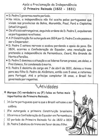 Apos Proclamacdo da Independencia Primeiro Reinado (1822 1831) D. Pedro Igovernou neste periodo, No inicio, a independencia no foi aceita pelos portugueses que viviam nas provincias da Bahia Maranhdo, Piaui Pard e Cisplatina (afual Uruguai) Os oficigis estrangeiros, seguindo ordens de D. Pedro I, expulsaram os portugueses revoltosos. A Constituicao foi outorgada em 1824 por D. Pedro I e ele passoua ser o Imperador. D. Pedro estava nervoso e acabou perdendo apoio do povo. Em 1824 ocorreu Confederacao do Equador, uma revolucao que pretendia a independencia de Pernambuco Ceara, Rio Grande do Norte e Paraiba D. Pedro dominou a situacao e os lideres foram presos, um deles, o Frei Caneca. foi condenado a morte. D. Pedro desistiu do cargo em 7 de abril de 1831, deixou trono para seu filho D. Pedro de Alcantara, entdo com 5 anos, e retornou para Portugal. Ate o principe completar 18 anos, o Brasil foi governado por regentes. Atividades Marque (V) verdadeira ou (F) falsa os fatos mais importantes do Primeiro Reinado. )A Corte portugueso queria que Brasil voltasse a ser colonig. )Foi outorgada primeira Constituicao brasileira. )Ocorreua Conf nfederacao do Equador em Pernambuco. )periodo do Primeiro Reinado foi de 1822 a 1831. )D. Pedro Iabdicou do trono em favor de seu fitho.