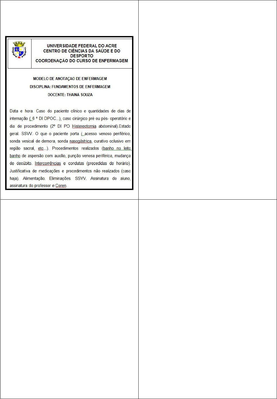 ANOTAÇÃO DE ENFERMAGEM 1º Data e Hora; 2º Caso do paciente clínico/ D.I.; 3º Estado Geral; 4º SSVV; 5º O que o paciente porta; 6ºProcedimentos realizados; 7º Intercorrências; 8º Alimentação; 9º Eliminação; 10º SSVV; 11ºAssinatura. Exemplo: 20/01/2016 7:30 às 12:30 10ºDI, ICC/DPOC. Encontra-se restrito ao leito, alerta, comunicativo e colaborativo. Refere cefaléia intensa em região occiptal, dispnéia ao esforço e dor intensa na região retroesternal. SSVV PA: 120X80mmHg em MSE em decúbito dorsal, P. 80bpm forte e rítmico, R 12MRM superficial e regular, TAX 36.9ºC. Porta acesso venoso periférico em dorso da mão direita salinizado e SVD. Realizado banho no leito, limpeza concorrente e troca de lençóis, massagem de conforto e mudança de decúbito. As 10:00h não foi administrado dipirona sódica 2ml IV, por não haver disponível na unidade, informado ao médico que prescreveu dipirona sódica 500mg VO. Paciente aceitou parcialmente a dieta oferecida. Diurese presente por meio de SVD, com débito urinário de 500ml de coloração amarelo palha. Evacuação presente, de consistência pastosa e de coloração marrom. SSVV PA: 120X80mmHg em MSE em decúbito dorsal, P. 80bpm forte e rítmico, R 12MRM superficial e regular, TAX 36.9ºC. Acad.Enf.UFAC Natália. Níveis de Consciência Alerta: Acordado ou facilmente estimulável, orientado consciente dos estimulos externos e internos, com resposta apropriada, capaz de manter interação sociais significativas; Letárgico: Sonolento, não está totalmente alerta, cai no sono quando não estimulado, acorda ao ser chamado em voz normal, mas parece sonolento, responde de forma apropriada a perguntas ou a comandos, mais o pensamento é lento e confuso. Redução dos movimentos espontâneos; Obnubilado: Dorme a maior parte do tempo, acorda com dificuldade, precisa de um grito ou sacudida vigorosa do corpo, age como se estivesse confuso ao ser acordado, monossilábico, a fala pode ser arrastada e inocente, exige estímulos constantes, mesmo para cooperação superficial; Estorpor, Semicoma ou Toporoso: Espontaneamente inconsciente, responde apenas a sacudidas persistentes ou vigorosas ou estimulo álgico. Tem resposta motora apropriada; Coma: Completamente inconsciente, sem resposta a estimulo álgico ou a qualquer estimulo interno ou externo. TRANSFERÊNCIA DE UNIDADE/SETOR Data e Hora; Motivo da transferência; Setor de destino e forma de transporte; Acompanhante; Procedimentos/cuidados realizados (punção de acessso venoso, instalação de oxigênio, sinais vitais, etc); Condições ( maca, cadeira de rodas); Queixas ; SSVV. Exemplo: 24/03/16. As 18h transferido para clinica médica masculina a pedido do médico assistente para continuidade do tratamento clinico. Consciente, comunicativo, hipoativo, com dispneia leve em cateter tipo oculos3l/min. Portando acesso venosso periférico em fossa cubital esquerda com fluidoterapia em curso e sonda vesical de demora funcionante. Encaminha pertences: relógio prata de pulso e toalha de banho azul. SSVV: PA=130X80mmHg MSE, sentado; Tax= 36C; R:18 mrm, rítmico e regulare P= 97bpm, cheio e regular. Transportado em cadeiras de rodas, em uso de bombas de oxigênio.Acad.Enf. Natalia. ALTA Data e horário; Condições da saída (deambulando, maca ou cadeira de rodas); Procedimentos realizados (mensuração de sinais vitais, retirada de cateter venoso, etc); Orientações prestadas. Exemplo: 24/03/16. As 9h recebeu alta hospitalar após reavaliação medica e melhora clinica. Consciente, orientado, deambulando, acompanhado da mãe. Realizado orientações quando a troca diária do curativo oclusivo, localizado na região dorsal do pé esquerdo , mantendo sempre limpo e seco, evitar atividades físicas e exercícios excessivos , fazer uso correto das medicações prescritas, sendo repassado os horários das doses e retorno ambulatorial medico em sete dias para nova avaliação. Retirado acesso venoso periférico, entregue atestado medico, receituário, raio x de tórax realizado fora da instituição,SSVV. Acad.Enf. Natalia. ADMISSÃO Anotar na prescrição de enfermagem a hora de entrada, procedência, condições do cliente, com quem e como veio, sintomas observados e queixas, o que o paciente porta, diagnóstico de internação, história pregressa, alergia, hábitos, destino dado aos pertences e valores, inclusive prótese dentária, procedimentos realizados, sinais vitais e assinar. Exemplo: Às 10h admitido no setor, proveniente do HUERB, com diagnóstico de encefalite. Veio acompanhado apenas pelo funcionário___, função___, em cadeira de rodas, portando acesso venoso em MSD. Comunicativo, em condições de higiene precárias. Queixa-se de cefaléia e refere ser alérgico a penicilina. Afirma Diabetes Mellitus tipo I, hipertensão arterial sistêmica e tabagismo há 13 anos, nega etilismo. Pertences de valor (aliança dourada e relógio da marca Seiko prateado) foram mantidos com o paciente à pedido, sendo informado que a instituição não se responsabilizará pela perda do mesmo. Peso: 68kge altura: 1,78m. SSVV: PA: 130x80mmHg MSE, sentado, Tax:36,1°C, R: 18 rpm, rítimico e regular e P:97bpm, cheio e regular. Assinatura e Coren. ÓBITO Assistência prestada durante a constatação; Data e horário; Identificação do médico que constatou; Comunicação do óbito ao setor responsável; Procedimentos pós-morte; Encaminhamento do corpo (forma, local). CONTEÚDO DAS ANOTAÇÕES REFERENTES AS NECESSIDADES HUMANAS BÁSICAS As condições gerais do paciente ao iniciar o plantão: estado mental e humor, condições físicas, SSVV e sintomas, condições de drenos, cateteres, e curativos e etc; Nutrição: indicar dieta oferecida ( geral, leve, branda, pastosa, hipossódica, para diabéticos, dieta por sonda); aceitação da dieta ( parcial ou total); dieta por sonda (Qnt da dieta e da hidratação, presença de refluxo gástrico,cuidados prestados antes e após a administraç