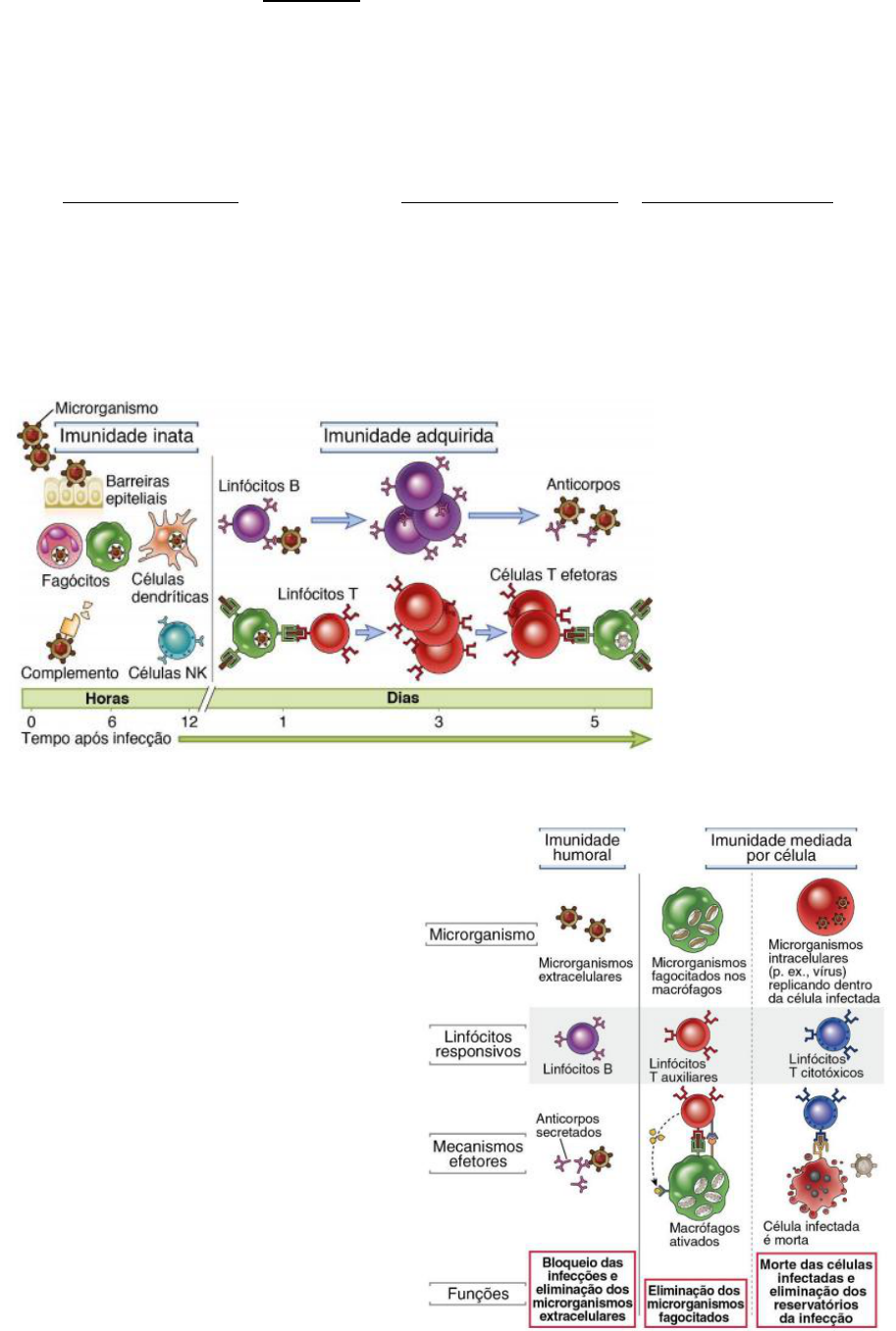 Introdução ao Sistema Imune Luciano Sampaio Guimarães - Medicina UFPE 144 Imunossupressão: quando precisa-se reduzir a resposta imune que está exacerbada, por exemplo, pelo uso de corticoides (alergia, doenças autoimunes) Imunodepressão: ocorre de modo patológico, devido ao não funcionamento do sist. imune Imunorregulação: quando se quer suprimir uma parte da resposta imune Imunidade Inata e Imunidade Adquirida IMUNIDADE INATA: é a proteção inicial, natural/nativa, sempre presente nos indivíduos saudáveis, preparada para bloquear a entrada de micro-organismos e eliminar rapidamente os que conseguem penetrar nos tecidos. Primeira linha de defesa: barreiras epiteliais (ANATÔMICA), células especializadas e antibióticos naturais Os patógenos que penetram são atacados pelo componente CELULAR: fagócitos, linfócitos (células NK), granulócitos e HUMORAL - proteínas plasmáticas (incluindo o sistema complemento). Reagem contra micro-organismos, mas não contra substâncias estranhas. Além de fornecer a proteção inicial, essas respostas estimulam as respostas da imunidade adquirida. Apesar de ser eficaz em muitas infecções, algumas já evoluíram para resistir aos seus mecanismos, sendo principalmente combatidas pela imunidade adquirida. IMUNIDADE ADQUIRIDA: formada pelos linfócitos (CELULAR) e seus produtos (HUMORAL), como os anticorpos. Suas células expressam receptores que reconhecem diversas substâncias, os antígenos. Sua resposta é desencadeada se os micro-organismos ou seus antígenos: Atravessarem a barreira epitelial Transportados para os órgãos linfócitos, onde serão reconhecidos pelos linfócitos Mecanismos Especializados: Os anticorpos eliminam micro-organismos presentes nos líquidos extracelulares; Os linfócitos T ativados eliminam micro-organismos dentro das células; OBS: cooperação – a imunidade adquirida usa de células da imunidade inata. Por exemplo: quando um micro-organismo é coberto por anticorpos (adquirida) que se ligarão aos fagócitos (inata), ativando-os e, consequentemente, havendo destruição do micro-organismo. Tipos de Imunidade Adquirida (humoral e celular) Imunidade Humoral: mediada por anticorpos, que são produzidos pelos linfócitos B. Os anticorpos são secretados na circulação e nos líquidos, neutralizando e eliminando os micro-organismos e as toxinas presentes fora da célula do hospedeiro (sangue, lúmen do órgão). Os anticorpos têm a função de evitar que as infecções se estabeleçam nas células do hospedeiro. Anticorpos reconhecem antígenos microbianos extracelulares (de diferentes naturezas). Imunidade Celular: contra, por exemplo, micro-organismos que vivem e se multiplicam dentro de células infectadas. É mediada pelos linfócitos T: alguns deles são capazes de ativar fagócitos para destruir os micro-organismos intracelulares em seus fagossomos (CD4), outros destroem qualquer célula que apresente micro-organismos infecciosos (CD8). Os linfócitos T reconhecem os antígenos produzidos pelos micro-organismos intracelulares. Linfócitos T reconhecem apenas antígenos proteicos (exceto o T gama delta). Indução da Imunidade Ativa: pela infecção ou pela vacinação É criada uma resistência a infecções posteriores, os indivíduos estão “imunes” Passiva: transferência de anticorpos ou linfócitos de um indivíduo imunizado ativamente O indivíduo “virgem” recebe as células ou moléculas de outro, sendo capaz de combater a infecção durante tempo de vida limitado É útil para garantir imunidade rapidamente Propriedades da Resposta Imunológica Adquirida Especificidade e Diversidade: o “repertório de linfócitos” é muito grande, porque há especificidade para uma imensa quantidade de antígenos diferentes. Seleção Clonal: os clones de linfócitos específicos para antígenos diferentes surgem antes do encontro com esse antígeno – quando encontra um antígeno correspondente, há expansão clonal – proliferação de linfócitos que foram ativados por antígenos, gerando milhares de células com a mesma especificidade. Memória: respostas mais acentuadas e mais eficazes são desenvolvidas por exposições repetidas ao mesmo antígeno. A resposta imunológica primária é mediada por linfócitos virgens, que nunca responderam a um antígeno. Se encontrarem com o mesmo antígeno, levam a resposta imunológica secundária, que são mais rápidas, mais acentuadas e mais eficazes porque resultam da ativação dos linfócitos de memória, células de longa duração criadas durante a 1ª exposição. Todas as respostas imunológicas são autolimitadas, diminuem à medida que a infecção é eliminada, para que o sistema retorne ao repouso e se prepare para responder a outra infecção. COMPLEMENTO: AULA DE WEBER OBS: existem linfócitos T que fazem parte da imunidade inata. O linfócito T gama delta é o exemplo, é localizado dentro do epitélio e participa da imunidade inata humoral, secretando anticorpos. Hemograma: capaz de diferenciar uma virose de bacteriose (leucócitos: 4.000 a 11.000/mm3). Linfócito típico: não é possível saber, pelo hemograma, se são B ou T; CD4 ou CD8. Contudo, são os linfócitos virgens. Linfócito atípico: linfócito que foi ativado (ex: linf. B → plasmócito; linf. T CD4 ativado, etc) Leucocitose: infecções, processos inflamatórios. (geralmente ↑ neutrófilos e monócitos). Leucopenia: infecções virais e bacterianas. Bacteriose Clássica: ↑ bastões e ↑ monócitos, além de ↑ linfócitos atípicos porque há produção de anticorpo (linf. B → plasmócito). Isso é no início, porque depois, há ↓ neutrófilos e ↑ eosinófilos, que têm a função de liberar substâncias para que o foco inflamatório seja resolvido. Infecção Viral: ↑ linfócitos atípicos, não há aumento de bastão e monócitos podem estar pouco aumentados. Os monócitos estarão aumentados porque são responsáveis pela limpeza das células mort