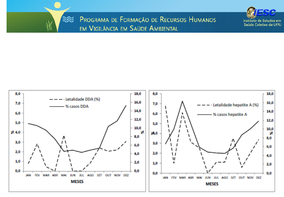 CURSO DE CAPACITAÇÃO EM VIGILÂNCIA DA QUALIDADE DA ÁGUA PARA CONSUMO HUMANO EXERCÍCIOS COMPLEMENTARES QUESTÃO 1 Observe as figuras abaixo: Figura 1. Distribuição mensal da proporção de casos e do coeficiente de letalidade por DDA, município X, 2011. Figura 2. Distribuição mensal da proporção de casos e do coeficiente de letalidade por Hepatite A, município X, 2011. Considerando as informações disponibilizadas nas Figuras 1 e 2, assinale a alternativa CORRETA. I - De forma geral, ao longo de 2011, observamos que a letalidade por DDA foi semelhante a da por hepatite A. Feedback: Falso. Nos meses de 2011, com algumas exceções, os valores do coeficiente de letalidade por DDA foram sistematicamente menores que os por hepatite A. Para o ano de 2011, o coeficiente de letalidade por DDA totalizou 1,7% e o por hepatite A, 3,0%. A questão é interessante para pensarmos sobre a apresentação de dados em gráficos. Para fazermos a comparação entre os coeficientes sem possibilidade de errarmos, a escala dos gráficos deve ser a mesma, observe que a escala do eixo principal y (que informa sobre o coeficiente de letalidade) inicia em 0,0% e termina em 8,0% em ambos os gráficos. Quando as escalas são diferentes, podemos errar ao compararmos o comportamento dos dados – observe a figura a seguir, onde a escala do eixo principal y para a proporção de casos de DDA é diferente. II - Os casos de DDA e hepatite A ocorreram com maior frequência nos meses mais quentes do ano. Feedback: Verdadeiro. Podemos visualizar nas Figuras 1 e 2 que, de forma geral, as proporções de casos de DDA e hepatite A são maiores nos trimestres janeiro-fevereiro-marco e outubro-novembro- dezembro, com menores percentuais nos trimestres abril-maio-junho e julho-agosto-setembro. Alguns agravos relacionados com a água de consumo apresentam comportamento sazonal, ou seja, ocorrem com maiores frequências em determinadas épocas do ano (no exemplo em questão, nos meses mais quentes). A ocorrência de maior número de casos nesses meses pode estar relacionada à piora da qualidade da água de consumo. Nos meses mais quentes também ocorre maior pluviosidade, o que impacta a qualidade da água dos mananciais de abastecimento (carreamento de contaminantes por lixiviação, contaminação por águas residuárias – águas de enxurradas), afetando o tratamento da água e, consequentemente, a qualidade da água consumida, podendo aumentar o risco de transmissão de patógenos via água de consumo (se a água consumida não for tratada, esse risco é ainda mais evidente). Também, nos meses mais quentes a exposição pode ser maior, devido ao maior consumo de água. III - O comportamento do coeficiente de letalidade por DDA e hepatite A é semelhante ao verificado para a distribuição da proporção de casos. Feedback: Verdadeiro. De forma geral, também, as maiores letalidades foram verificadas nos meses mais quentes e as menores nos meses mais frios. Tal comportamento não necessariamente é explicado pelas características epidemiológicas das doenças em questão, mas simplesmente pelo fato de que uma maior ocorrência de casos leva à maior probabilidade de ocorrência de casos graves e fatais, aumentando a letalidade. IV - O comportamento do coeficiente de letalidade por DDA e hepatite A pode indicar maior risco de morrer por ambos os agravos nos meses mais quentes. Feedback: Verdadeiro. O coeficiente de letalidade não mede o risco de morrer por algum agravo, para isso deveríamos utilizar o coeficiente de mortalidade por causa. Contudo, se assumirmos que a população sob risco (população do município X) não se altera de forma significativa ao longo do ano, podemos supor que a mesma população está exposta ao longo dos meses de 2011, portanto, o denominador do coeficiente de mortalidade por causa segundo o mês seria o mesmo para todos os meses. Nesse caso, o que alteraria o resultado do cálculo desse coeficiente seria o denominador (número de óbitos), sendo assim, de fato, o coeficiente de letalidade poderia indicar em que período (ou períodos) as maiores probabilidades de óbito seriam esperadas. Contudo, de forma alguma, o valor do coeficiente de letalidade poderia expressar numericamente o risco de morrer. a) todas as afirmativas são verdadeiras. b) a afirmativa I é verdadeira. c) as afirmativas I, II, III são verdadeiras. d) as afirmativas II, III e IV são verdadeiras. QUESTÃO 2 (Questão extraída do livro Epidemiologia. Org. Medronho R., 2006) O Núcleo de Estudos em Saúde Coletiva (NESC) da UFRJ desenvolveu um projeto de pesquisa, cujo objetivo era avaliar os impactos do Programa de Despoluição da Baía de Guanabara sobre as condições desaúde e a qualidade de vida das populações envolvidas. Como parte deste projeto, foi realizado em 1996 um estudo piloto, no qual buscou-se identificar, ao longo de três meses, as proporções de indivíduos entre 1 e 59 anos de idade infectadospelo vírus da hepatite A (VHA), em três populações distintas, segundo as condições de saneamento, residentes no distrito de Campos Elyseos, município de Duque de Caxias (DC) e na Ilha do Governador, município do Rio de Janeiro (RJ). Os resultados deste estudo são apresentados a seguir. Número de indivíduos infectados pelo VHA e tamanho das amostras segundo a área de estudo. Área Infectados Tamanho da amostra DC setor 112 138 349 DC setor 111 92 362 RJ colônia Z-10 79 386 a) Calcule a prevalência de casos para VHA na localidade DC setor 112. Feedback: 39,54% b) Calcule a prevalência de casos para VHA na localidade RJ colônia Z-10 Feedback: 20,47% QUESTÃO 3 (Questão extraída do livro Epidemiologia. Org. Medronho R., 2006) “Cólera: O Brasil é o segundo no mundo. Dados da OMS revelam que 94 países foram atingidos pela doença, sendo o Zaire o de maior incidência, com cerca de 58 mil casos (com 4181 mortes), seguido pelo Brasil (cerca de 50 mil casos e 544 óbitos).” (Not