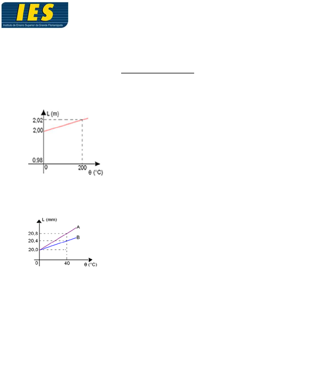 PROFESSORA: Mara Cristina P. Zenevicz DATA: DISCIPLINA: Fundamentos da Termodinâmica CURSO: Engenharia Civil ALUNO (A): ___________________________________________ MATRÍCULA:_____________ Exercícios revisão para NP2 1) O gráfico abaixo representa a variação do comprimento de uma barra homogênea com a temperatura. Determine o coeficiente de dilatação linear de que a barra é constituída. 2) Duas barras homogêneas, A e B, tem seu comprimento L em função da temperatura variando de acordo com o gráfico. Determine os coeficientes de dilatação linear α A e α B dos materiais que constituem as barras. 3) A extensão de trilhos de ferro sofre dilatação linear, calcule o aumento de comprimento que 1000 m dessa ferrovia sofre ao passar de 0 °C para 20 °C, sabendo que o coeficiente de dilatação linear do ferro é 12.10-6 °C-1. 4) Duas barras de 3 metros de alumínio encontram-se separadas por 1cm à 20°C. Qual deve ser a temperatura para que elas se encostem, considerando que a única direção da dilatação acontecerá no sentido do encontro? Sendo y Al = 22.10-6 ºC -1 5) Um fazendeiro quer cercar com arame um terreno quadrado de lados 25m e para isso adquire 100m de fio. Fazendo o cercado, o fazendeiro percebe que faltaram 2cm de fio para a cerca ficar perfeita. Como não quer desperdiçar o material e seria impossível uma emenda no arame, o fazendeiro decide pensar em uma alternativa. Depois de algumas horas, ele percebe que naquele dia a temperatura da cidade está mais baixa do que a média e decide fazer cálculos para verificar se seria possível utilizar o fio num dia mais quente, já que ele estaria dilatado. Sabendo que o acréscimo no comprimento do fio é proporcional ao seu comprimento inicial, ao seu coeficiente de dilatação linear e à variação de temperatura sofrida, calcule o aumento de temperatura que deve ocorrer na cidade para que o fio atinja o tamanho desejado. (Dado: coeficiente de dilatação térmica linear do fio = .) 6) Uma peça de zinco é constituída a partir de uma chapa de zinco com lados 30cm, da qual foi retirado um pedaço de área 500cm². Elevando-se de 50°C a temperatura da peça restante, qual será sua área final em centímetros quadrados? (Dado α Zi =2,5.10-5 ºC-1 ). 7) Um paralelepípedo de uma liga de alumínio ( α Al = 2.10-5 ºC-1) tem arestas que, à 0°C, medem 5cm, 40cm e 30cm. De quanto aumenta seu volume ao ser aquecido à temperatura de 100°C? 8) Sobre os gases monoatômicos e ideais que passam por um processo de transformação isobárica, podemos afirmar corretamente que: a) Toda a quantidade de calor (Q) cedida ao sistema será transformada em trabalho mecânico. b) A quantidade de calor (Q) cedida ao sistema é diretamente proporcional à sua variação de temperatura. c) A energia interna do gás (U) permanece constante. d) A variação de energia interna(ΔU) é inversamente proporcional à variação volumétrica (ΔV). e) A temperatura do gás varia, mas não há trocas de calor entre o sistema e o meio externo.