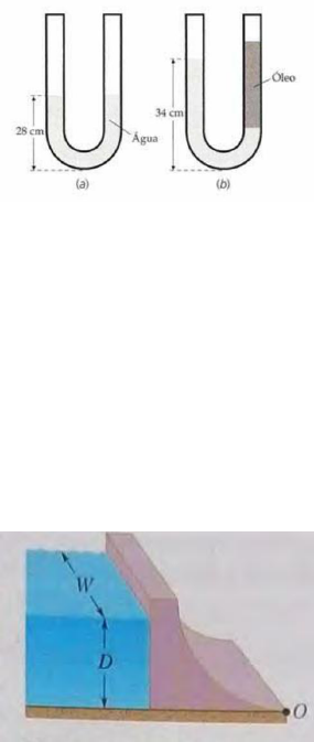Lista de Exercícios - Hidrostática 1) Alguns jovens nadam se dirigindo para uma balsa retangular, de madeira, de 3, 00 m de largura e 2, 00 m de comprimento. Se a balsa tem 9, 00 cm de espessura, quantos jovens de 75, 0 kg podem ficar de pé sobre a balsa, sem que esta submerja totalmente? Suponha a massa específica da madeira igual a 650 kg/m3. 2) Um tubo em U é preenchido com água, até que o nível do líquido atinja 28 cm acima da base do tubo (veja figura 1(a)). Óleo, com uma densidade de 0, 78 g/cm3, é agora derramado em um dos braços do tubo em U, até que o nível da água do outro braço atinja 34 cm acima da base do tubo (veja figura 1(b)). Determine os níveis das interfaces óleo-água e óleo-ar no outro braço do tubo. Figura 1: Tubo em U. 3) Na figura 2, a água atinge uma altura D = 35, 0 m atrás da face vertical de uma represa com W = 314 m de largura. Determine (a) a força horizontal a que está submetida a represa por causa da pressão manométrica da água e (b) o torque produzido por essa força em relação a uma reta que passa por O e é paralela à face plana da represa. (c) Determine o braço de alavanca desse torque. Figura 2: Força da água em uma represa. 4) Um êmbolo com uma seção reta a é usado em uma prensa hidráulica para exercer uma pequena força de módulo f sobre um líquido que está em contato, através de um tubo de ligação, com um êmbolo maior de seção reta A (veja figura 3). (a) Qual é o módulo F da força que deve ser aplicada ao 1 êmbolo maior para que o sistema fique em equilíbrio? (b) Se os diâmetros dos êmbolos são 3, 80 cm e 53, 0 cm, qual é o módulo da força que deve ser aplicada ao êmbolo menor para equilibrar uma força de 20, 0 KN aplicada ao êmbolo maior? Figura 3: Prensa hidráulica. 5) Na figura 4, uma mola de constante elástica 3, 00× 104 N/m liga uma viga rígida ao êmbolo de saída de um macaco hidráulico. Um recipiente vazio de massa desprezível está sobre o êmbolo de entrada. O êmbolo de entrada tem uma área Ae e o êmbolo de saída tem uma área 18, 0 Ae. Inicialmente, a mola está relaxada. Quantos quilogramas de areia devem ser despejados (lentamente) no recipiente para que a mola sofra uma compressão de 5, 00 cm? Figura 4: Macaco hidráulico. 6) Um pedaço de 500 g de cobre, com densidade 8, 96 g/cm3, está suspenso em uma balança de mola e submerso em água como mostra a figura 5. Qual é a força que a balança indica? 7) Quando determinada pedra é suspensa de uma balança de mola, a escala indica 60 N. No entanto, quando a pedra suspensa é totalmente mergulhada em água, a escala passa a indicar 40 N. Qual é a massa específica da pedra? 2 Figura 5: Recipiente com água e pedaço de cobre submerso. 8) Um bloco de material desconhecido pesa 5 N no ar e 4, 55 N totalmente mergulhado na água. (a)Qual é a massa específica do material? (b)De que material o bloco é, provavelmente, feito? 9) Um corpo maciço e homogêneo flutua na água, com 80% do seu volume abaixo da superfície. Quando colocado em um segundo líquido, o mesmo corpo flutua com 72% de seu volume abaixo da superfície. Determine a massa específica do corpo e a densidade do líquido. 10) Um bloco de ferro de 5 Kg é suspenso de uma balança de mola e totalmente mergulhado em um fluido de massa específica desconhecida. A escala indica 6, 16 N. Qual é a massa específica do fluido? 11) Um grande pedaço de rolha pesa 0, 285 N no ar. Quando mantido submerso dentro d’água por uma balança de mola, como mostrado na 6, a escala indica 0, 855 N. Determine a massa específica da rolha. Figura 6: Recipiente com água e pedaço de rolha submersa. 3 12) Um béquer de 1 Kg, contendo 2 Kg de água, está sobre uma balança de cozinha. Um bloco de 2 Kg de alumínio (massa específica ρ = 2, 70×103 kg/m3), suspenso de uma balança de mola, é mergulhado na água, como mostrado na figura 7. Determine as leituras nas duas escalas. Figura 7: Balança de cozinha e balança de mola. 13) Um bloco de madeira flutua em água doce com dois terços do volume V submersos e em óleo com 0, 90 V submersos. Determine a massa específica (a) da madeira e (b) do óleo. 14) Na figura 8, um cubo de aresta L = 0, 60 m e 450 kg de massa é suspenso por uma corda em um tanque aberto que contém um líquido de massa específica 1030 kg/m3. Determine (a) o módulo da força total exercida sobre a face superior do cubo pelo líquido e pela atmosfera, supondo que a pressão atmosférica é 1, 00 atm. (b) O módulo da força total exercida sobre a face inferior do cubo e (c) a tensão da corda. (d) Calcule o módulo da força de empuxo a que o cubo está submetido usando o princípio de Arquimedes. Que relação existe entre todas essas grandezas? Figura 8: Empuxo. 15) Uma âncora de ferro de massa específica 7870 Kg/m3 parece ser 200 N mais leve na água que no ar. (a) Qual é o volume da âncora? (b) Quanto ela pesa no ar? 4 16) Um barco que flutua em água doce desloca um volume de água que pesa 35, 6 kN. (a) Qual é o peso da água que o barco desloca quando flutua em água salgada de massa específica ρ = 1, 10×103 kg/m3? (b) Qual a diferença entre o volume de água doce e o volume de água salgada deslocados? 17) Três crianças, todas pesando 356 N, fazem uma jangada com toras de madeira de 0, 30 m de diâmetro e 1, 80 m de comprimento. Quantas toras são necessárias para mantê-las flutuando em água doce? Suponha que a massa específica da madeira é 800 Kg/m3. 18) Na figura 9(a), um bloco retangular é gradualmente empurrado para dentro de um líquido. O bloco tem uma altura d; a área das faces superior e inferior é A = 5, 67 cm3. A outra figura (b) mostra o peso aparente do bloco em função da profundidade h da face inferior. A escala do eixo vertical é definida por Ps = 0, 20 N. Qual é a massa específica do líquido? Figura 9: Empuxo em um objeto empurrado para dentro de um líquido. 19) Uma esfera de ferro oca flutua quas