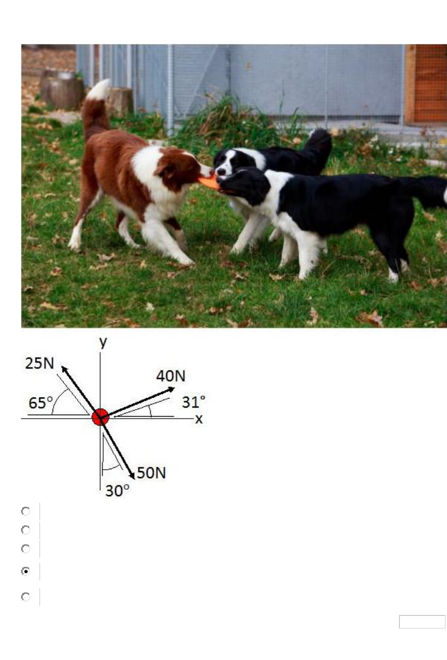 PERGUNTA 1 Numa brincadeira, três cachorros estão disputando um disco de plástico. Os três estão puxando o material em sua direção, cada um em uma posição e com uma força específica. A partir da vista superior da situação, ilustrada na imagem a seguir, identifique a alternativa com a afirmação CORRETA: a. Considerando as forças apresentadas, o disco está numa posição de equilíbrio. b. Para que o sistema entrasse em equilíbrio, bastaria remover um dos cachorros da disputa. c. O ângulo da aplicação das forças não tem influência sobre o equilíbrio do sistema. d. A projeção das forças aplicadas no eixo y (forças decompostas) tem uma somatória igual a zero, ou seja, as forças no eixo y se anulam. e. Atribuindo-se eixos verticais e horizontais xy conforme indicado, podemos afirmar que o sistema está em equilíbrio apenas no eixo horizontal. 0,25 pontos PERGUNTA 2 Aplicando o que você sabe sobre decomposição de forças, verifique qual o ângulo necessário para que a força de 250N inclinada tenha uma projeção horizontal de 125N, conforme indicado no esquema abaixo: a. 60° b. 15° c. 70° d. 45° e. 35° 0,25 pontos PERGUNTA 3 Uma engenheira ambiental, pesando 75 kg, resolveu passar as férias numa casa de praia. Ela ficou curiosa sobre a resistência dos coqueiros da região e resolveu pendurar uma rede entre dois coqueiros exatamente iguais para um teste. Ele agora quer saber qual a força que cada coqueiro precisa exercer sobre a rede para que o sistema se mantenha em equilíbrio e ela possa ficar estável sobre a rede. a. 800N b. 1500N c. 325N d. 650N e. 750N 0,25 pontos PERGUNTA 4 Considere a situação na qual um balde com pedras, no total de 15kg, é suspenso por uma balança de cozinha. Calcule o valor em kg que será exibido na balança após a interferência das forças adicionais apontadas na imagem (considere a gravidade arredondada para 10 m/s²). a. 11,85 kg b. 0,0 kg c. 5,45kg d. 8,5 kg e. 3,10 kg