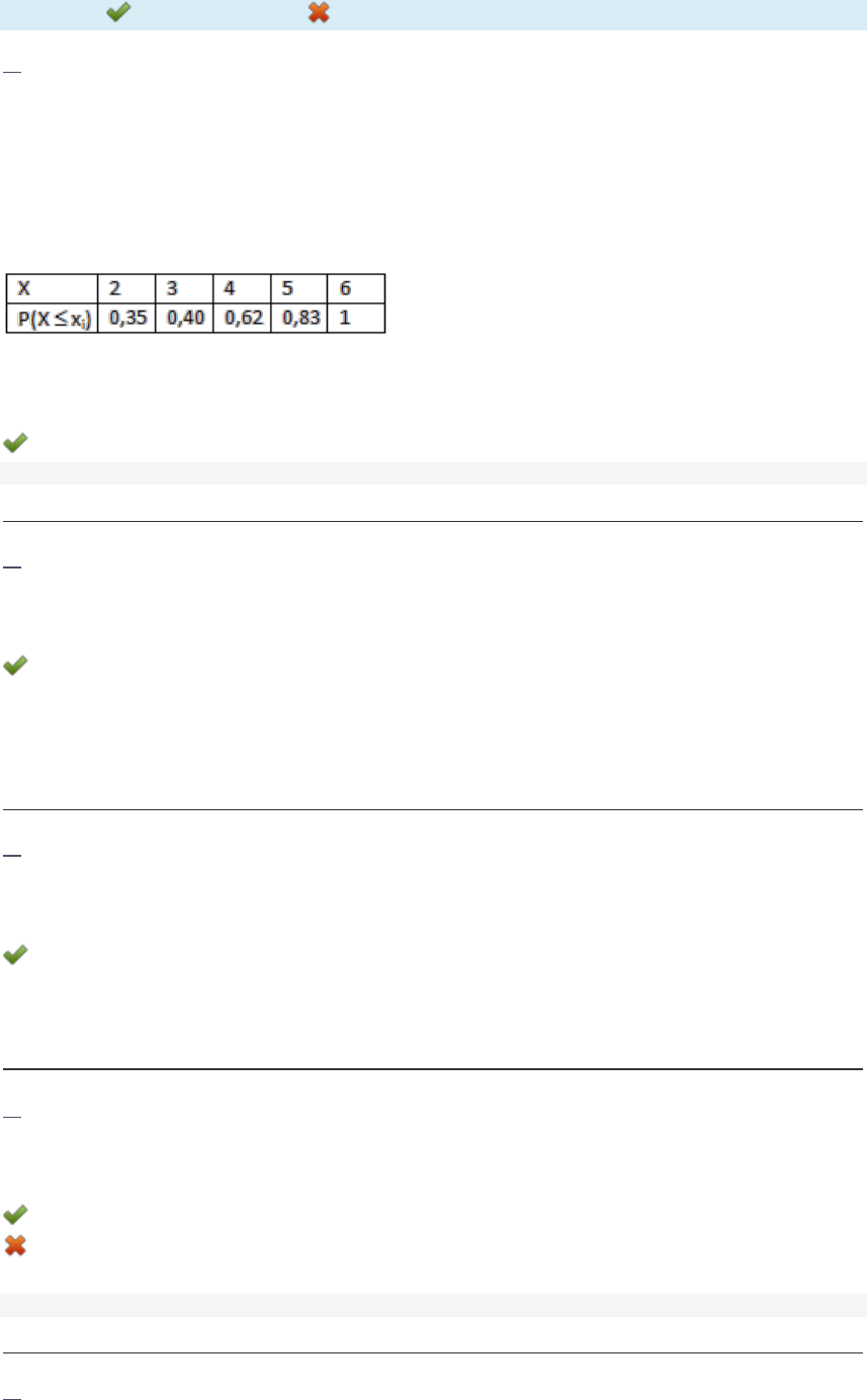 Legenda: Resposta Certa Sua Resposta Errada Parte superior do formulário 1. De início, a teoria da probabilidade era utilizada para prever resultados de jogos de azar. Contudo, com o passar do tempo, as aplicações de probabilidade se expandiram notavelmente, sobretudo em processos de tomada de decisão ligados a acontecimentos sujeitos aos efeitos do acaso, tais como previsão meteorológica e de safras agrícolas; risco de apólices de seguro; cotação de ações em bolsa de valores; controle de qualidade; marketing, entre outros. Portanto, as probabilidades têm a função de mostrar a chance de ocorrência de um evento. Considere a distribuição de probabilidade acumulada a seguir e calcule P(X>3): a) P(X > 3) = 0,65. b) P(X > 3) = 0,75. c) P(X > 3) = 0,38. d) P(X > 3) = 0,60. 2. A profissão de Bombeiro é a que possui o maior nível de confiança por parte da população, segundo várias pesquisas publicadas em periódicos. O Serviço de Urgência do Corpo de Bombeiros recebe em média 3 chamados por hora. Qual a probabilidade de receber exatamente 8 chamados no período de 2 horas? a) 0,1033. b) 0,1591. c) 0,1452. d) 0,0633. 3. Considerando o lançamento de uma moeda 5 vezes, podemos definir como variável aleatória X o número de vezes que ocorre coroa nos 5 lançamentos. Nessas condições, a variável aleatória X assume os seguintes valores: a) X = {1, 2, 3, 4, 5, 6}. b) X = {0, 1, 2, 3, 4, 5}. c) X = {1, 2, 3, 4, 5}. d) X = {0, 1, 2, 3, 4}. 4. Uma clínica de emagrecimento recebe pacientes adultos com peso seguindo uma distribuição normal de média 140 kg e desvio padrão 30 kg. Qual a probabilidade de essa clínica receber uma paciente com peso entre 160 e 200 kg? a) A probabilidade é de 15,54%. b) A probabilidade é de 22,86%. c) A probabilidade é de 18,57%. d) A probabilidade é de 25,15%. 5. Considerando o lançamento de uma moeda 3 vezes, podemos definir como variável aleatória X o número de vezes que ocorre cara nos 3 lançamentos. Nessas condições, qual dos quadros a seguir apresenta a distribuição correta de probabilidades da variável aleatória X? a) Somente o Quadro III está correto. b) Somente o Quadro IV está correto. c) Somente o Quadro I está correto. d) Somente o Quadro II está correto. 6. Num teste do tipo Verdadeiro-ou-Falso, com 10 perguntas, qual a probabilidade de uma pessoa, respondendo às questões ao acaso, acertar 8 ou 9 das perguntas? a) A probabilidade é de 0,0293. b) A probabilidade é de 0,0537. c) A probabilidade é de 0,0439. d) A probabilidade é de 0,0098. 7. Um time A de futebol tem 40% de chance de perder sempre que joga. Se A jogar 4 partidas, calcule a probabilidade desse time vencer no máximo duas partidas. a) A probabilidade é de 40,12%. b) A probabilidade é de 52,48%. c) A probabilidade é de 50%. d) A probabilidade é de 62,58%. 8. O tempo para realizar uma determinada tarefa, em minutos, foi modelado por uma variável aleatória X com a distribuição de probabilidade apresentada na tabela a seguir. Sendo assim, qual é o tempo esperado para realizar essa tarefa? a) O tempo esperado é de 41,8 min. b) O tempo esperado é de 44,25 min. c) O tempo esperado é de 40 min. d) O tempo esperado é de 42,5 min. 9. A probabilidade de uma empresa produzir uma peça defeituosa é de 5%. Ao selecionar aleatoriamente uma amostra de 500 peças, qual a probabilidade de que no máximo 15 tenham defeito? a) A probabilidade é de 2,02%. b) A probabilidade é de 2,56%. c) A probabilidade é de 1,58%. d) A probabilidade é de 3,22%. 10. A produção de lâmpadas de uma certa empresa segue uma distribuição normal com vida média de 2.520 horas e desvio padrão 250 horas. Ao selecionar uma lâmpada aleatoriamente, qual a probabilidade de essa lâmpada queimar-se com mais de 2.000 horas? a) A probabilidade é de 99,13%. b) A probabilidade é de 98,12%. c) A probabilidade é de 98,54%. d) A probabilidade é de 99,61%.