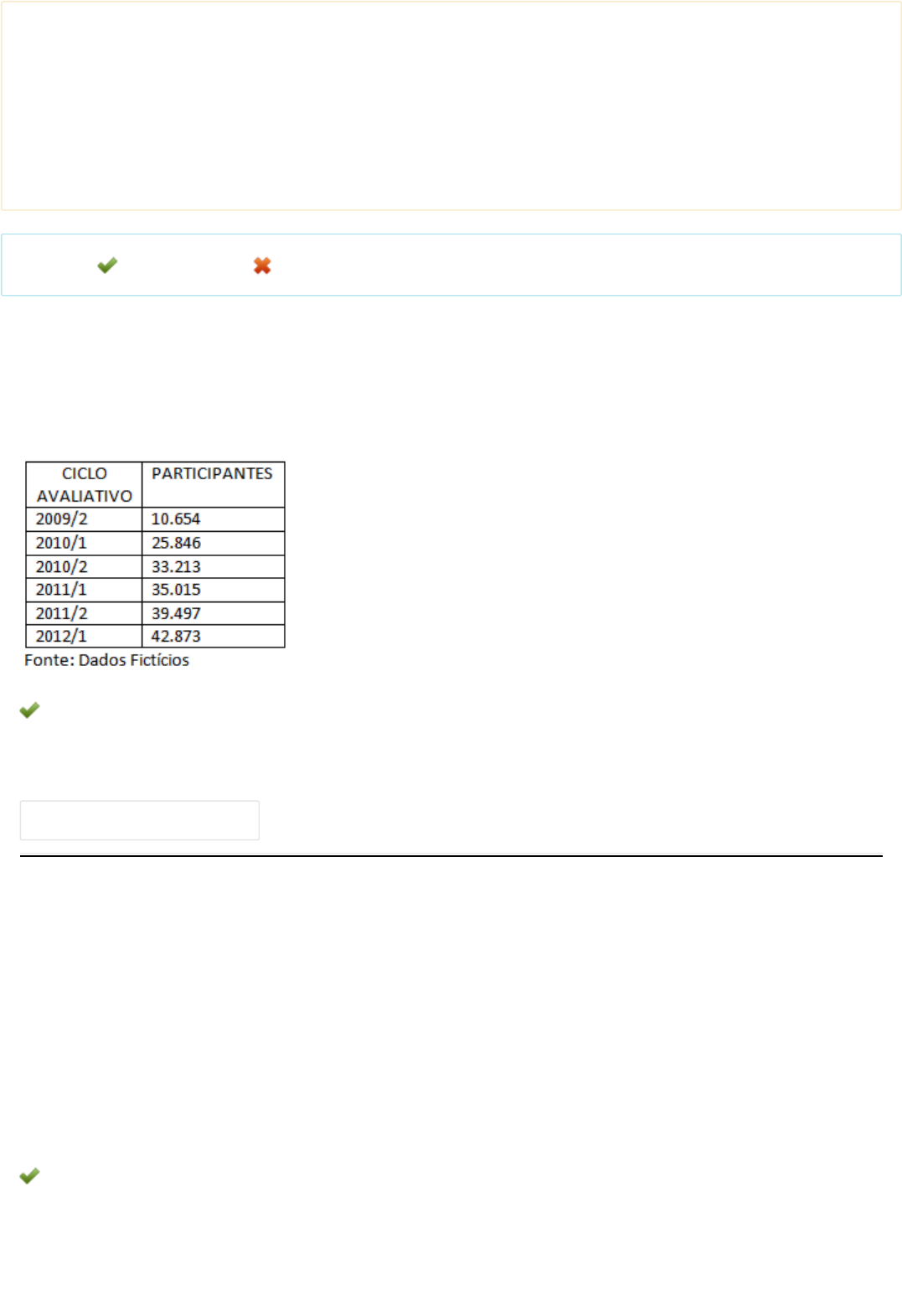 Acadêmico: Mharcos Vinicius Gonçalves de Hungria (1935095) Disciplina: Estatística (MAT99) Avaliação: Avaliação II - Individual FLEX ( Cod.:455491) ( peso.:1,50) Prova: 13513221 Nota da Prova: 10,00 Legenda: Resposta Certa Sua Resposta Errada 1. Participar da Avaliação Institucional, que é organizada pela Comissão Própria de Avaliação - CPA, oportuniza aos acadêmicos, articuladores, tutores, coordenadores de curso e colaboradores avaliar aspectos pedagógicos, organizacionais e de infraestrutura da UNIASSELVI. A partir da divulgação das melhorias ocorridas em decorrência dos resultados das avaliações, a participação desses atores pedagógicos vem aumentando ciclo após ciclo. Neste contexto, observe, na tabela a seguir, o número de participantes em cada ciclo avaliativo e calcule a média semestral de participação: a) A média semestral foi de 34.299 participantes. b) A média semestral foi de 31.183 participantes. c) A média semestral foi de 35.381 participantes. d) A média semestral foi de 37.419,6 participantes. Anexos: Formulario_Estatistica_2013 2. A Estatística é um conjunto de técnicas e métodos de pesquisa que tem o objetivo de representar e caracterizar um determinado conjunto de dados. Dentre todas as informações, podemos retirar valores que representam todo o conjunto. Esses valores são denominados medidas de tendência central. Dentre as medidas de tendência central, destacam-se: média, mediana e moda. Sobre o exposto, classifique V para as sentenças verdadeiras e F para as falsas: ( ) A média pode ser considerada uma separatriz, pois é o valor que se encontra no centro dos dados. ( ) A moda é uma medida de posição que permite dividir a distribuição em duas partes de igual frequência. ( ) A moda é o valor que ocorre em uma maior frequência num conjunto de dados. ( ) A média de um conjunto de dados numéricos obtida ao somar os valores de todos os dados e dividindo a soma pelo número de dados. Assinale a alternativa que apresenta a sequência CORRETA: a) F - F - V - V. b) V - F - V - V. c) F - V - F - F. d) V - V - F - F. Parabéns! Você acertou a questão: Parabéns! Você acertou. Anexos: Formulário Ana - Estatística 2018 3. A escolaridade dos jogadores de futebol nos grandes centros é maior do que se imagina, como mostra a pesquisa a seguir, realizada com os jogadores profissionais dos quatro principais clubes de futebol do Rio de Janeiro. De acordo com esses dados, o percentual dos jogadores, dos quatro clubes, que concluíram o Ensino Médio é de: a) Apenas 54% dos jogadores dos quatro clubes concluíram o Ensino Médio. b) Aproximadamente 14% dos jogadores possuem Ensino Médio. c) Aproximadamente 14% dos jogadores, dos quatro clubes, nem concluíram o Ensino Médio. d) O percentual dos jogadores, dos quatro clubes, que concluíram o Ensino Médio é de, aproximadamente, 61%. Anexos: Formulario_Estatistica_2013 Formulario_Estatistica_2013 4. Um produtor de laranjas coletou 30 amostras com os seguintes pesos (gramas). Conforme os dados em rol a seguir, podemos montar uma tabela. Seguindo a Regra de Sturges, qual será o número de classes para montar a tabela? Considere o log 30 = 1,48. a) O número de classe é 6. b) O número de classe é 10. c) O número de classe é 7. d) O número de classe é 5. Anexos: Formulario_2012_Estatistica 5. Um produtor de laranjas coletou 30 amostras com os seguintes pesos (gramas). Conforme os dados da tabela, classifique V para as sentenças verdadeiras e F para as falsas: a) F - F - F - V. b) V - F - V - F. c) V - V - F - F. d) F - V - V - V. Anexos: Formulario_Estatistica_2013 Formulario_Estatistica_2013 Formulario_Estatistica_2013 6. As Medidas de Tendência Central expressam a posição da distribuição com relação ao eixo dos valores da situação estudada. Com relação às Medidas de Tendência Central, classifique V para as sentenças verdadeiras e F para as falsas: ( ) A Mediana pode ser considerada uma Separatriz, pois seria o mesmo que calcular C50, que nos daria 50% dos dados para analisar. ( ) Ao fazer uma análise de dados, a Mediana pode ser utilizada no lugar da Média, pois sempre dará o mesmo resultado. ( ) Para o cálculo da Mediana pela fórmula estudada, deve-se, primeiramente, abrir uma coluna de Frequência Acumulada (Fai), para encontrar a Classe da Mediana. Assinale a alternativa que apresenta a sequência CORRETA: a) V - F - V. b) V - V - F. c) F - V - F. d) F - F - V. Anexos: Formulario_Estatistica_2013 Formulario_Estatistica_2013 Formulario_Estatistica_2013 Formulario_Estatistica_2013 7. Determinado produto utilizado na construção civil é vendido em milhares de unidades. Doze lojas de materiais de construção foram pesquisadas quanto ao valor desse produto e foram obtidos os seguintes valores (em reais): 980, 940, 1020, 980, 950, 1000, 900, 940, 1100, 980, 1120, 960. Qual o custo médio, em reais, desse produto, considerando as lojas pesquisadas? a) O custo médio é de R$ 989,17. b) O custo médio é de R$ 932,67. c) O custo médio é de R$ 952,33. d) O custo médio é de R$ 1.015,00. Anexos: Formulario_Estatistica_2013 Formulario_Estatistica_2013 Formulario_Estatistica_2013 Formulario_Estatistica_2013 Formulario_Estatistica_2013 8. Observe a distribuição de frequências com intervalos de classes e classifique V para as sentenças verdadeiras e F para as falsas: a) V - F - F - V. b) F - V - V - V. c) F - F - V - F. d) V - V - F - V. Anexos: Formulario_Estatistica_2013 Formulario_Estatistica_2013 Formulario_Estatistica_2013 Formulario_Estatistica_2013 Formulario_Estatistica_2013 Formulario_Estatistica_2013 9. A tabela a seguir apresenta uma distribuição de frequência das amostras de produção de mudas (cm). Qual o ponto médio da quinta classe? a) O ponto médio é 169. b) O ponto médio é 6. c) O ponto médio é 148. d) O ponto médio é 26. Anexos: Formulario_Estatistica_2013 Formulario_Estatistica_2013 Formulario_Estatistica_2013 Formulari