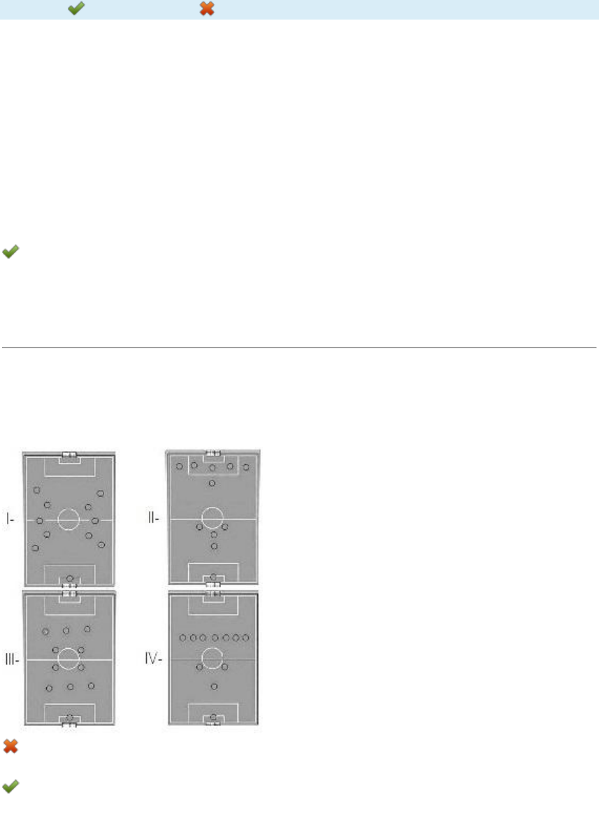 Disciplina: Metodologia do Ensino de Futsal e Futebol (LEF20) Avaliação: Avaliação II - Individual Semipresencial ( Cod.:460445) ( peso.:1,50) Prova: 13221223 Nota da Prova: 9,00 Legenda: Resposta Certa Sua Resposta Errada Parte superior do formulário 1. O modelo de jogo adotado por uma equipe de futebol durante a partida é elaborado levando em consideração diversos componentes. Dentre esses componentes incluímos os princípios táticos. Sobre os princípios táticos, classifique V para as opções verdadeiras e F para as falsas: ( ) Operacionais. ( ) Atitudinais. ( ) Gerais. ( ) Fundamentais. Assinale a alternativa que apresenta a sequência CORRETA: a) V - F - V - V. b) V - V - F - V. c) V - V - F - F. d) F - F - V - F. 2. Ao longo dos anos, a preocupação em defender no futebol foi aumentando, e os sistemas táticos ofensivos deram espaço às novas variações e formações táticas mais defensivas. Um dos esquemas responsáveis por essa revolução tática foi o W.M. Sobre o sistema apresentado por W.M., assinale a alternativa CORRETA: a) Somente a opção I está correta. b) Somente a opção II está correta. c) Somente a opção III está correta. d) Somente a opção IV está correta. 3. Durante toda a partida de futebol, as jogadas são construídas buscando a finalização no gol adversário. A finalização é um fundamento de extrema importância no processo de ensino do jogo. Sobre a finalização no futebol, analise as sentenças a seguir: I- A finalização poderá ser aérea ou rasteira. II- A finalização pode ser classificada em curta e de média distância. III- A finalização ocorre apenas em chutes de longa distância. IV- O cabeceio é uma forma de finalização. Assinale a alternativa CORRETA: a) As sentenças I, II e III estão corretas. b) As sentenças II e III estão corretas. c) As sentenças III e IV estão corretas. d) As sentenças I, II e IV estão corretas. 4. Embora as modificações nos padrões táticos ao longo do tempo tenham impulsionado o surgimento de novos esquemas de jogo das equipes, muitos treinadores se mantiveram conservadores utilizando esquemas táticos comuns desde os anos 60. Assinale a alternativa CORRETA que apresenta o esquema demonstrado na figura a seguir: a) 4 x 3 x 3 b) 4 x 2 x 4 c) 4 x 5 x 1 d) 4 x 4 x 2 5. No futebol, os esquemas táticos (ou formações) são as formas de um treinador escalar sua equipe dentro de campo. Os anos iniciais do futebol foram marcados por equipes que se destacavam pelo grande poder ofensivo e a quantidade expressiva de gols a favor. Assinale a alternativa CORRETA que apresenta um esquema tático ofensivo: a) Somente a opção IV está correta. b) Somente a opção I está correta. c) Somente a opção III está correta. d) Somente a opção II está correta. 6. Ao longo dos anos, o futebol sofreu inúmeras transformações com relação ao sistema tático das equipes. A principal delas foi a diminuição no número de jogadores no ataque. Assinale a alternativa CORRETA que apresenta um dos principais fatores responsáveis por essas transformações: a) Aumento nos salários dos jogadores. b) Mudanças nas regras. c) Construção de novos estádios. d) Melhorias nos gramados. 7. Uma defesa sólida é fundamental para o bom desempenho da equipe durante a partida. Para isso, é necessário treinamento e a escolha do melhor sistema defensivo, de acordo com as características das equipes. Sobre os tipos de marcação, associe os itens, utilizando o código a seguir: I- Sistema de marcação individual. II- Sistema de marcação em zona. III- Sistema de marcação mista. ( ) Sistema utilizado quando a equipe tem menor potencial técnico e físico do que a adversária. ( ) Sistema que alterna o tipo de marcação em diferentes momentos da partida e locais da quadra. ( ) Sistema recomendado nas categorias de iniciação devido à facilidade de execução e compreensão. ( ) Cada jogador deve marcar um adversário específico e acompanhá-lo em quadra. Assinale a alternativa que apresenta a sequência CORRETA: a) II - I - II - III. b) II - III - I - I. c) I - II - III - I. d) III - II - I - II. 8. O padrão de jogo no futsal está diretamente relacionado aos deslocamentos, diferentes movimentações dos jogadores em quadra, trocas de posições e tem como objetivo confundir a marcação da equipe adversária. Para a escolha de um padrão de jogo, é necessário levar em consideração alguns aspectos. Sobre esses aspectos, analise as sentenças a seguir: I- A qualidade técnica dos jogadores. II- A perna com a qual o atleta realiza as finalizações. III- O equipamento utilizado pelos jogadores. Assinale a alternativa CORRETA: a) As sentenças I e II estão corretas. b) Somente a sentença III está correta. c) As sentenças I e III estão corretas. d) As sentenças II e III estão corretas. 9. Antes do início do jogo, o professor conversa com os jogadores de sua equipe (preleção), visando motivá-los e prepará-los mentalmente para o embate. Após este momento, os atletas iniciam o trabalho de aquecimento e, posteriormente, após tomar ciência da escalação adversária, os atletas recebem as últimas orientações quanto ao posicionamento em campo. Com relação aos principais aspectos envolvidos em uma partida de futebol, assinale a alternativa CORRETA: a) Físico, técnico e motor. b) Administrativo, técnico e tático. c) Psicológico, físico e tático. d) Psicológico, organizacional e tático. 10. Os princípios gerais são comuns tanto na fase ofensiva, quanto na fase defensiva do jogo. Entretanto, os princípios fundamentais da defesa e do ataque apresentam particularidades entre si. Com relação aos princípios táticos fundamentais de ataque, associe os itens, utilizando código a seguir: I- Infiltração. II- Mobilidade. III- Cobertura ofensiva. ( ) Garantir linhas de passe ao portador da bola em apoio ofensivo. ( ) Movimento do portador da bola em direção ao gol adversário 