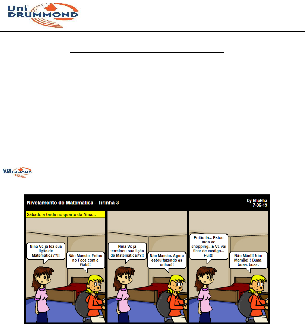 NIVELAMENTO DE MATEMÁTICA APRESENTAÇÃO DO NIVELAMENTO Prezado Aluno, o objetivo do Nivelamento de Matemática é permitir que Você: 1 - Possa fazer o acompanhamento de seus estudos na graduação com maior facilidade; 2 - Relembrar tópicos básicos de Matemática aprendidos nos ensinos fundamental e médio que são de uso do nosso dia a dia; 3 - Preparar de forma preliminar o aluno que pretenda participar de Concursos Públicos ou Processos Seletivos em organizações privadas, pois os exemplos e exercícios contidos nesse Nivelamento compõe os conteúdos básicos das Provas de Concursos e visam aumentar suas chances nessas formas de empregabilidade. 4 - Nas Referências Bibliográficas no final dessa aula Vc encontrará livros específicos com mais Exercícios de Concursos Públicos. É O UNIDRUMMOND PENSANDO NO SEU FUTURO BOA AULA !!!! AULA : 3 Valor Numérico de Expressões Algébricas Nesse tópico faremos uma breve recordação de cálculos de valores numéricos de uma expressão algébrica, como se fosse uma fórmula (Lei ou um Conjunto de Ordens a serem seguidas), utilizando os conceitos básicos de operações matemáticas e prioridades de operações que inclusive foram abordadas em aulas anteriores desse mesmo nivelamento. Exemplos: - Calcular o valor de y da expressão conhecendo-se o valor de x. 𝒚 = 𝒙𝟐 − 𝒙 + 𝟑 𝒑𝒂𝒓𝒂 𝒙 = 𝟏 33113112 yyy Para a resolução da expressão algébrica do exemplo, substituiu-se o valor de 𝑥 = 1 na expressão e procedeu-se os cálculos respeitando a prioridade da operação de potência 𝑥2 sobre as demais operações. CENTRO UNIVERSITÁRIO CARLOS DRUMMOND DE ANDRADE - Calcular o valor de y da expressão conhecendo-se o valor de x. 𝒚 = (𝒙𝟐 − 𝒙) × 𝟑 𝒑𝒂𝒓𝒂 𝒙 = 2 𝑦 = (22 − 2) × 3 ⇒ 𝑦 = (4 − 2) × 3 ⇒ 𝑦 = 6 Nesse exemplo observa-se a precedência do par de parênteses, ou seja, resolve-se inicialmente a operação interna aos parênteses (Colchetes ou Chaves) e posteriormente a operação de multiplicação. - Calcular o valor de y da expressão conhecendo-se o valor de x. 𝒚 = 𝟏 √𝒙 + 𝟐 × √𝒙 + 𝟕 𝒑𝒂𝒓𝒂 𝒙 = 𝟗 𝑦 = 1 √9 + 2 × √9 + 7 = 1 3 + 2 × √16 = 1 3 + 2 × 4 = 1 3 + 8 = 1+24 3 = 25 3 ⇒ 𝑦 = 25 3 - Calcular o valor de y da expressão conhecendo-se o valor de x. 𝒚 = {[(𝒙 − 𝟏) × 𝟐] + 𝟏} + 𝟐 𝒑𝒂𝒓𝒂 𝒙 = 𝟐 ⇒ 𝑦 = {[(2 − 1) × 2] + 1} = {[1 × 2] + 1} = {2 + 1} = 3 ⇒ 𝑦 = 3 REFERÊNCIAS BIBLIOGRÁFICAS OBS: Os e-Books mencionados nas bibliografias estão disponíveis no Acervo Digital da Instituição (Biblioteca Digital Pearson) e os Livros nas Bibliotecas Físicas da Unidades. BIBLIOGRAFIA BÁSICA 1. OLIVEIRA; Carlos Alberto Maziozeki de, Matemática, Curitiba, Editora InterSaberes, Coleção EJA: Cidadania Competente, Vol.06, 2016. [e-Book] 2. MACEDO; Luiz Roberto Dias de, Tópicos de Matemática Aplicada, Curitiba: InterSaberes, 2013. [e-Book] 3. COELHO; Murilo Oliveria de Castro, Matemática, São Paulo: Rideel, Série Rapidinhas de Concursos, 2013. [e-Book] BIBLIOGRAFIA COMPLEMENTAR 1. BONAFINI; Fernanda Cesar (Org.), Matemática e Estatística, São Paulo: Pearson Education do Brasil, Série Bibliográfica Universitária Pearson, 2014. [e-Book] 2. BARROS; Dimas Monteiro de, Matemática Financeira Descomplicada, 5ºed., São Paulo: Rideel, Concurso Descomplicada, 2014. [e-Book] 3. IEZZI; Gelson, Matemática e Realidade: 6ª ano: Ensino Fundamental, 8ºed. reform, São Paulo: Atual, 2013. [Livro] 4. IEZZI; Gelson, Matemática e Realidade: 7ª ano: Ensino Fundamental, 8ºed. reform, São Paulo: Atual, 2013. [Livro] 5. IEZZI; Gelson, Matemática e Realidade: 8ª ano: Ensino Fundamental, 4ºed. reform, São Paulo: Atual, 2000. [Livro]