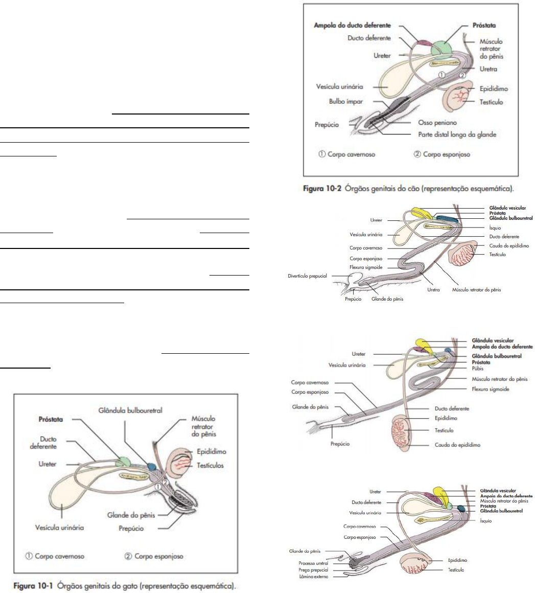 ÓRGÃOS GENITAIS MASCULINOS 24/10/2019 O sistema genital masculino compreende os órgãos envolvidos no desenvolvimento, no amadurecimento, no transporte e no armazenamento dos gametas masculinos. Ele consiste em um par de testículos, o ducto contorcido do epidídimo, o ducto deferente, a uretra e as glândulas genitais acessórias. Os testículos produzem esperma e hormônios. O epidídimo armazena espermatozoides durantes seu amadurecimento antes de passarem para o ducto deferente e pela uretra. As glândulas acessórias também liberam suas secreções na uretra e contribuem para o volume do sêmen. A parte distal da uretra forma o caminho combinado para a passagem tanto da urina como do sêmen. O pênis é o órgão copulador masculino e deposita sêmen no trato reprodutor feminino. (cachaço/porco) (touro) (garanhão) Testículos Os testículos, ou gônadas masculinas, são órgãos pares, os quais se originam embriologicamente do primórdio gonadal na face medial do mesônefro na região lombar, de modo semelhante aos ovários nas fêmeas. Em um estágio posterior de desenvolvimento embriológico, as gônadas masculinas migram de sua posição de desenvolvimento dentro da cavidade abdominal para o processo vaginal, coberto pelo escroto. Esse processo é denominado descida dos testículos e depende do gubernáculo dos testículos, o qual é um cordão mesenquimal envolvido em peritônio que se prolonga dos testículos pelo canal inguinal até o processo vaginal. Na primeira fase da descida dos testículos, o gubernáculo aumenta de comprimento e diâmetro, expandindo-se para além do canal inguinal e, dessa forma, dilatando-o. Durante a segunda fase, ele retrocede, acomodando os testículos dentro do processo vaginal. O processo de migração dos testículos é o resultado de aumento da pressão intra-abdominal e da tração do gubernáculo, que conduz os testículos em direção à região inguinal. No garanhão e no cachaço, as fibras do gubernáculo se prolongam na camada profunda do escroto, fato de importância clínica, já que a tração do escroto pode ajudar a expor testículos retidos no canal inguinal. A descida testicular é vital para a produção dos gametas masculinos nos mamíferos domésticos, já que a posição do escroto reduz a temperatura dos testículos em comparação à temperatura corporal. A impossibilidade de um ou de ambos os testículos realizarem a descida testicular se chama criptorquidismo e acredita-se que se trate de uma condição hereditária. Portanto, criptorquídeos não devem ser usados para reprodução. Estrutura do testículo A superfície do testículo é revestida por uma cápsula fibrosa densa com 1 a 2 mm de espessura (túnica albugínea), a qual é composta de fibras colágenas e contem vasos sanguíneos maiores visíveis na superfície dos testículos em um padrão característico de cada espécie. A túnica vaginal visceral é uma membrana serosa com o peritônio que cobre a cápsula fibrosa e confere uma aparência lisa da superfície testicular. O parênquima do testículo normalmente se encontra sob pressão. Consequentemente, qualquer expansão significativa eleva a pressão intratesticular e produz dores graves como a que se observa durante inflamação (orquite). Os componentes de tecido conectivo do testículo se dispõem da maneira a seguir, do exterior para o interior: cápsula fibrosa (túnica albugínea); septos; e mediastino. A cápsula emite septos que se irradiam para dentro do testículo, dividindo o parênquima em lóbulos piramidais. Esses septos convergem centralmente para formar o mediastino do testículo. Esse mediastino pode ser axial ou ligeiramente deslocado em direção ao epidídimo. O parênquima do testículo compõe-se de: túbulos seminíferos contorcidos; túbulos seminíferos retos; rede do testículo; e ductos eferentes. Cada lóbulo testicular inclui de dois a cinco túbulos contorcidos, onde ocorre a espermatogênese. A parede desses túbulos contém células espermatogenéticas e células de sustentação (células de Sertoli), as quais possuem propriedades de sustentação e de produção de hormônios. Cada túbulo seminífero contorcido apresenta forma de alças, de modo que se abre em uma rede de túbulos confluentes dentro do mediastino, chamada de rede do testículo. Antes de penetrar a rede do testículo, as extremidades dos túbulos seminíferos ficam retas para se tornarem os túbulos seminíferos retos. O tecido intersticial que preenche esse espaço entre os túbulos contém células de Leydig, as principais produtoras dos hormônios esteroides androgênicos como a testosterona. Cada rede do testículo é drenada por oito a doze ductos eferentes contorcidos que perfuram a cápsula fibrosa para penetrar na cabeça do epidídimo. Epidídimo O epidídimo está firmemente anexado ao testículo e consiste em rolos de túbulos contorcidos alongados, cuja união é mantida por tecido conectivo. Ele é dividido em cabeça, corpo e cauda. A cabeça do epidídimo está firmemente fixada à capsula testicular e recebe os ductos eferentes do testículo. Imediatamente após penetrar o epidídimo, os ductos eferentes se unem para formar o ducto do epidídimo. Os ductos contorcidos formam o corpo do epidídimo, mantido no lugar por uma camada dupla de serosa. O espaço entre o corpo do epidídimo e o testículo é denominado bolsa testicular. O ducto do epidídimo prossegue até a cauda do epidídimo. Ela se fixa à extremidade caudada do testículo pelo ligamento próprio do testículo e ao processo vaginal pelo ligamento da cauda do epidídimo. O ducto do epidídimo emerge em sua cauda e prossegue na forma de ducto deferente. No ducto do epidídimo, os espermatozoides amadurecem, o fluido testicular é absorvido, os fragmentos celulares sofrem fagocitose e os nutrientes para os espermatozoides são secretados. Os espermatozoides são armazenados na cauda do epidídimo até o momento da ejaculaçã