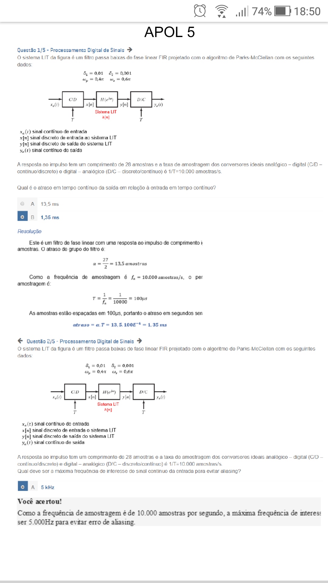 O sistema LIT da figura e um filtro passa baixas de fase linear FIR projetado com algoritmo de Parks-McClellan com os seguintes dados: 0.01 0,001 0,47 CID DIC y[n] y,() Sistema LIT T sinal continuo de entrada x[n] sinal discreto de entrada ao sistema LIT y[n] sinal discreto de safda do sistema LIT ya(t) sinal continuo de salda A resposta ao impulso tem um comprimento de 28 amostras e a taxa de amostragem dos conversores ideais analogico - digital (C/D - continuoldiscreto) e digital - analogico (D/C discreto/continuo) 6 1/T=10.000 amostras/s. Qual e atraso em tempo continuo da saida em relacao a entrada em tempo continuo? A 13,5 ms B 1,35 ms