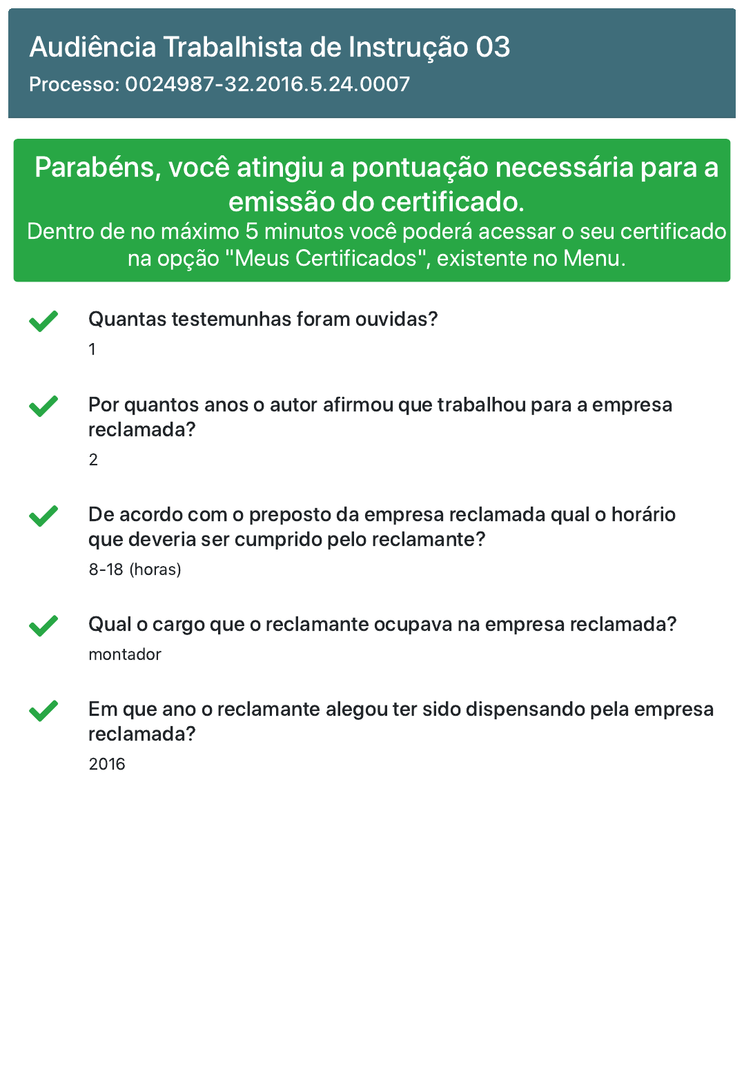 Audiência Trabalhista de Instrução 03 Processo: 0024987-32.2016.5.24.0007 Parabéns, você atingiu a pontuação necessária para a emissão do certificado. Dentro de no máximo 5 minutos você poderá acessar o seu certificado na opção "Meus Certificados", existente no Menu. Quantas testemunhas foram ouvidas? 1 Por quantos anos o autor afirmou que trabalhou para a empresa reclamada? 2 De acordo com o preposto da empresa reclamada qual o horário que deveria ser cumprido pelo reclamante? 8-18 (horas) Qual o cargo que o reclamante ocupava na empresa reclamada? montador Em que ano o reclamante alegou ter sido dispensando pela empresa reclamada? 2016