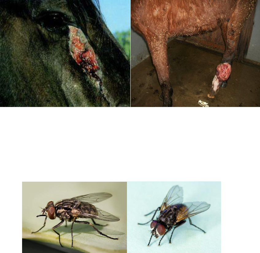 PELE HABRONEMOSE Conhecida também por doença do verão, pois é nessa época onde tem o aumento do número de casos devido a presença de moscas no ambiente. Lesões causadas pelas larvas do habronema sp. E Drashia megastoma. Os vetores são a musca domestica e stomyx calcitrans. As lesões ocorrem principalmente na carúncula do olho e região do boleto • Doença que causa granulomas devido a presença da larva na região afetada • As regiões afetadas são aquelas que o cavalo tem dificuldade para espantar as moscas • Causa intensa prurido fazendo com que o animal faça automutilação • Lesão de evolução rápida (15 dias) Stomyx calcitrans mosca doméstica DIAGNÓSTICO: • Quando suspeitamos de habronemose devemos começar o tratamento imediato • Se for histopatológico tentar coletar a larva. • O diagnóstico se dá pela epidemiologia, sítio da lesão, tipo de lesão e histopatológico. TRATAMENTO • IVERMECTINA: 0.2 mg/kg IM, que é o tratamento de escolha(SMITH, 1994). Eliminar o parasita • POMADA ORGANOFOSFORADA: (triclorsil® pó) aplicar diretamente na lesão após lavar juntamente com Ricinus® (pomada recuperadora de pele) e aplicar Unguento Vansil® para ação repelente. Também no dia realizar a aplicação de Triclorsil pasta® 1g/50 kg • CORTICÓIDE: dexametasona ou prednisolona 0,3 ml ao redor de toda a lesão. Ricinus triclorsil unguento vansil Ivermectina PREVENÇÃO: • O principal é controlar o vetor. A forma mais viável é fazendo uso de repelentes em feridas abertas (Max Prata).] • A presença de fezes é um atrativo para as moscas. Portanto, a correta higienização de baias e piquetes é essencial. • Identificar os fatores causadores de lesões nos animais, e realizar o devido manejo ambiental, ajuda a minimizar a infestação de moscas.
