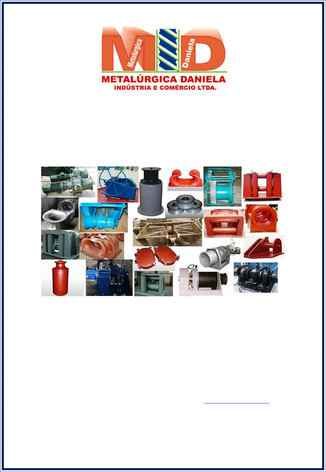 EQUIPAMENTOS DE CONVÉS, ATRACAÇÃO, REBOQUE E FUNDEIO METALÚRGICA DANIELA INDUSTRIA E COMÉRCIO LTDA - Rua Alfa, 299 - Bairro do Una - Itaquaquecetuba - São Paulo Tel: 4644-2969 / 4644-2977 / 4644-2789 / Fax: (11) 4645-1008 - Rua República do Equador 100 Sala 21 – Ponta da Praia – Santos – SP CEP 11030-151 E-mail: metalurgicadaniela@metalurgicadaniela.ind.br Home page: www.metalurgicadaniela.ind.br BUZINA PANAMÁ PARA FIXAÇÃO EM BORDA FALSA ABNT/NBR 6754 (DIN 81915) - Tolerâncias de dimensões segundo NBR 6645 grau de tolerância GTA3. - Material : Aço fundido NBR 6313 AF 4220 com teor máximo de carbono de 0.23%, ou aço inoxidável AISI 316L - Acabamento : Proteção anticorrosiva com shop primer - A buzina de tamanho nominal igual a 320 está de acordo com o Regulamento do Canal do Panamá parte 109-6 para buzina simples. - A buzina de tamanho nominal igual a 400 está de acordo com o Redulamento do canal do Panamá parte 109-6 para buzina dupla. Size b1 b2 e f h1 h2 h3 l1 r1 r2 s1 s2 w1 w2 Weight mm mm mm mm mm mm mm mm mm mm mm mm mm mm Kg 125 250 175 125 15 160 65 20 285 80 45 10 5 125 90 22 160 315 225 157.5 18 200 70 25 360 100 57.5 12 6 160 115 32 200 390 275 195 21 250 75 32 450 125 70 14 7 200 140 49 250 480 340 240 24 300 80 38 550 150 90 16 8 250 180 74 320 585 415 292.5 27 360 90 45 680 180 112.5 18 9 320 225 120 400 710 500 355 30 440 110 55 840 220 135 20 10 400 270 185 500 840 595 420 33 520 130 65 1020 260 160 22 11 500 320 285 600 1100 800 550 0 700 150 80 1300 350 200 35 20 600 400 795 BUZINA PANAMÁ PARA FIXAÇÃO EM CONVÉS ABNT/NBR 6754 ( DIN 81915 ) - Tolerâncias de dimensões segundo NBR 6645 grau de tolerância GTA3. - Material : Aço fundido NBR 6313 AF 4220 com teor máximo de carbono de 0.23%, ou aço inoxidável AISI 316L - Acabamento : Proteção anticorrosiva com shop primer - A buzina de tamanho nominal igual a 320 está de acordo com o Regulamento do Canal do Panamá parte 109-6 para buzina simples. - A buzina de tamanho nominal igual a 400 está de acordo com o Regulamento do canal do Panamá parte 109-6 para buzina dupla. Size b1 b2 e f h1 h2 h3 l1 r1 r2 s1 s2 w1 w2 Weight mm mm mm mm mm mm mm mm mm mm mm mm mm mm Kg 125 250 175 125 15 160 65 20 285 80 45 10 5 125 90 22 160 315 225 157.5 18 200 70 25 360 100 57.5 12 6 160 115 32 200 390 275 195 21 250 75 32 450 125 70 14 7 200 140 49 250 480 340 240 24 300 80 38 550 150 90 16 8 250 180 74 320 585 415 292.5 27 360 90 45 680 180 112.5 18 9 320 225 120 400 710 500 355 30 440 110 55 840 220 135 20 10 400 270 185 500 840 595 420 33 520 130 65 1020 260 160 22 11 500 320 285 600 1100 800 550 0 700 150 80 1300 350 200 35 20 600 400 795 BUZINA DE REBOQUE TRIANGULAR Buzina de roboque triangular para montagem em antepara. - Material : Aço fundido NBR 6313 AF 4220 com teor máximo de carbono de 0.23%, ou aço inoxidável AISI 316L - Acabamento : Proteção anticorrosiva com shop primer Size a b c d e Weight mm mm mm mm mm Kg 400 400 500 700 800 550 380 348 348 388 860 900 506 513 420 420 440 730 800 560 608 430 430 580 680 830 588 741 BUZINA ABERTA PARA FIXAÇÃO EM CONVÉS ABNT/NBR 6754 ( DIN 81915 ) Buzina aberta para fixação em convés. - Material : Aço fundido NBR 6313 AF 4220 com teor máximo de carbono de 0.23%, ou aço inoxidável AISI 316L - Acabamento : Proteção anticorrosiva com shop primer Size b c h h1 l r r1 r2 r3 r4 s s1 w w1 Weight mm mm mm mm mm mm mm mm mm mm mm mm mm mm Kg 35 75 25 54 16 150 12 75 15 40 40 10 10 72 35 2.2 45 90 30 66 18 190 16 90 20 55 47 10 10 92 45 3.6 55 105 35 72 20 230 23 105 25 60 54 12 10 100 55 5.4 70 120 40 96 21 280 29 125 30 95 62 14 10 125 70 7.3 90 140 50 128 23 350 40 160 40 115 75 16 12 160 90 14 110 160 63 154 25 430 50 180 55 145 90 18 12 200 110 25 180 220 100 244 40 680 80 250 70 230 125 22 16 320 180 85 PONTO DE REBOQUE ( SMIT BRACKET ) TIPO OCIMF Utilizado como ponto de fixação para reboque de emergência ou ancoragem em ponto único. Opcionalmente pode ser fabricado em aço inoxidável Atende as recomendações do OCIMF ( Oil Companies International Marine Forum ) Nominal Ø mm a b c d e f h s Weight SWL mm mm mm mm mm mm mm mm Kg KN 54 720 650 115 75 100 205 30 118 22 1000 76 900 800 160 110 150 240 30 170 32 2000 84 1018 905 170 120 160 273 35 210 49 2500 95 1120 940 195 135 170 290 40 276 74 3000 BUZINA DE ROLETES PADRÃO JIS F 2026 – 4 ROLETES Buzina de roletes padrão JIS F 2026 com 4 roletes. Mancais autolubrificantes - dispensa manutenção com graxa ou óleo. Fornecida pintada com uma demão de shop- primer, pronta para ser instalada. Pode ser fabricada em aço inoxidável. Nominal b d1 d2 d3 H h1 L l1 Open Wire rope SWL Weight Ø mm mm mm mm mm mm mm mm mm size Ø mm KN Kg 140 355 140 120 80 542 275 805 335 148 x 195 18 120 214 160 405 160 140 90 584 290 890 365 149 x 197 22.4 170 307 180 455 180 150 100 636 315 960 390 148 x 196 25 240 411 200 505 200 160 110 680 330 1049 420 150 x 226 28 280 568 250 610 250 210 130 824 415 1303 520 194 x 247 35 460 1000 315 715 315 275 150 998 420 1562 620 260 x 295 42 600 1624 BUZINA DE ROLETES PADRÃO JIS F 2026 – 5 ROLETES Buzina de roletes padrão JIS F 2026 com 4 Mancais autolubrificantes – dispensa manutenção com graxa ou óleo. Fornecida pintada com uma demão de shop-primer, pronta para ser instalada. Pode ser fabricada em aço inoxidável Nominal b d1 d2 d3 H h1 l l1 Open Wire rope SWL Weight Ø mm mm mm mm mm mm mm mm mm size Ø mm KN Kg 140 390 140 120 80 542 275 805 335 148 x 195 18 120 246 160 460 160 140 90 584 290 890 365 149 x 197 22.4 170 370 180 525 180 150 100 636 315 960 390 148 x 196 25 240 517 200 583 200 160 110 680 330 1049 420 150 x 226 28 280 680 250 701 250 210 130 824 415 1303 520 194 x 247 35 460 1234 315 824 315 275 150 998 420 1562 620 260 x 29542 600 2153 RETORNO DE RODETE PADRÃO DIN 81906 Retorno de rodete padrão DIN 81906 construído em aço fundido GG26 (DIN 1691) ou aço inoxidável AISI 316L Eixo de aço inoxidável 316L e buchas de bronze auto
