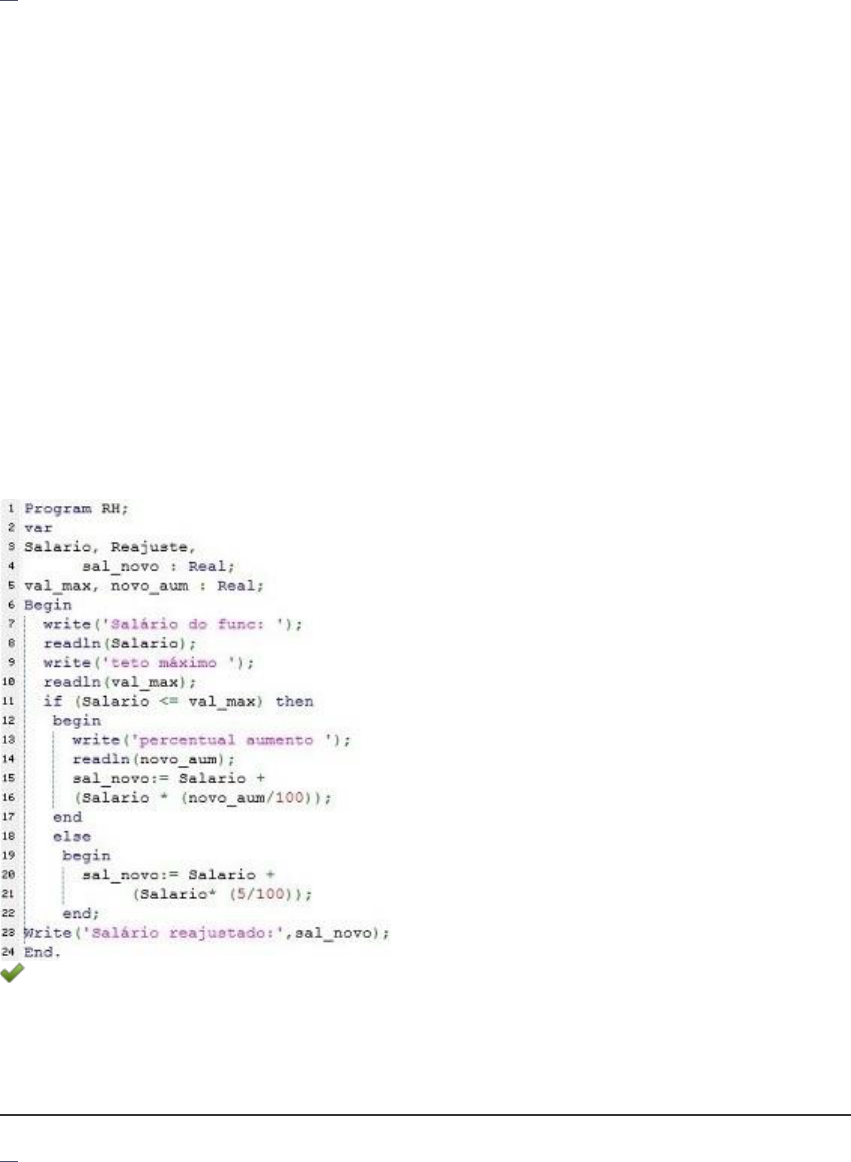1. O departamento de recursos humanos precisa aumentar o salário de todos os funcionários de acordo com a seguinte regra: * O programa deve informar o salário do funcionário; * Deve solicitar um valor máximo, chamado de teto salarial. * Se o salário do funcionário for menor ou igual ao salário teto, deve-se solicitar um percentual de aumento, senão o aumento será fixado em 5%. * Ao final, apresentar uma mensagem com o salário já reajustado. Analise o código e classifique V para as sentenças verdadeiras e F para as falsas: ( ) O programa poderia ter criado uma constante para receber o valor de aumento 5%. ( ) O programa só funciona para um funcionário de cada vez. ( ) A linha 17 está com erro, pois falta o ";". ( ) O programa está correto e atende ao solicitado. ( ) O programa tem variáveis que não são utilizadas, por isso o programa dá erro e não executa. Assinale a alternativa que apresenta a sequência CORRETA: a) V - V - F - V - F. b) F - F - V - V - F. c) V - F - F - F - F. d) F - V - F - V - V. 2. A decomposição de um problema é fator determinante para a redução da complexidade. Com base nisso, surgem os subalgoritmos, que são trechos de programas que podem ser utilizados dentro de um programa maior, sempre que necessário ou conveniente. Permite, desta forma, focalizar a atenção em um problema pequeno de cada vez, o que ao final produzirá uma melhor compreensão do todo. Diante do exposto, analise as sentenças a seguir: I- Os subalgoritmos podem ser do tipo função ou procedimento, sendo que o segundo sempre retornará um valor para o algoritmo que o chamou. II- Um subalgoritmo pode receber parâmetros, que são valores advindos de outro algoritmo. III- Um algoritmo somente poderá realizar a chamada de um tipo de subalgoritmo. IV- Os parâmetros utilizados no algoritmo principal, no ato da chamada da função, devem manter uma correspondência (número, ordem e tipo) com os parâmetros definidos na função. Assinale a alternativa CORRETA: a) As sentenças I e III estão corretas. b) As sentenças II e IV estão corretas. c) As sentenças I, II e III estão corretas. d) Somente a sentença III está correta. 3. Os operadores são aplicados dentro dos algoritmos sempre que se quer fazer uma operação matemática, relacional ou lógica entre duas ou mais informações. Apesar de cada linguagem de programação empregar sua própria sintaxe para representar os operadores, a operação que eles representam e o resultado obtido não muda, o que facilita sua representação através dos algoritmos. Com relação aos operadores matemáticos, relacionais e lógicos, classifique V para as sentenças verdadeiras e F para as falsas: ( ) O operador DIV nos traz a parte inteira do resultado de uma divisão. ( ) Para x=5 e y=10, x MOD y retorna o valor 0. ( ) Em uma operação do tipo E, todos os operandos devem ser verdadeiros para que o resultado seja verdadeiro. ( ) A expressão "(4<=10) ou (5>8)" tem como resultado o valor FALSO. ( ) O operador <> serve para verificar se dois valores são diferentes. Assinale a alternativa que apresenta a sequência CORRETA: a) V - F - V - F - V. b) F - V - F - V - F. c) V - V - F - V - V. d) V - F - V - F - F. 4. Os operadores aritméticos, relacionais e lógicos são de suma importância nas estruturas algorítmicas, já que possibilitam a realização de cálculos matemáticos e auxiliam na tomada de decisões através de comparações ou combinações, as quais resultarão um valor verdadeiro ou falso baseados em um quadro conhecido por tabela verdade. Considerando as seguintes atribuições: a=2, b=1, c=0, analise as expressões lógicas a seguir: I- (a > b) E (b >= c) = VERDADEIRO II- ((a - b) > c) OU (b = 1) = FALSO III- (a + b) >= (a + c) = FALSO IV- (a * c) <> (c * b) = FALSO V- (a mod 2 = 3) E (b * a = 3) = VERDADEIRO Assinale a alternativa CORRETA: a) As expressões II e V estão corretas. b) As expressões I, III e IV estão corretas. c) As expressões I, IV e V estão corretas. d) As expressões I e IV estão corretas. 5. Foi solicitada a criação de um algoritmo que faça a leitura de três notas, e apresente uma mensagem com a maior nota. Com base nisso, analise o algoritmo anexo e classifique V para as sentenças verdadeiras e F para as falsas: ( ) O algoritmo não funciona, pois não pode ordenar valores do tipo real. ( ) O algoritmo não funciona, pois as variáveis utilizadas não foram declaradas. ( ) O algoritmo não está com a lógica correta para o que foi solicitado. ( ) O algoritmo está certo e apresentará a maior nota de três. Assinale a alternativa que apresenta a sequência CORRETA: a) V - V - F - F. b) V - F - V - V. c) F - F - V - V. d) F - V - V - F. 6. Além da estrutura de seleção conhecida por Se-então, o desenvolvedor, em alguns casos mais simples, poderá fazer uso da estrutura Escolha-Caso, que possibilitará que o algoritmo tome caminhos diferentes baseado no valor de um identificador. Acerca da estrutura Escolha-Caso, classifique V para as sentenças verdadeiras e F para as falsas: ( ) Neste tipo de estrutura, é possível haver uma ou mais condições a serem testadas e um comando diferente associado a cada uma destas. ( ) O identificador poderá receber valores do tipo inteiro ou caractere. ( ) Se o valor informado pelo usuário não atender a nenhuma das condições estabelecidas na estrutura do Escolha-Caso, poderá executar um bloco de instruções no comando senão. ( ) Uma rotina desenvolvida na estrutura Escolha-Caso pode ser reescrita com a estrutura Se-então, sem prejuízo algum. ( ) A estrutura Escolha-Caso pode ser utilizada em qualquer situação em que houver a necessidade do algoritmo tomar caminhos diversos. Assinale a alternativa que apresenta a sequência CORRETA: a) V - F - F - V - F. b) F - V - F - F - V. c) V - V - V - V - F. d) F - F - V - F - V. 7. Por intermédio de instruções específicas, nós, como programadores, estabelecemos os passos que o comp