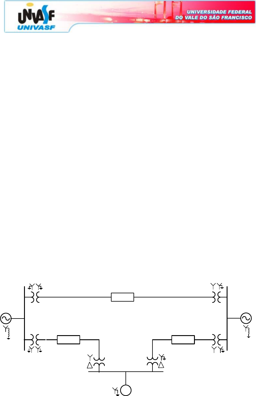 UNIVERSIDADE FEDERAL DO VALE DO SÃO FRANCISCO – UNIVASF COLEGIADO DE ENGENHARIA ELÉTRICA Disciplina: Sistemas Elétricos I Prof.: Dr. Adeon Cecilio Pinto Lista de Exercícios – Primeira Unidade 1. Faça o diagrama de impedâncias para o sistema de potências mostrado na figura a seguir. Dê as impedâncias em pu. Despreze a resistência e use a base de 50.000 kVA, 138 kV na linha de 40 ohms. As características dos geradores, motores e transformadores são: Gerador 1: 20.000 kVA; 13,2 kV; x” = 15% Gerador 2: 20.000 kVA; 13,2 kV; x” = 15% Motor síncrono M: 30.000 kVA; 6,9 kV; x” = 20% Transformadores trifásicos são: Trafos Y-Y: 20.000 kVA; 13,8 Y - 138 Y kV; x = 10%. Trafos Y-Δ: 15 MVA; 6,9 Δ - 138 Y kV; x = 10% Todos os transformadores são usados para elevar as tensões dos geradores aos valores das linhas de transmissão. T M 1Gerador 2Gerador Motor M Barra A Barra B Barra C 40j 20j 20j 1Linha 2Linha 3Linha 1T 2T 3T 4T 6T5T 2. Na figura a seguir, tem-se o diagrama unifilar de um sistema radial de transmissão trifásico. Os valores nominais e as reatâncias dos vários componentes são apresentados juntamente com as tensões nominais de linha dos transformadores. Uma carga de 50 MW, FP = 0,8 atrasado está ligada no barramento da subestação de 33 kV, que deverá ser mantido a 30 kV. Pede-se a tensão nos terminais da máquina síncrona. A linha e os trafos podem ser representados por reatâncias série. Obs.: Deve-se utilizar como potência base 100 MVA. V gerador =? 50 MVA 11/132 kV x=j0,10 pu 50 MVA 132/33 kV x=j0,12 pu 50 MW V carga =30 kV FP=0,8 indutivo j100 linha Resposta: 1,44 22,85geradorv pu= ou 15,84 22,85geradorV kV= para 11base geradorV kV− = 3. Um gerador trifásico de 300 MVA, 20 kV, tem uma reatância subtransitória de 20%. O gerador alimenta um certo número de motores síncronos através de uma linha de transmissão de 64 km, tendo transformadores em ambas as extremidades, conforme mostra o diagrama unifilar da figura abaixo. Os motores, todos de 13,2 kV, estão representados por dois motores equivalentes. O neutro do motor M1 está aterrado através de uma reatância. O neutro do segundo motor M2 não está aterrado (situação não usual). Os valores nominais dos motores são 200 MVA para M1 e 100 MVA para M2, ambos com 20% de reatância subtransitória (X”). O transformador trifásico T1, 350 MVA, 230/20 kV, apresenta reatância de 10%. O transformador T2 é composto de três transformadores monofásicos cada um de 100 MVA, 127/13,2 kV, com reatância de 10%. A reatância em série de linha é 0,5 Ω/km. Trace o diagrama de reatâncias com todos os valores em pu. Escolha os valores nominais do gerador como base (no circuito do próprio gerador). Além disso, se os motores M1 e M2 tiverem operando com potências 120 MVA e 60 MVA, respectivamente, a 13,2 kV, e ambos operarem com fator de potência unitário, determine a tensão nos terminais do gerador. linha 2M 1M2T1T Resposta: 0,983 13,20geradorv pu= ou 19,66 13,20geradorV kV= para i nos motores na referência e para 20base geradorV kV− = 4. As três partes de um sistema monofásico são designadas por A, B e C e estão interligadas por meio de transformadores, como mostra a figura a seguir. As características dos transformadores são: A B C3001:102 :1 -A B -B C A-B: 10MVA; 13,8 - 138 kV; reatância de dispersão: 10%: B-C: 10 MVA, 138 - 69 kV; reatância de dispersão: 8% Se as bases no circuito B forem 10 MVA, 138 kV, determine a impedância, por unidade, da carga resistiva de 300 , localizada no circuito C, referida a C, B e A. Faça o diagrama de impedâncias desprezando a corrente de magnetização, resistência dos transformadores e impedâncias da linha. Determine a regulação de tensão, se a tensão na carga for 66 kV, supondo que a tensão de entrada do circuito A, permaneça constante. Resposta: 0,63Carga-Cz pu= ; 476,1Carga-CZ = ; 0,63Carga-Bz pu= ; 1200Carga-BZ = ; 0,63Carga-Az pu= ; 12Carga-AZ = e % 3,97%Reg = 5. Considere o sistema de potência ilustrada na figura abaixo, operando com sequência de fase positiva, representado pelo diagrama unifilar. Calcule a tensão de linha na barra 1, sabendo-se que o transformador é composto por três transformadores monofásicos de 250 kVA , 12470 277V V e 5%eZ j= . A carga trifásica de 660 kVA , 480V e fator de potência igual a 0,88 atrasado. Y 3 250 12470 / 277 5%e trafos kVA V V Z j= 660 480 0,88 kVA V FP atrasado 2Barra1Barra Resposta: 1 1,02 27,83v pu= − ou 1 12719,4 27,83V V= − para 1 12470baseV V− = 6. Dado o sistema, calcule a corrente e potência aparente, em pu, para cada transformador e a tensão no lado da carga. Considere que a carga é representada por uma impedância constante de 14+j6 Ω por fase. Use uma tensão de base de 69 kV no lado de alta, uma tensão de base de 12,47 kV no lado de baixa, e uma potência base igual a potência do trafo 1. Além disso, Considere que a tensão de operação na fonte é de 70 kV e está na referência (zero grau). Trafo 1 Carga 69 kV - 12,47 kV 7500 kVA, =8%z Trafo 2 70,73 kV - 12,47 kV 3750 kVA, =8,5%z Resposta: 1 0,293 14,13Ti pu= − ; 2 0,714 32,27Ti pu= − ; 0,976 3,80cargav pu= − ; 1 0,697 28,47Ts pu= e 2 0,286 10,33Ts pu=